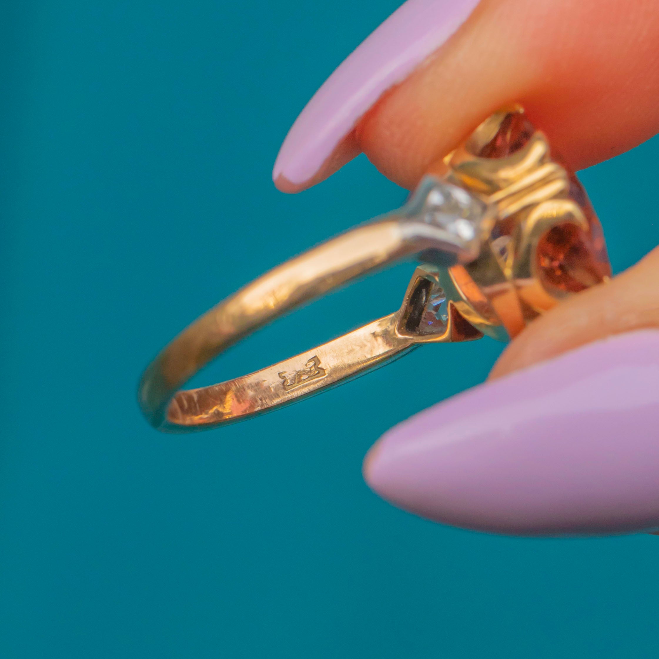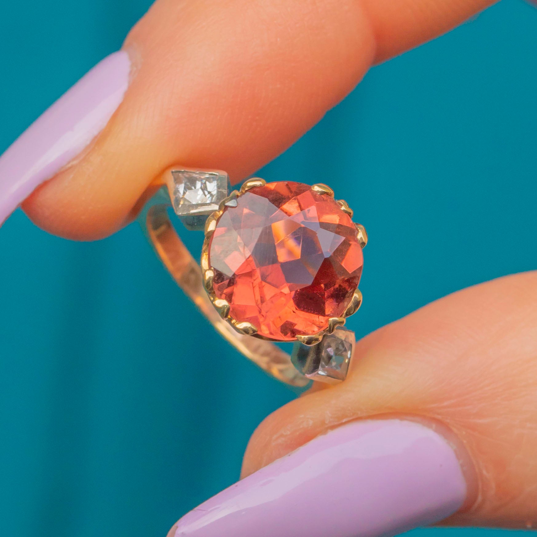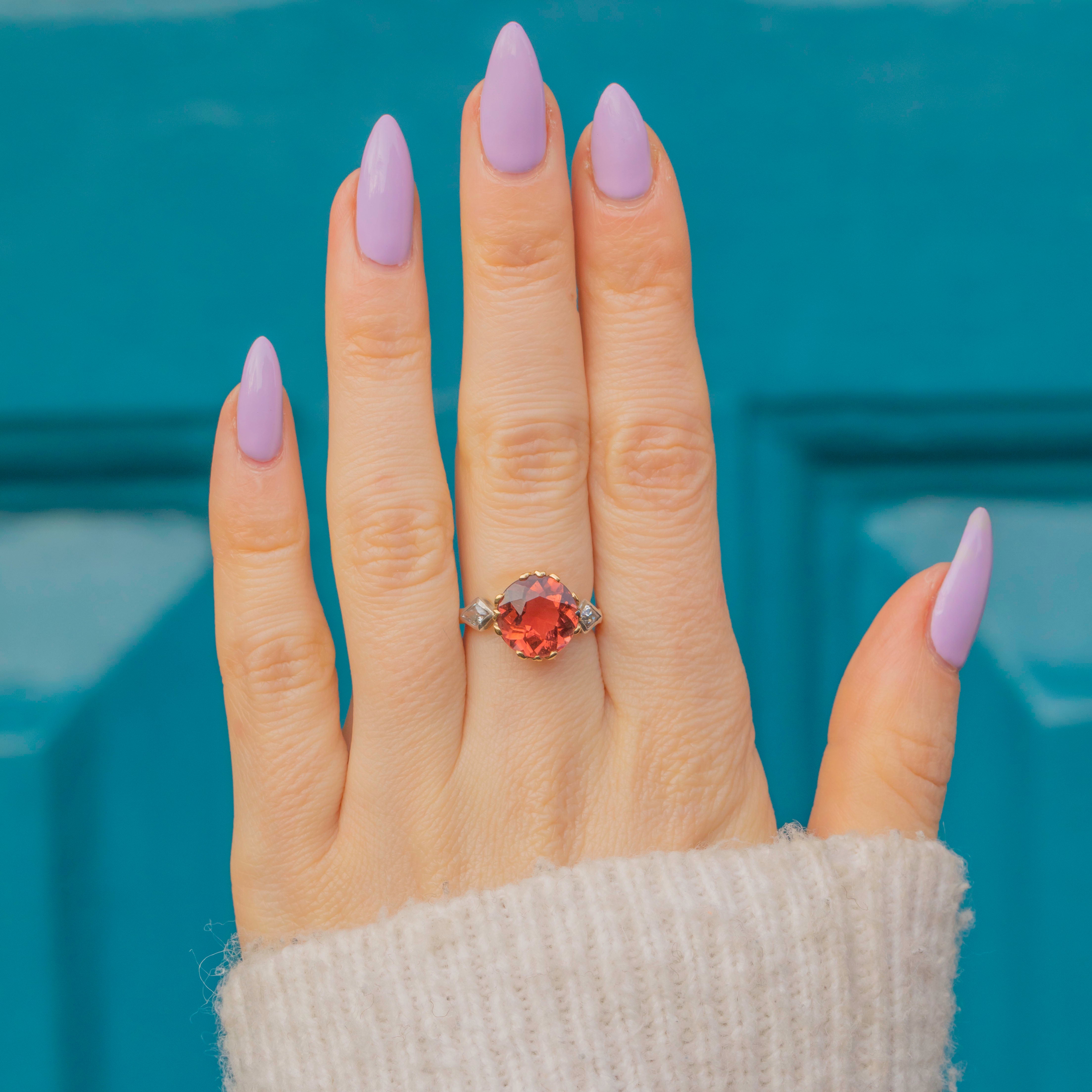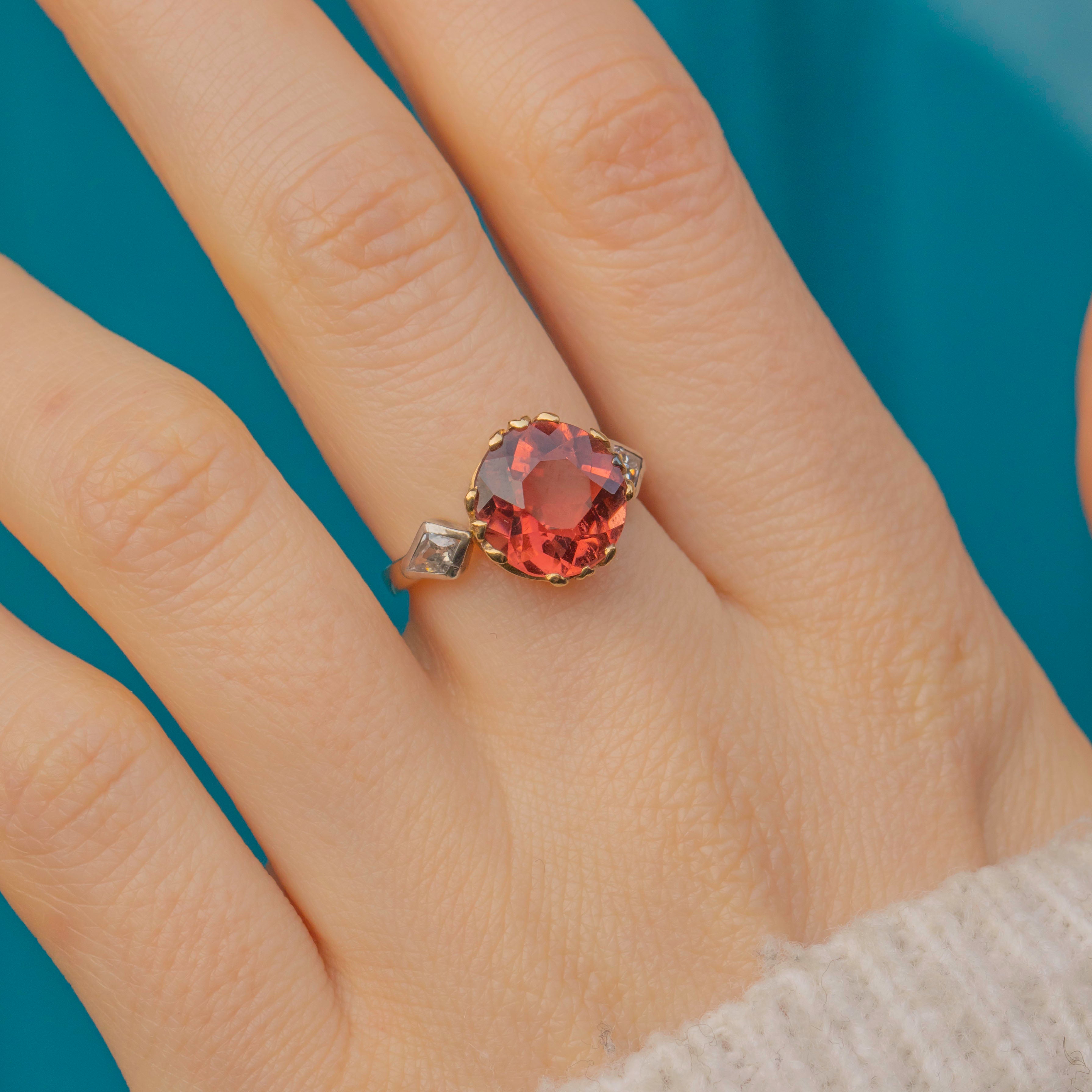 This outstanding antique 18ct Gold Tourmaline Diamond three stone ring will instantly bring the wow factor to your outfit! As it moves in the light, the impressive 3.00ct red Tourmaline displays spectacular hues of crimson and burnt orange that dance across its crisp, hand-cut facets, flanked by Diamond shoulders that allow the gemstone trilogy to span the width of your finger.