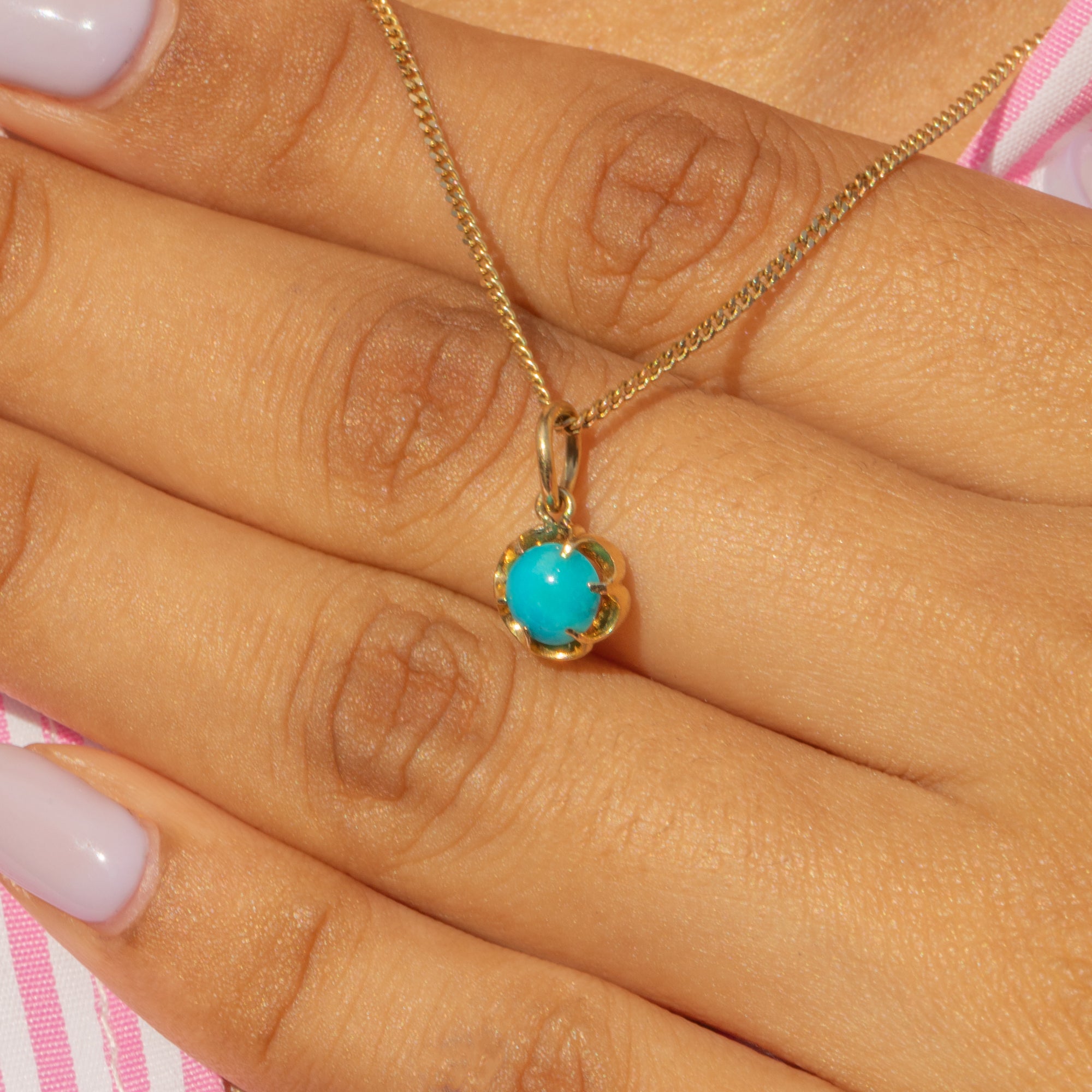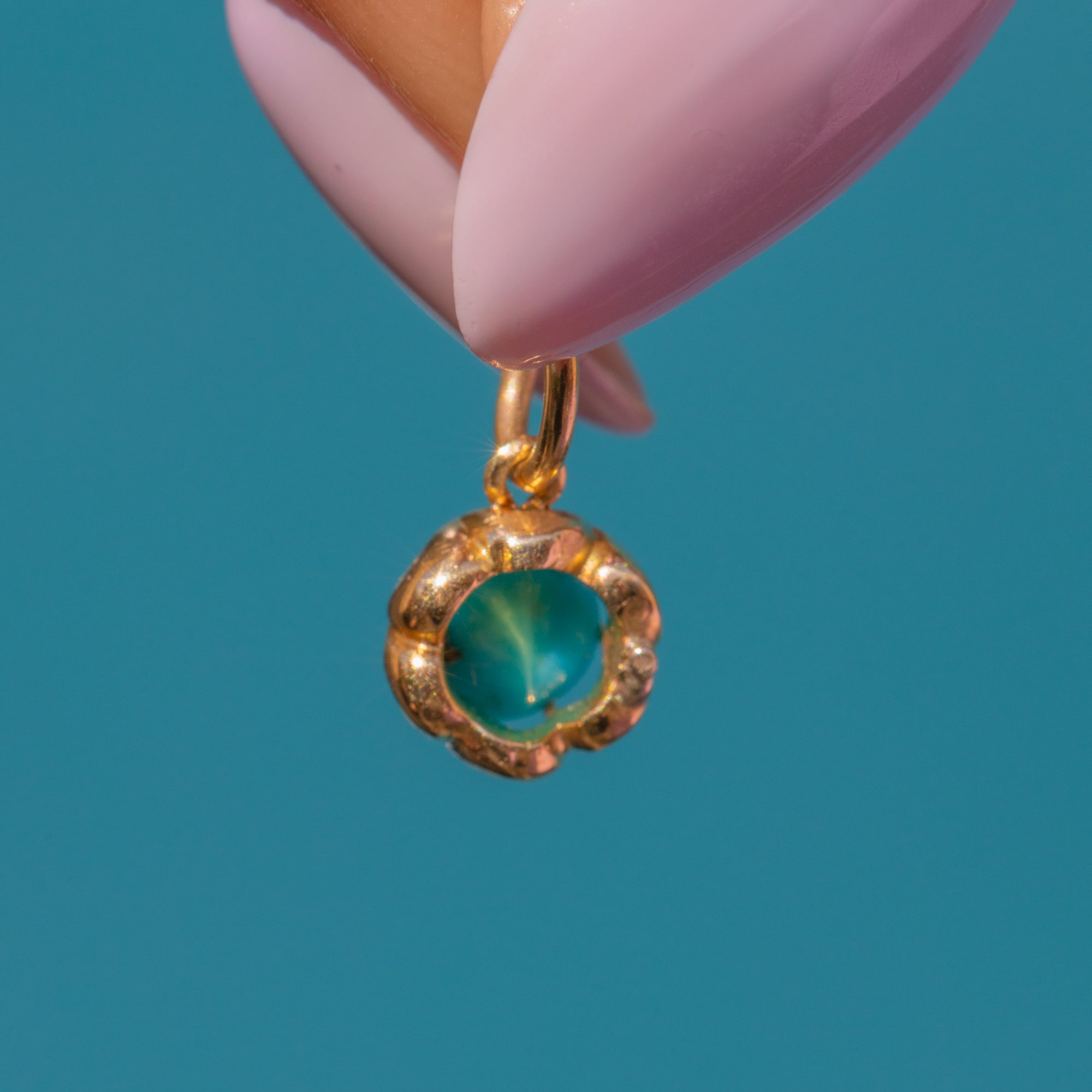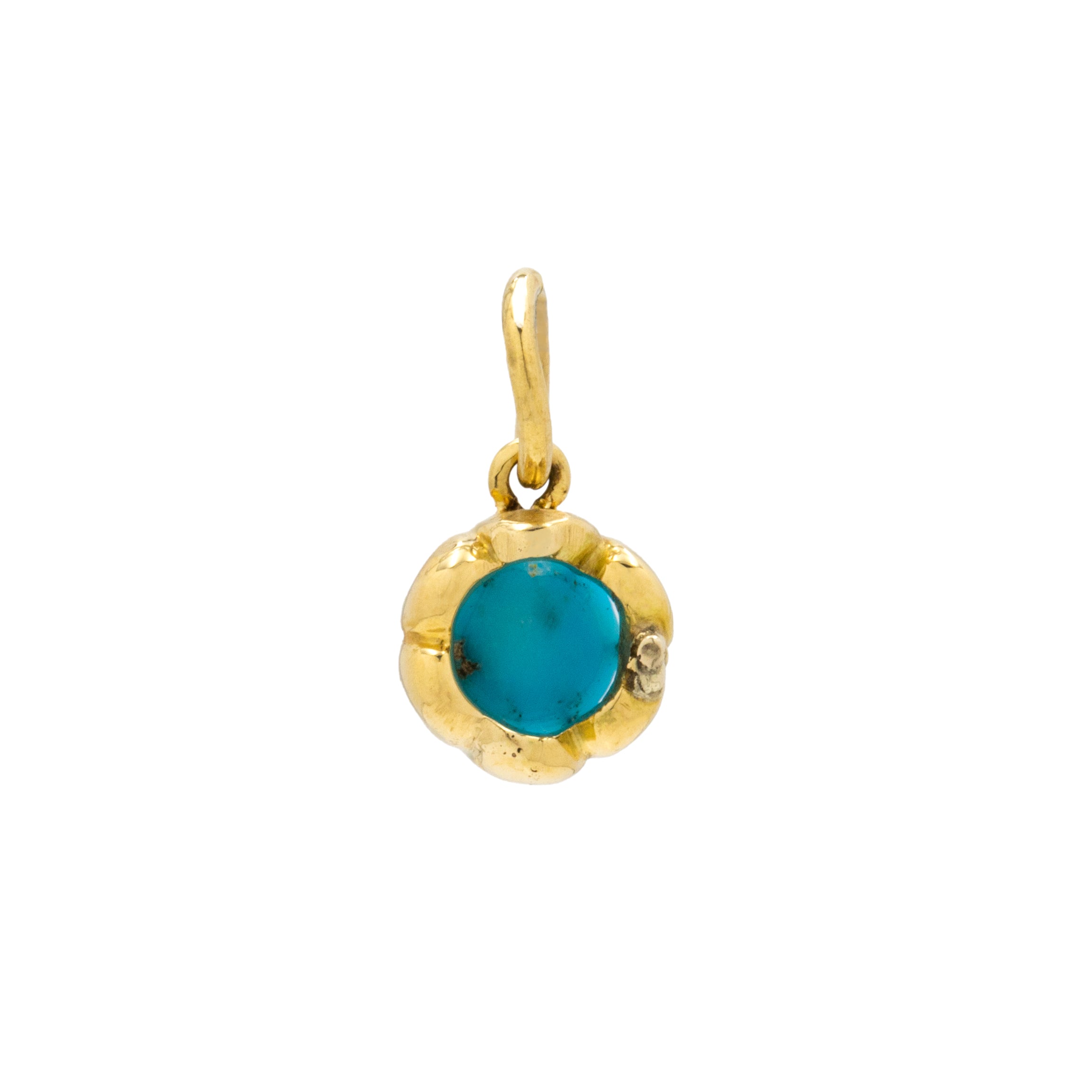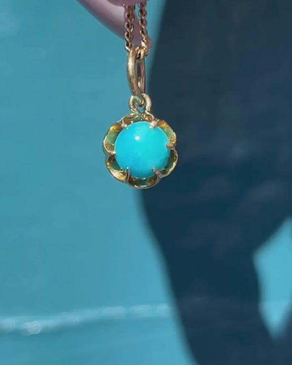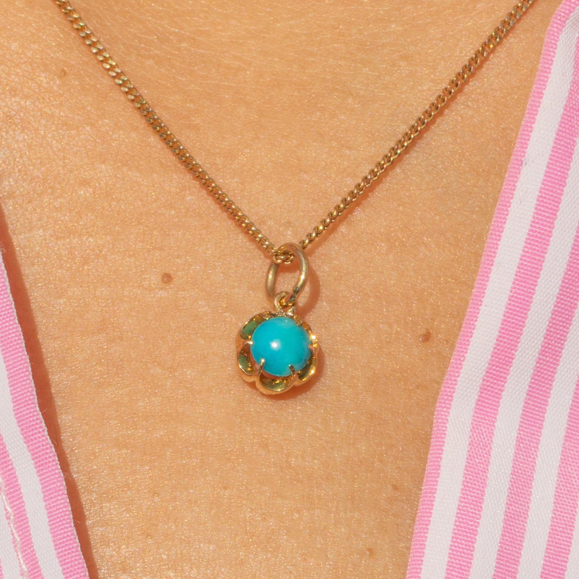 Add a pop of colour to your daily attire with this sweet antique 18ct Gold Turquoise charm! Boasting a smooth Turquoise cabochon, flaunting vivid blue hues, poised at the centre of classically Victorian buttercup settings, this pendant will become your new go-to piece.