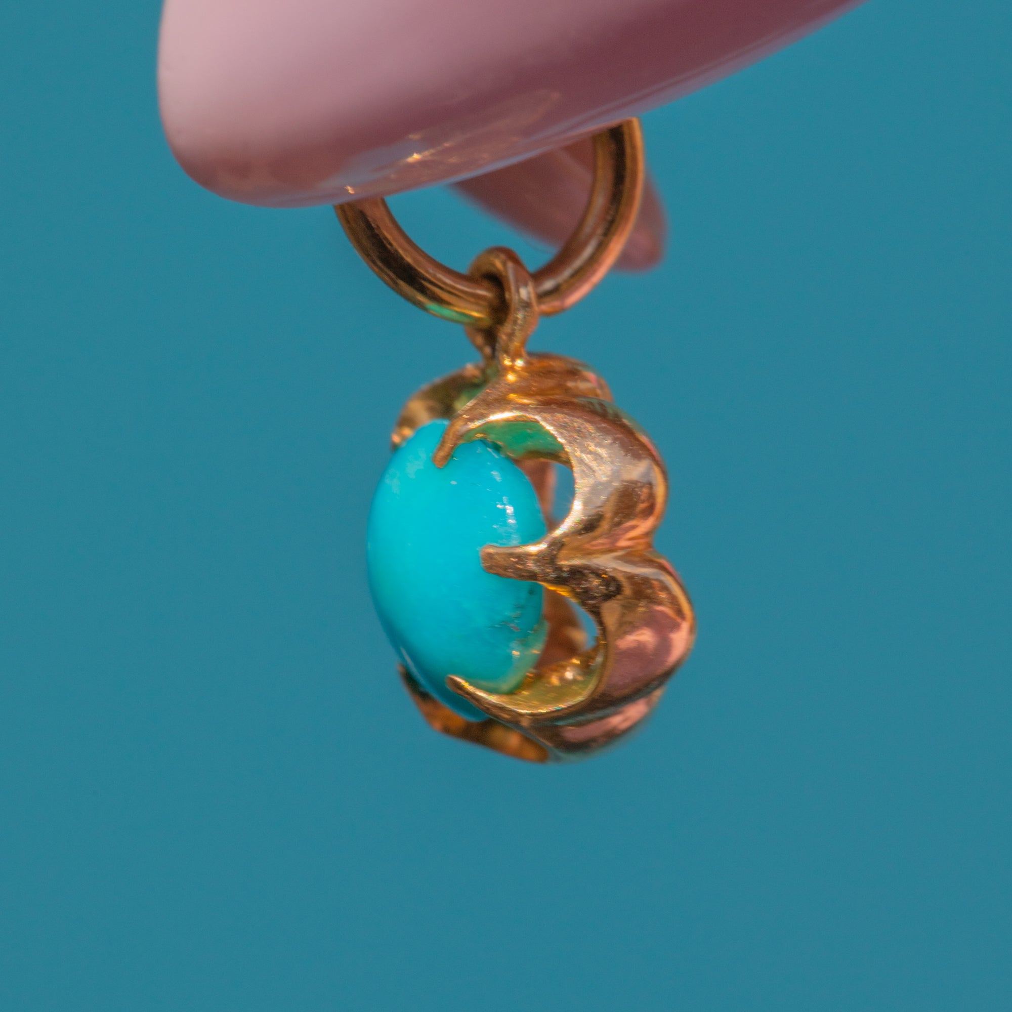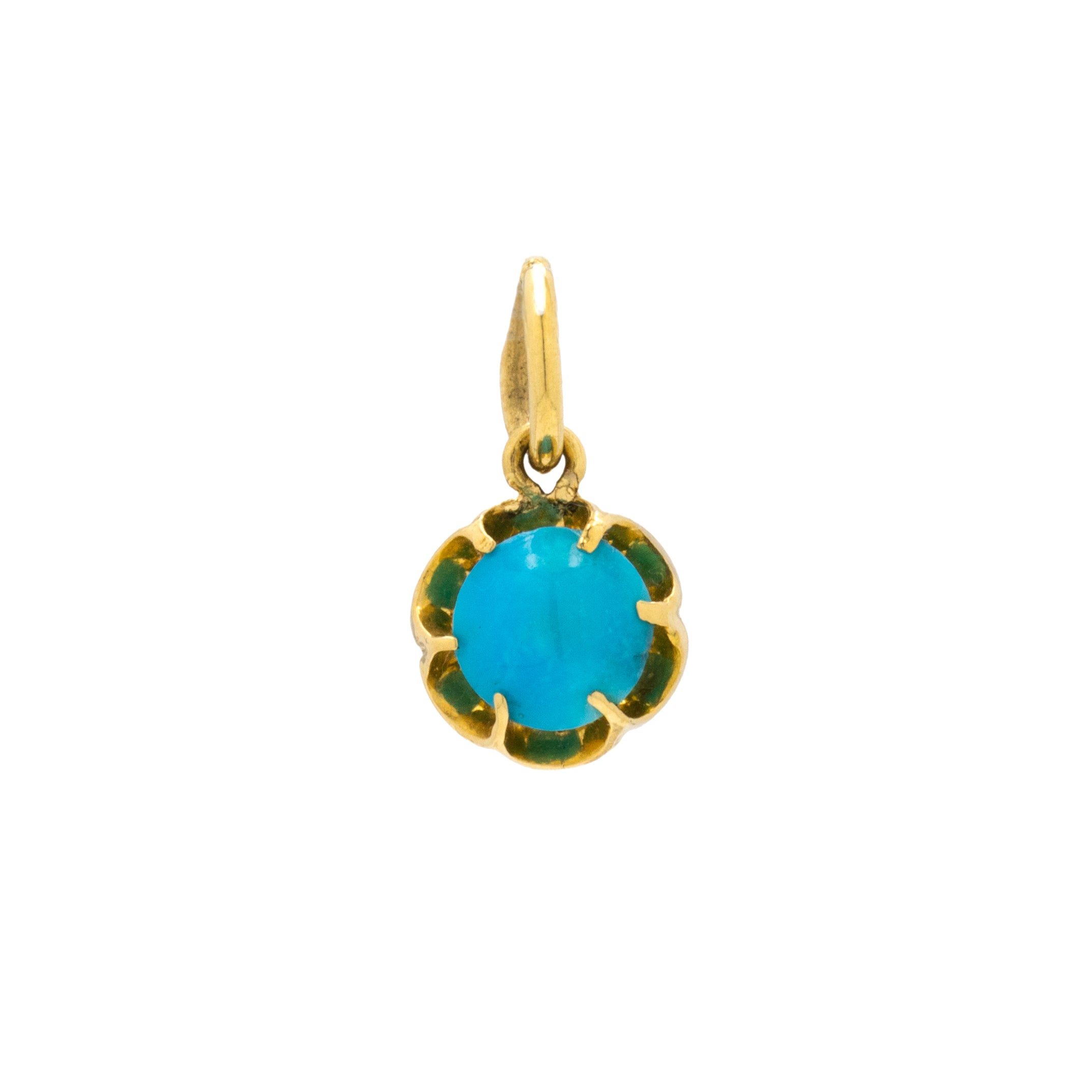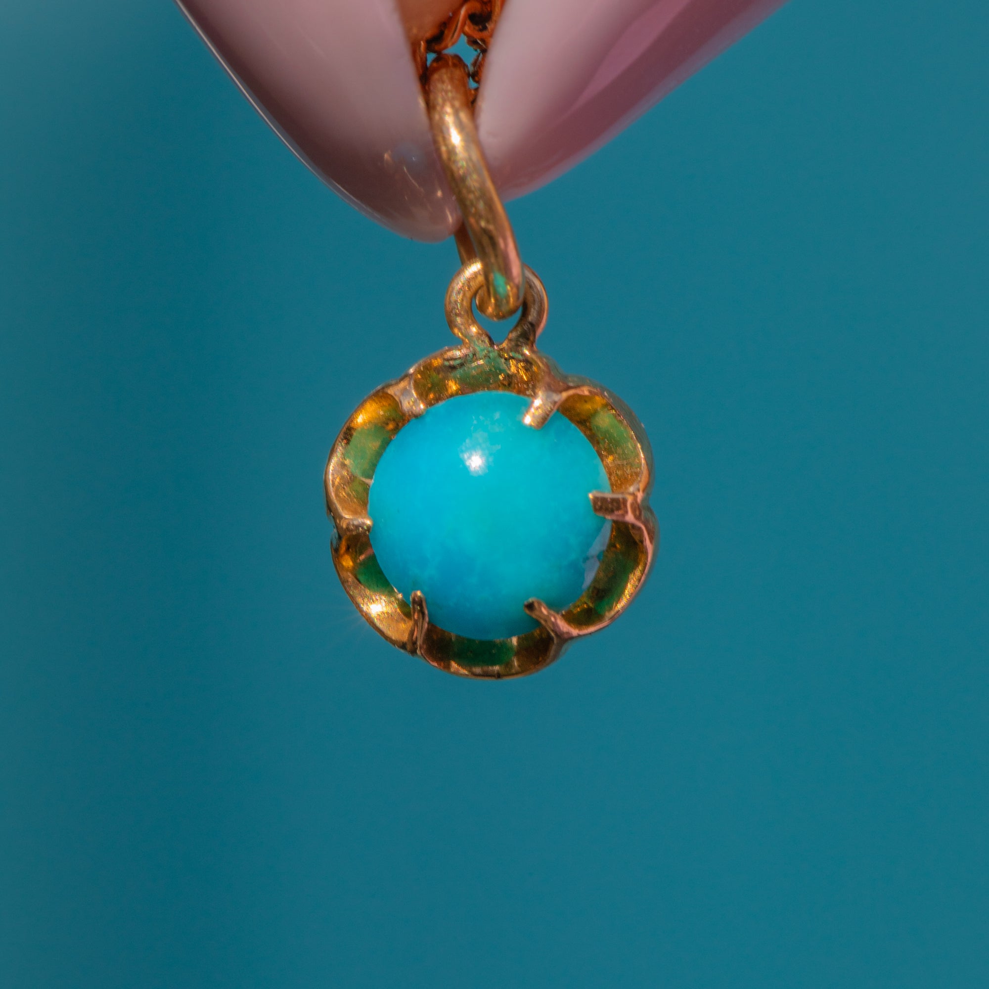 VERY GOOD-EXCELLENT. This antique 18ct Gold Turquoise charm is in superb condition. The Turquoise is securely set, perfectly smooth, and free from chips or scuffs. The 18ct Gold is buttery and adds a feminine flare, with only some wear on the back from a previous conversion. With a jump-ring to finish, you can wear this cute Victorian pendant with the utmost confidence!
