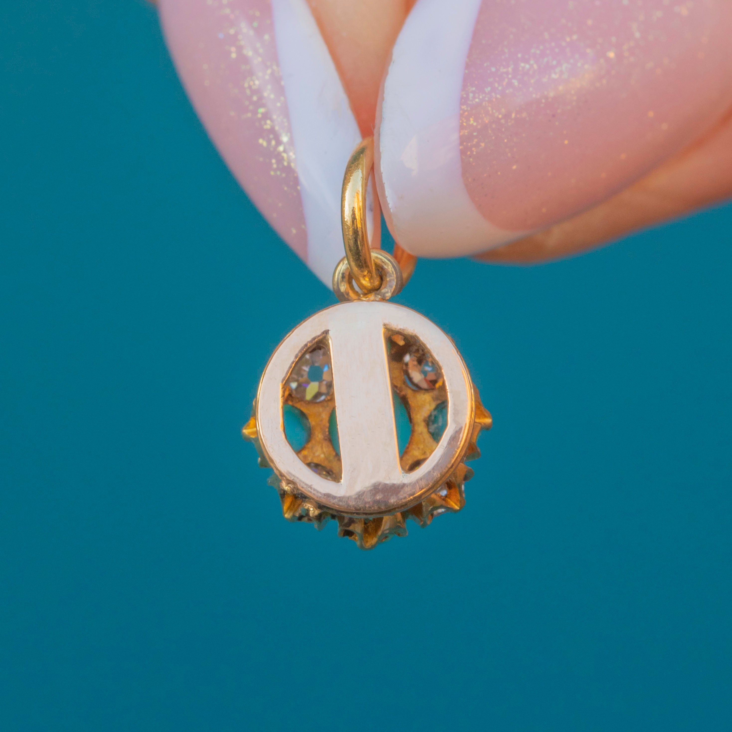 VERY GOOD-EXCELLENT: This antique 18ct Gold Turquoise Diamond cluster charm is in wonderful condition. The gemstones are all present and securely set, with only mild surface wear to the Turquoise. The Diamonds are bright with no chips or abrasions. The Gold is buttery with some minor surface wear, which is only noticeable under close inspection. With a generously sized jump ring, you can suspend this Victorian charm from a chain with ease!