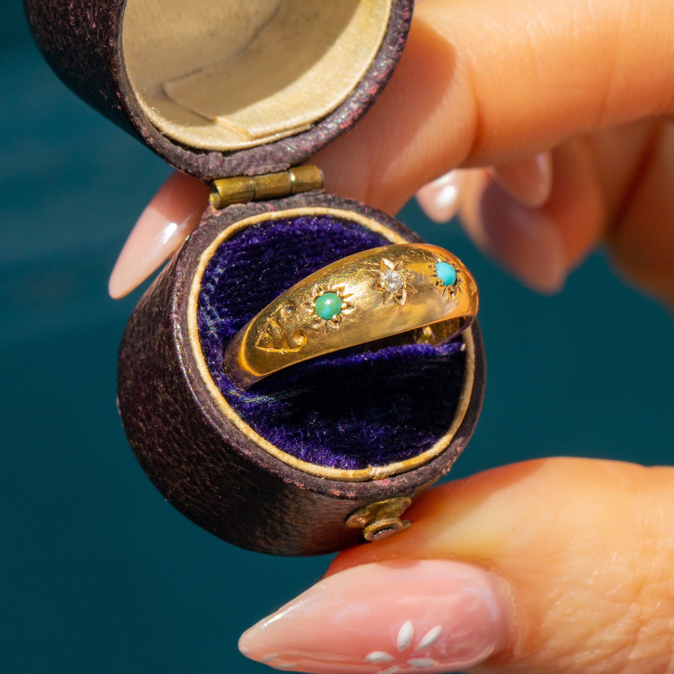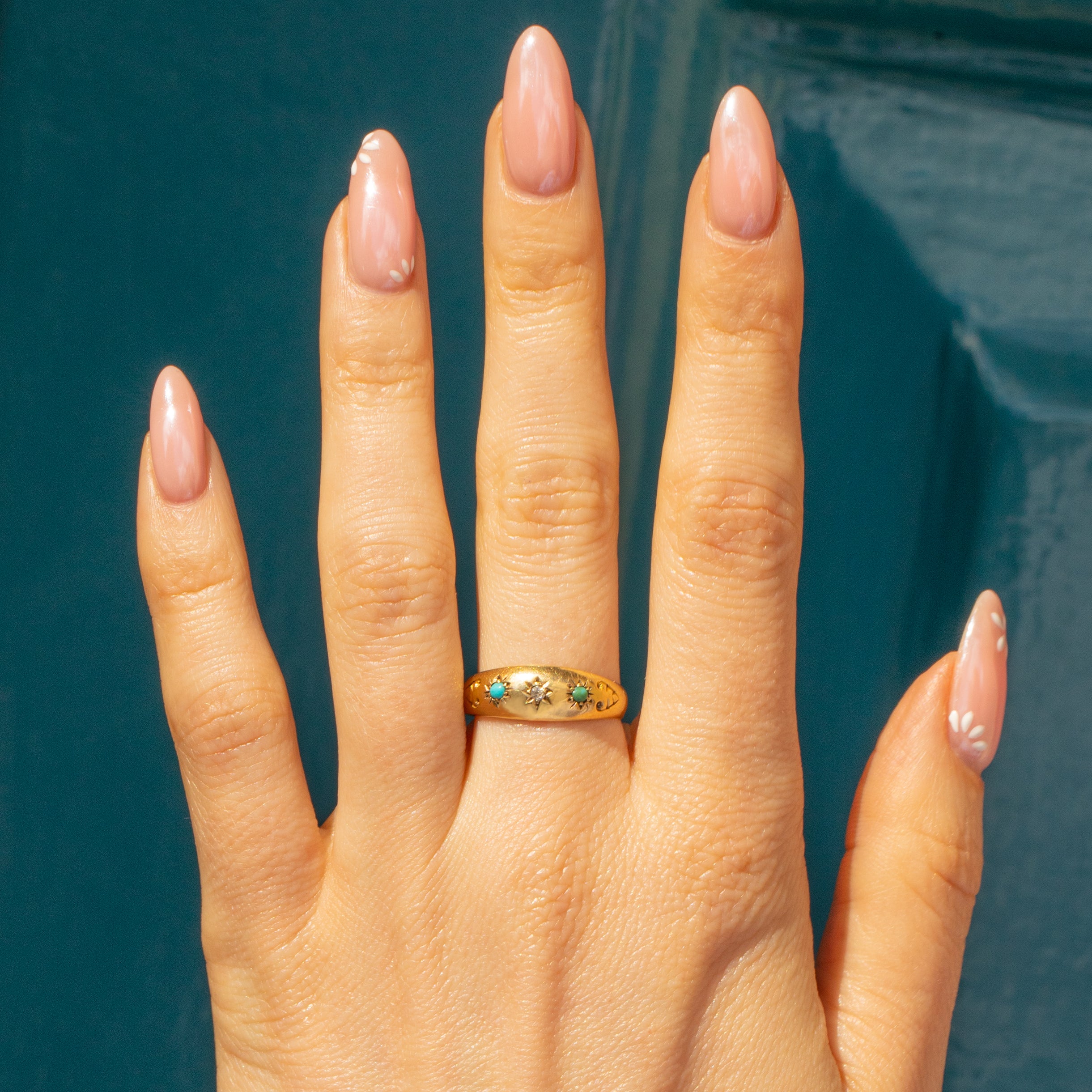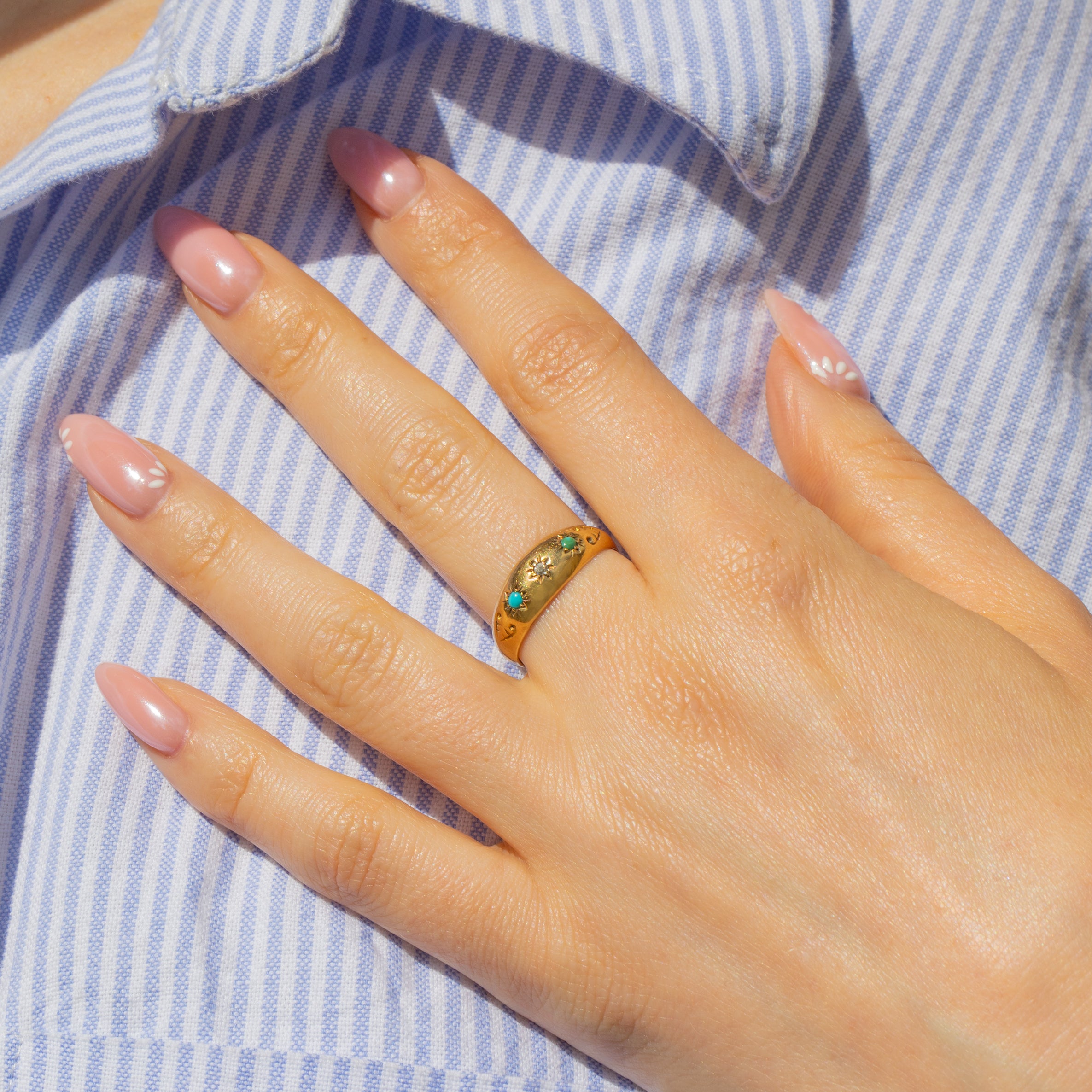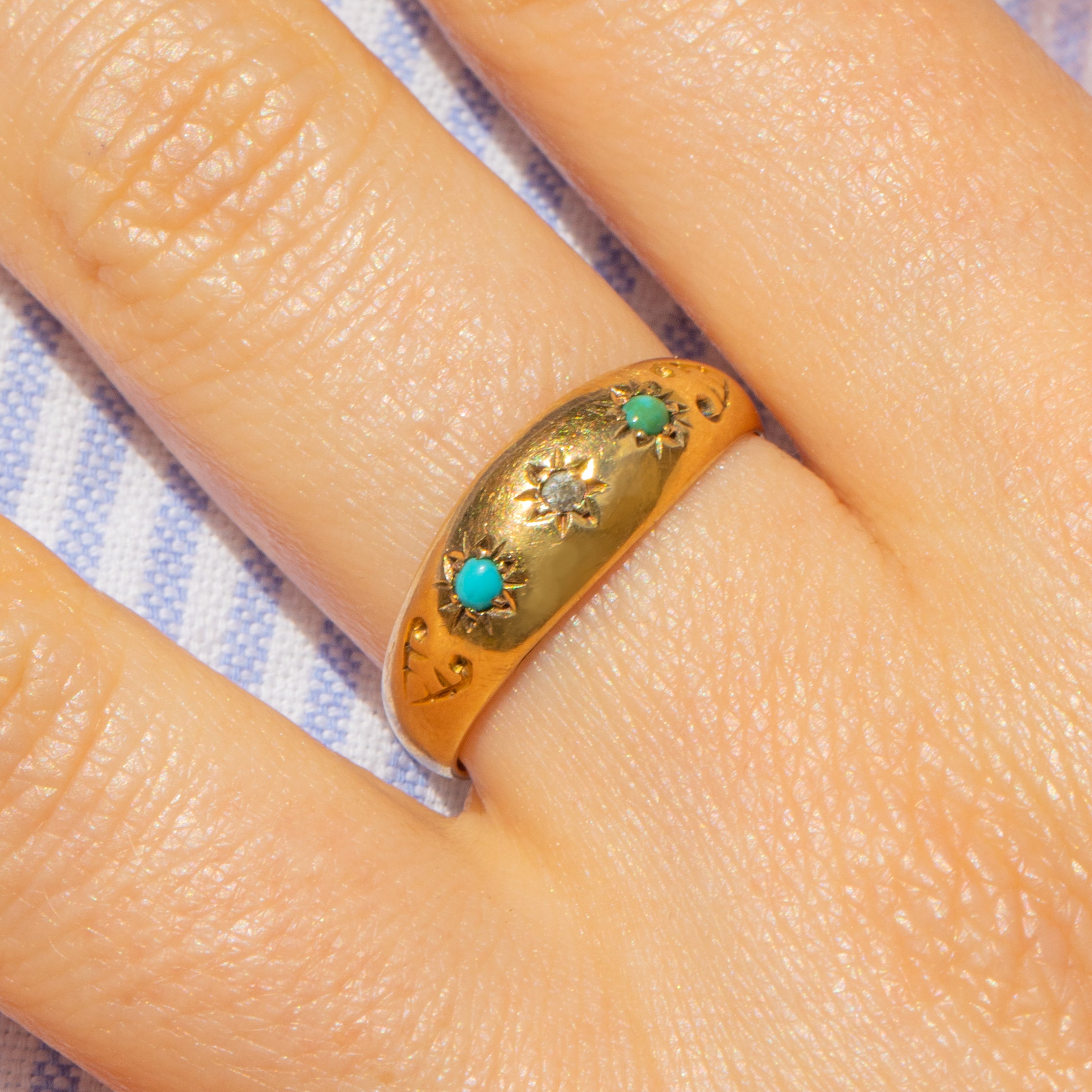 There's nothing like this antique 18ct Gold Turquoise Diamond gypsy ring to elevate your ring stack! A star-set dazzling Diamond takes centre stage, flanked by two Turquoise with varying hues from teal to sky blue, creating an eye-catching piece for your collection.