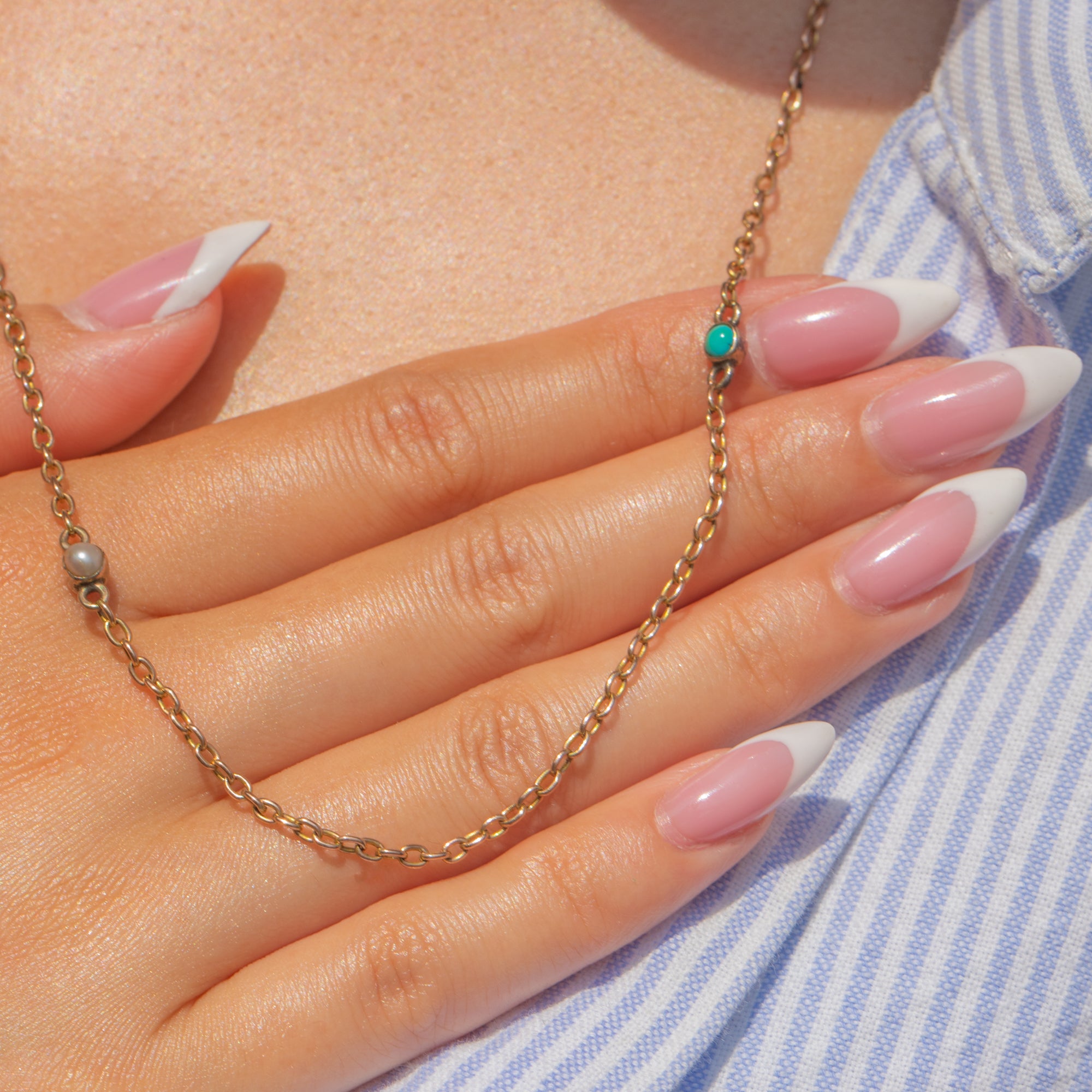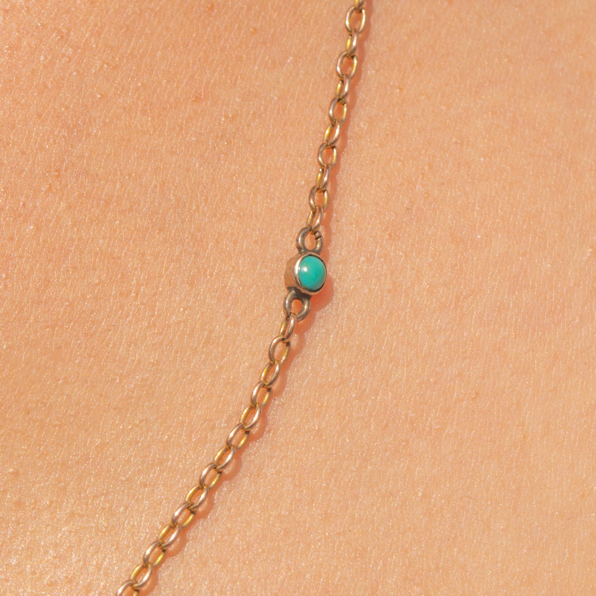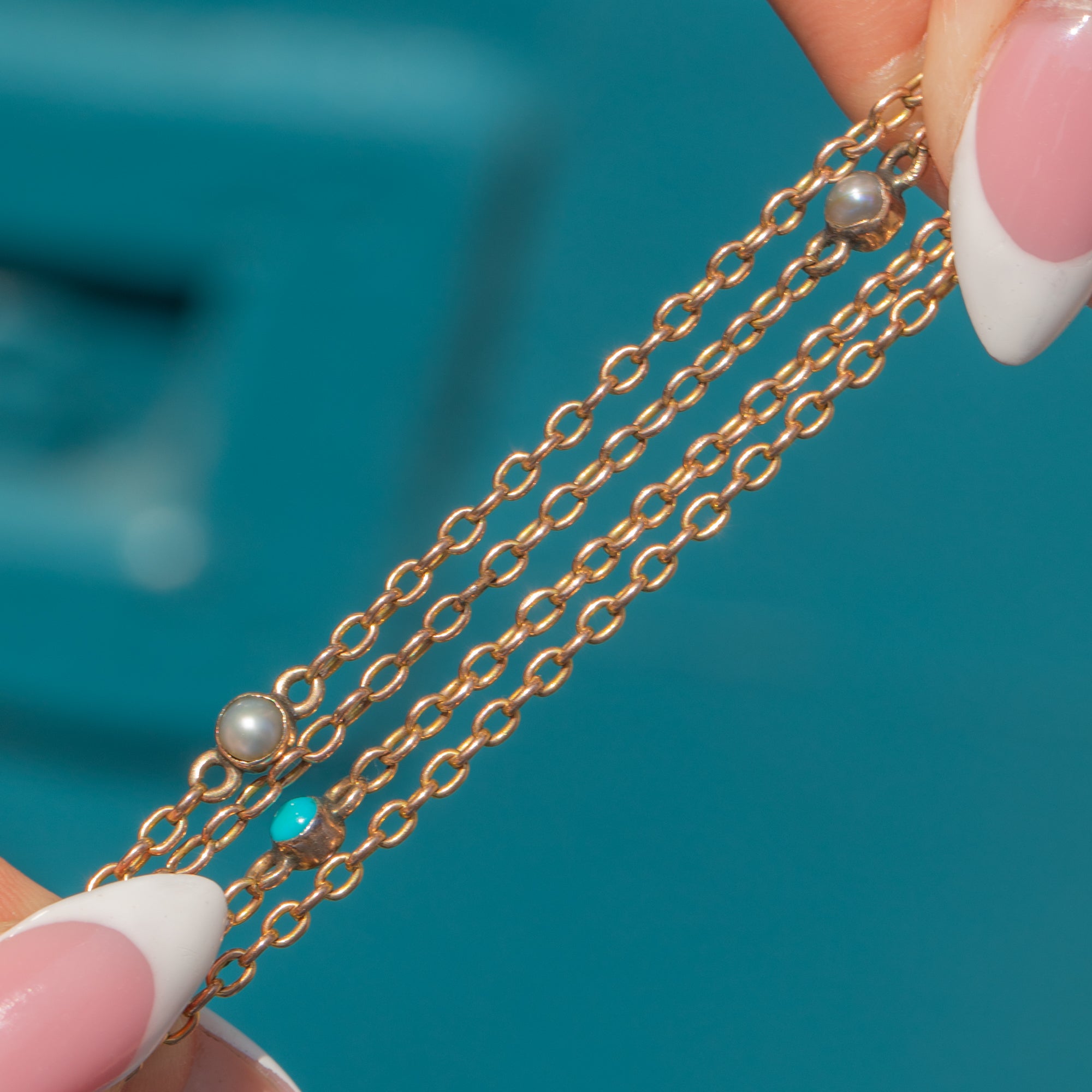 Crafted from rosy hued 9ct Gold, this antique chain necklace is dotted with alternating Turquoise and Pearls which provide a lovely pop of colour and iridescence.