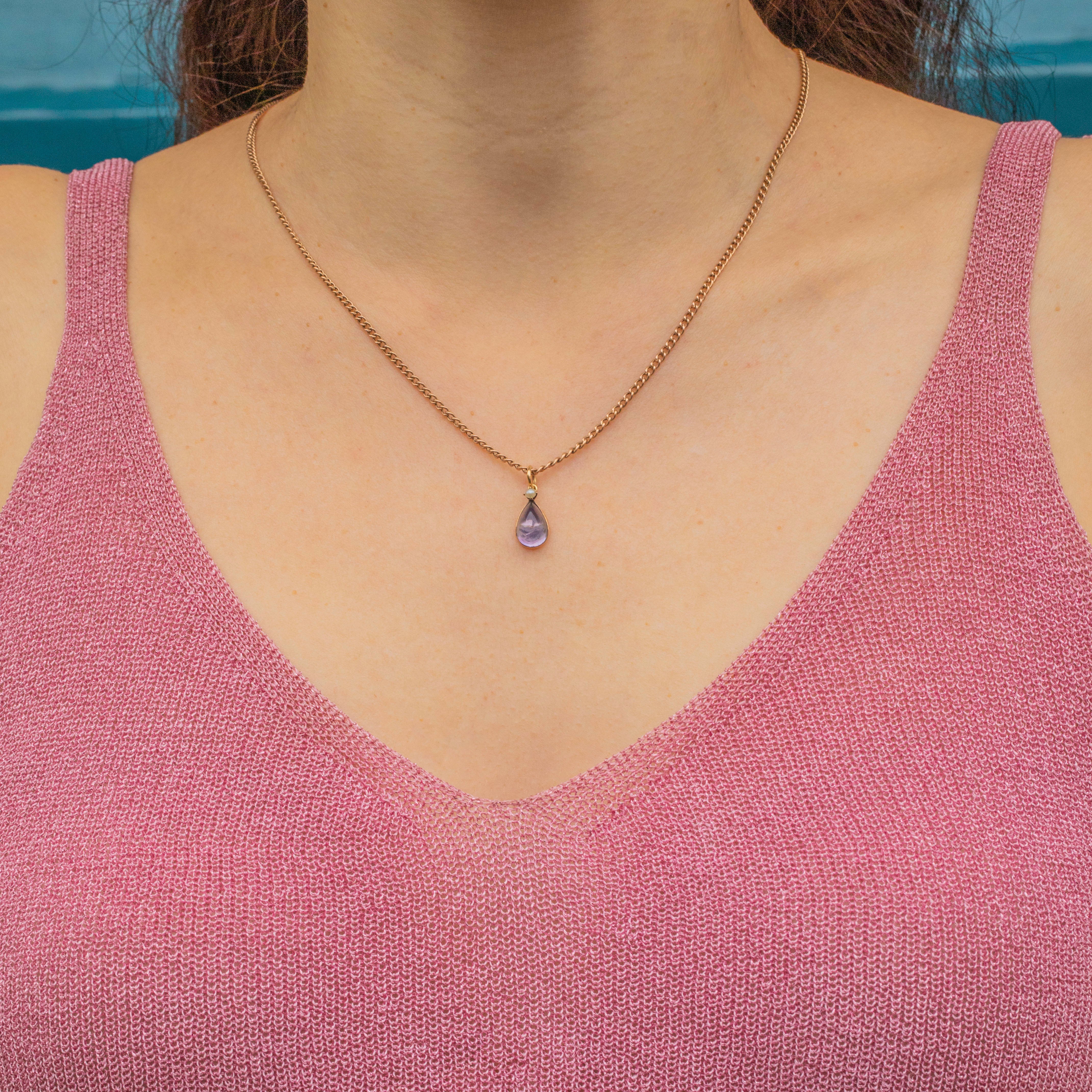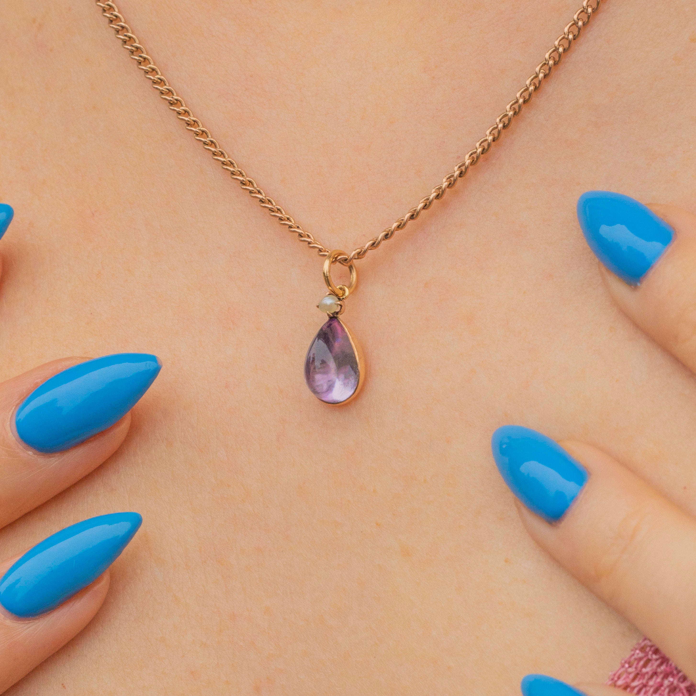 Add a pop of colour to your collection with this antique 9ct Gold Amethyst sugarloaf pear Pearl charm! Her plump 1.84ct Amethyst radiates gorgeous violet and lilac hues and is complimented beautifully by the dainty Pearl that rests delicately above.