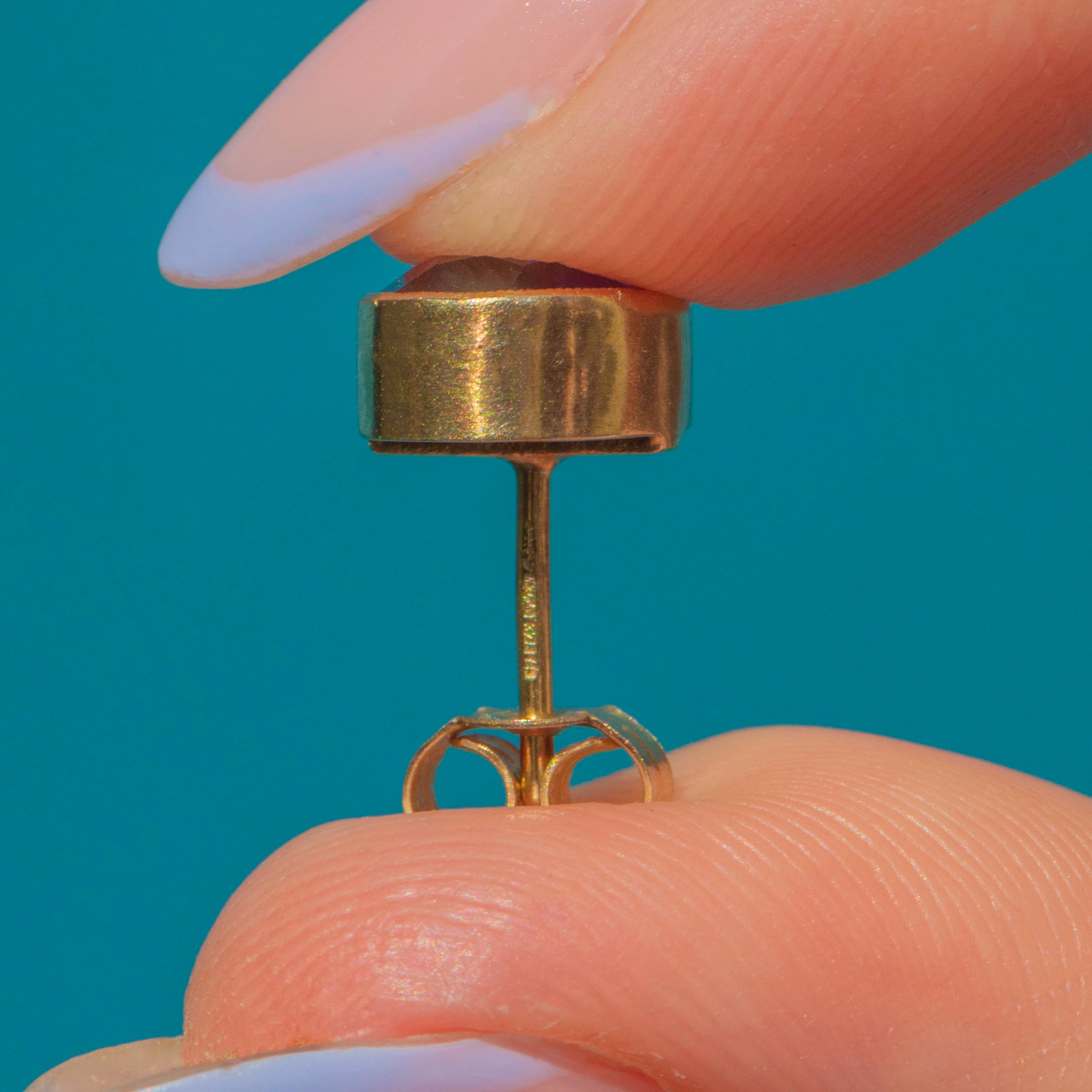 VERY GOOD-EXCELLENT: These antique 9ct Gold Amethyst bezel-set stud earrings are in wonderful condition. The Amethysts have a deeply saturated hue and crisp facets that are free from chips or abrasions. The Gold is buttery and the bezels robust, with only minor surface wear commensurate with age. With secure posts and snug-fitting butterfly backs, you can enjoy wearing these antique Amethyst earrings with absolute confidence!