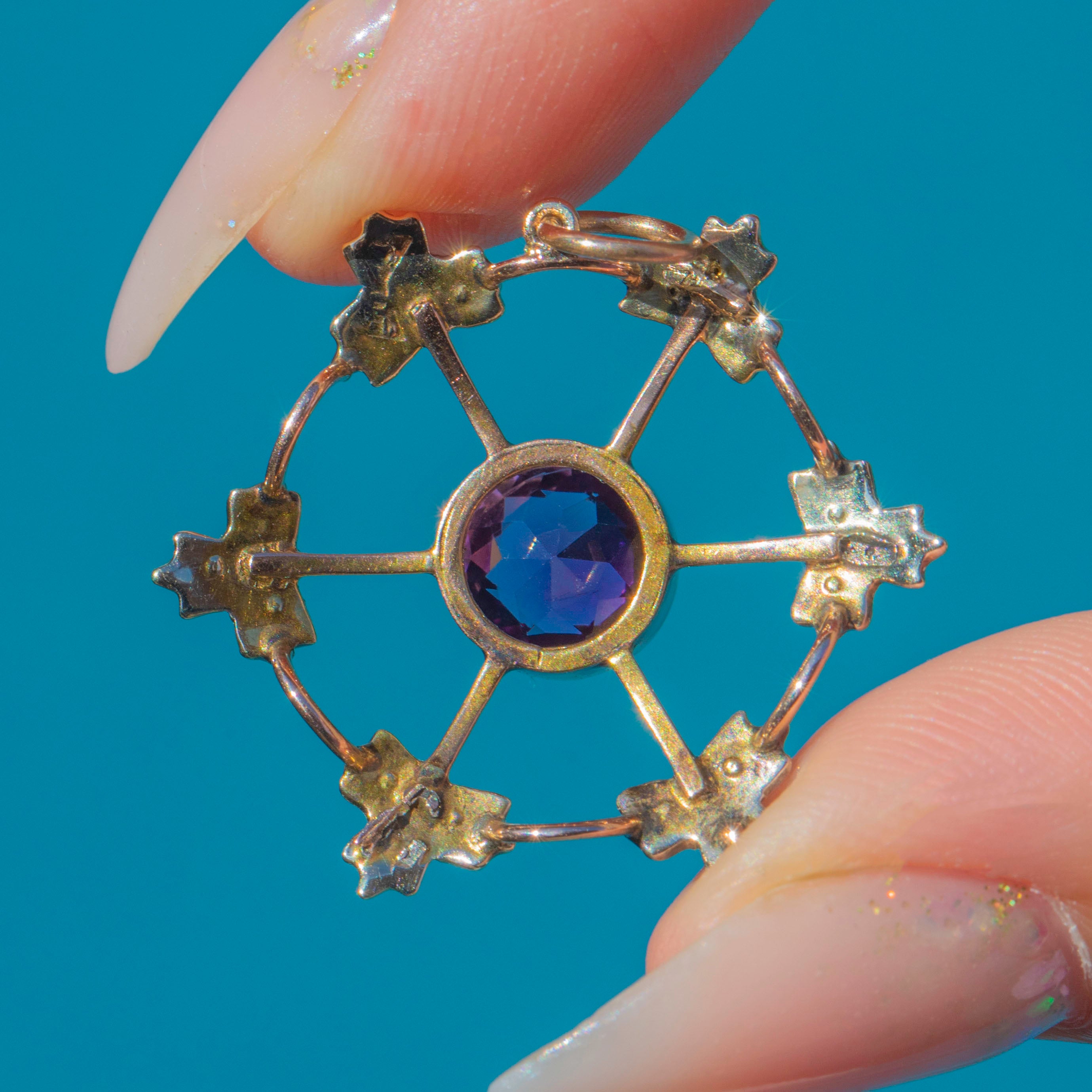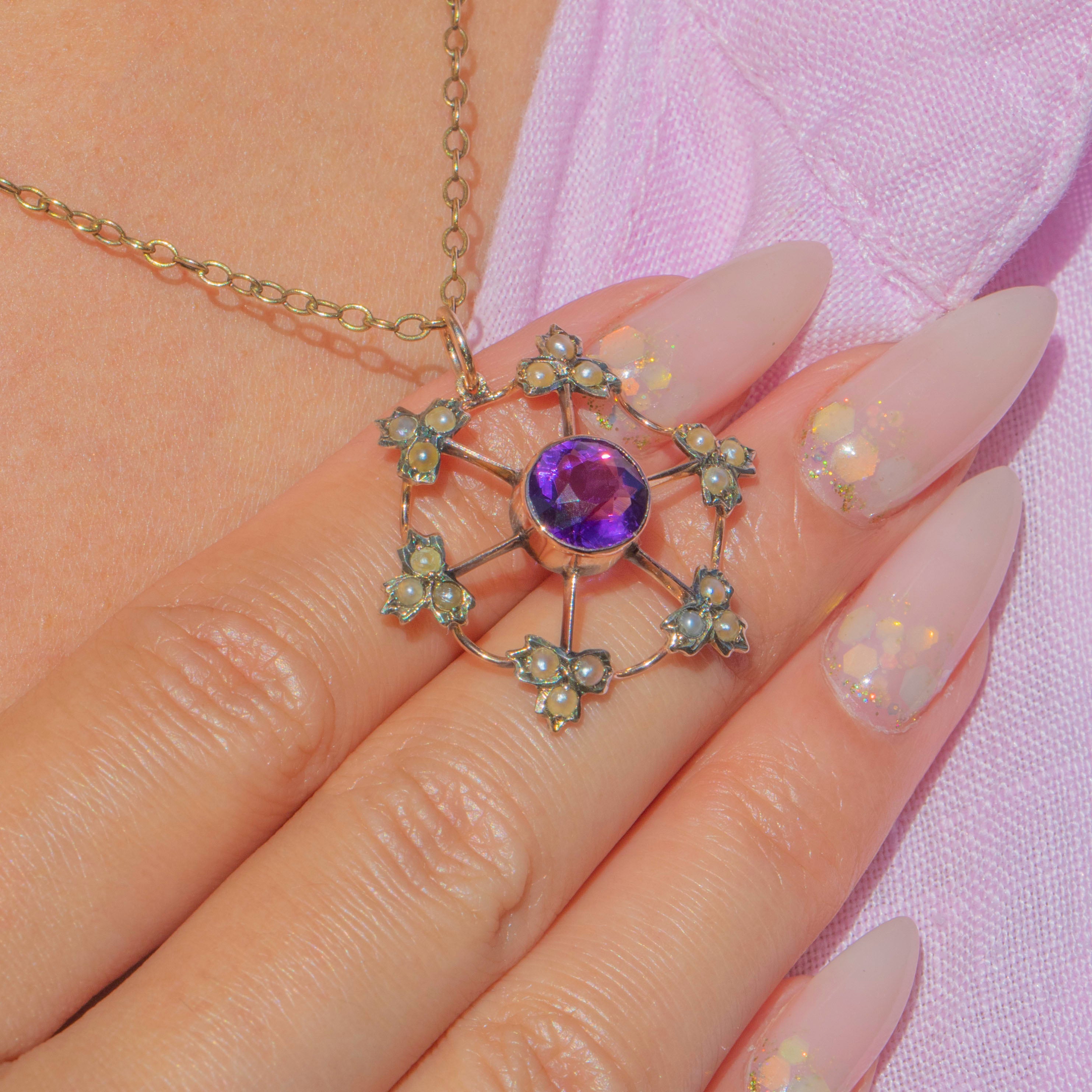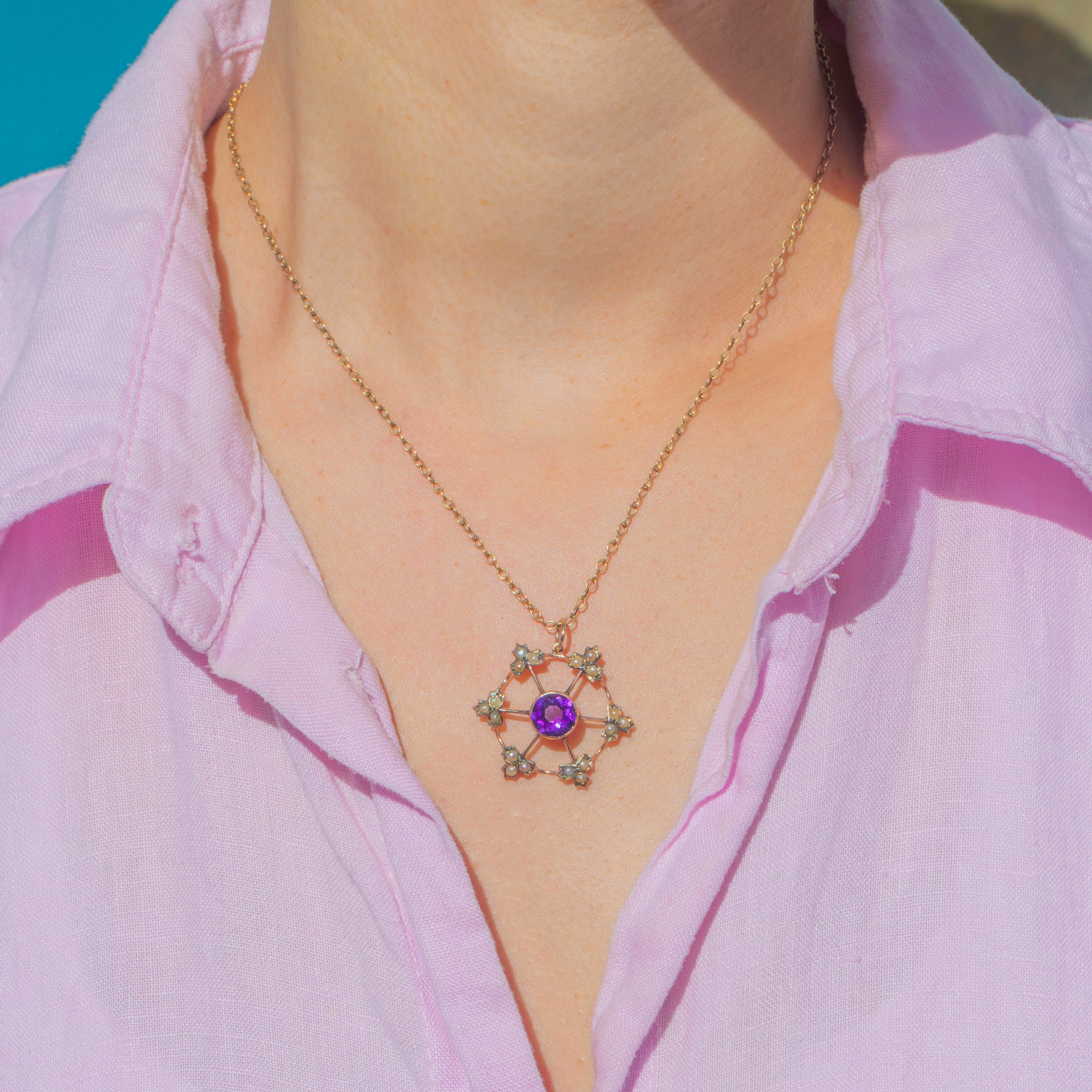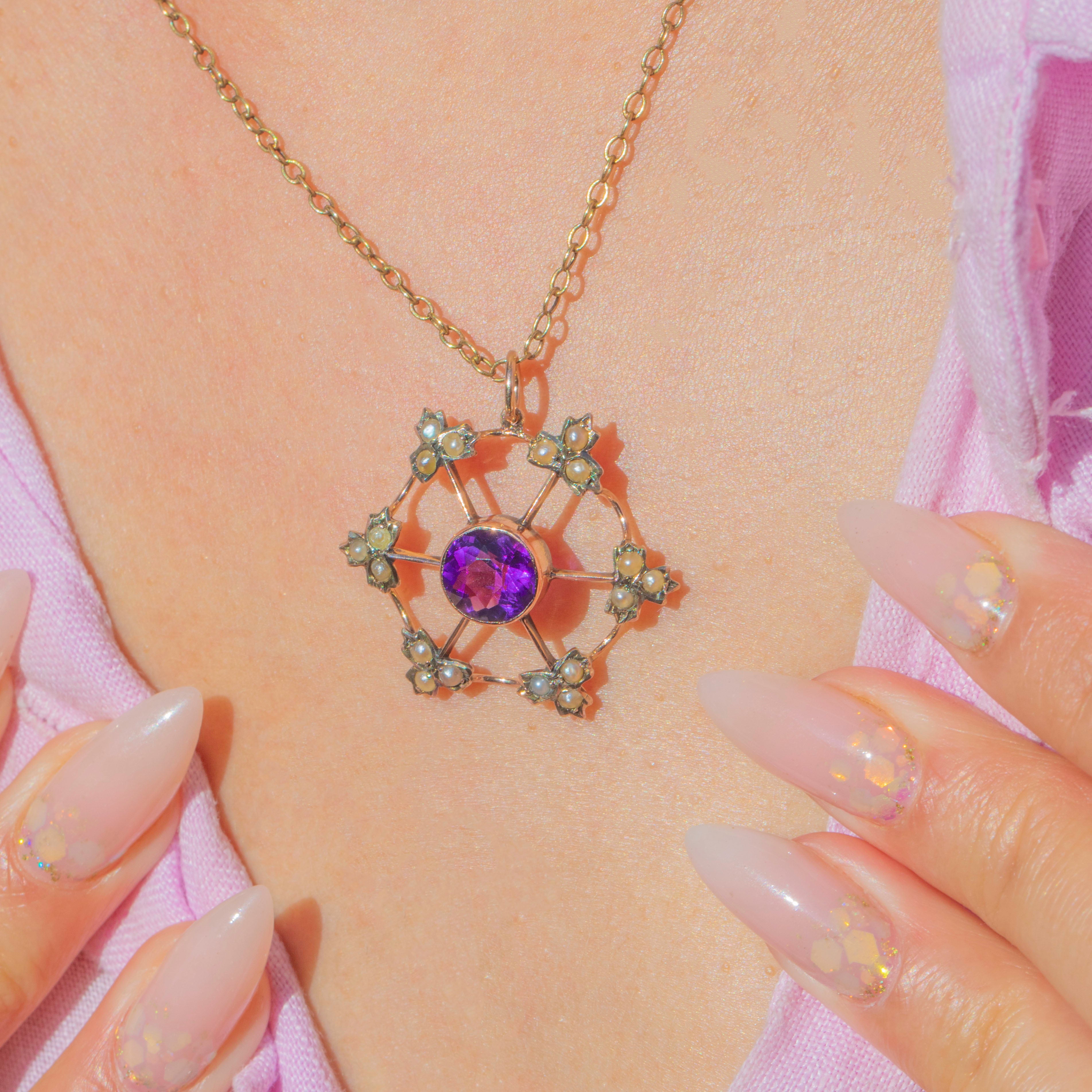 This beautiful antique Edwardian pendant showcases a vivid purple Amethyst at the centre, surrounded by a delicate halo of Pearls arranged in a floral starburst design. Circa 1900, the 9ct Gold openwork framework creates a pretty, lace-like appearance, allowing the gemstones to shine with elegance and charm.
