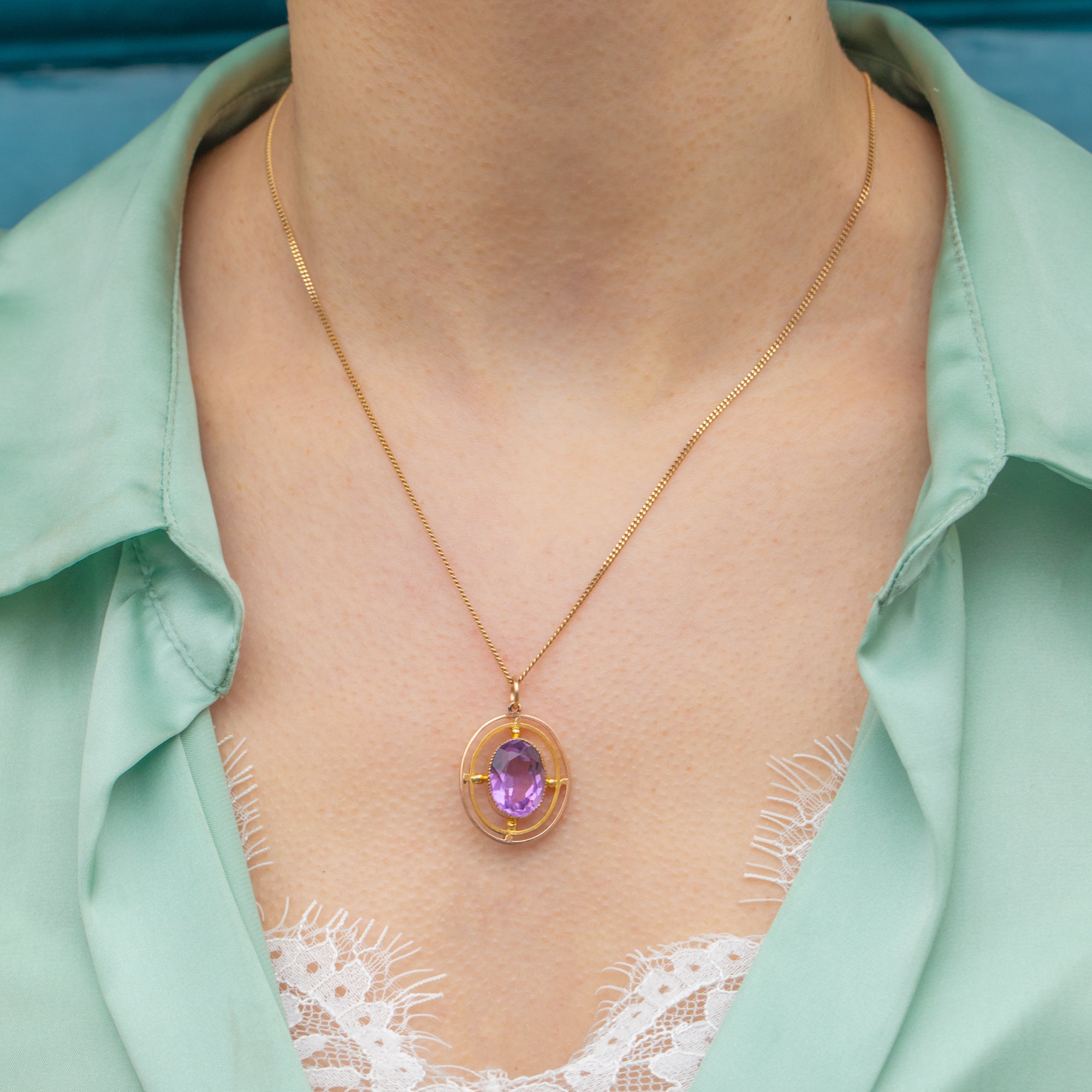 Crafted from buttery 9ct yellow Gold, this Victorian pendant features a 4.05ct Amethyst in her centre, radiating stunning lavender hues. She is encircled by a glossy oval border in a classic target design.