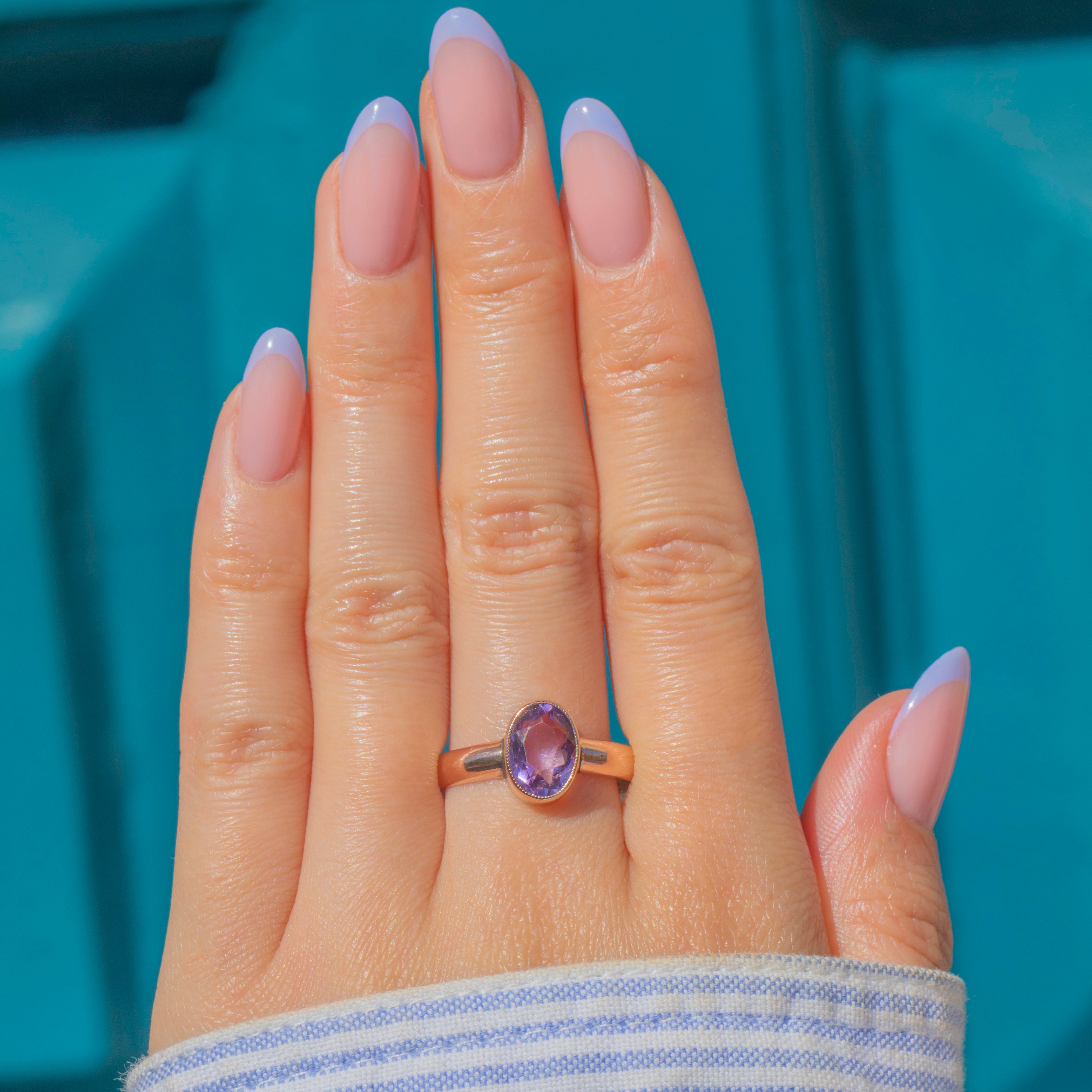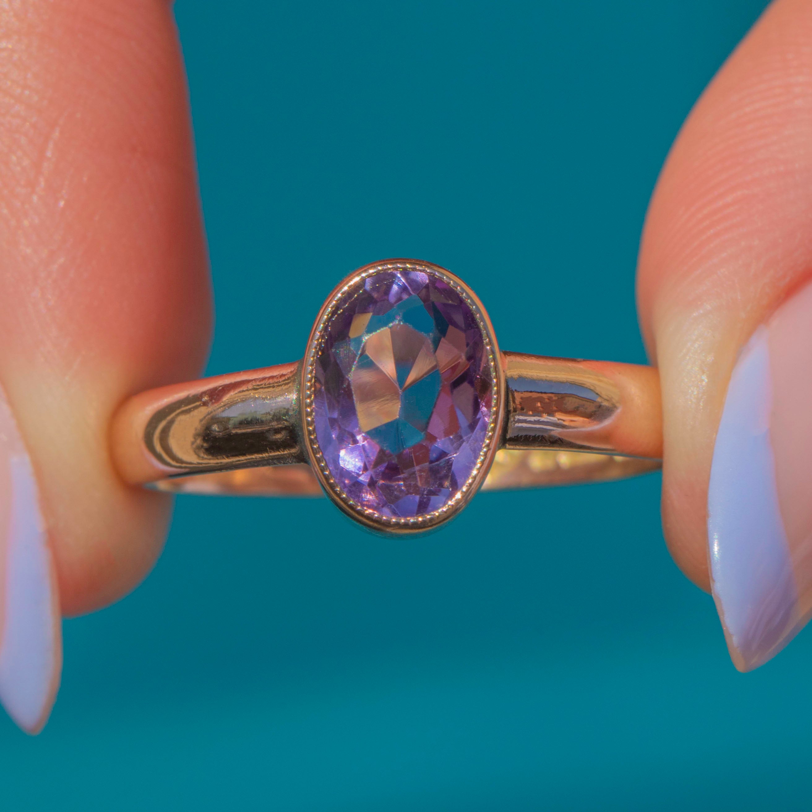 This Post-Edwardian Amethyst ring displays the most mesmerising violet colour, complimented by the delicate golden tones of her 9ct Gold settings. She sits high in her bezel and provides excellent finger coverage, making her quite the statement piece!