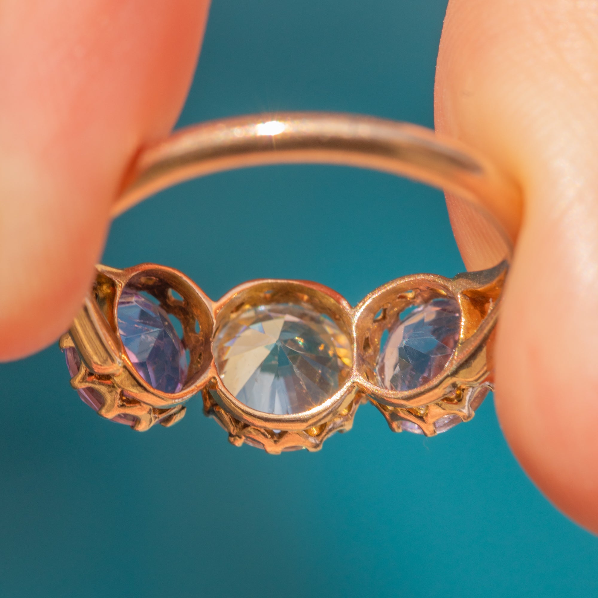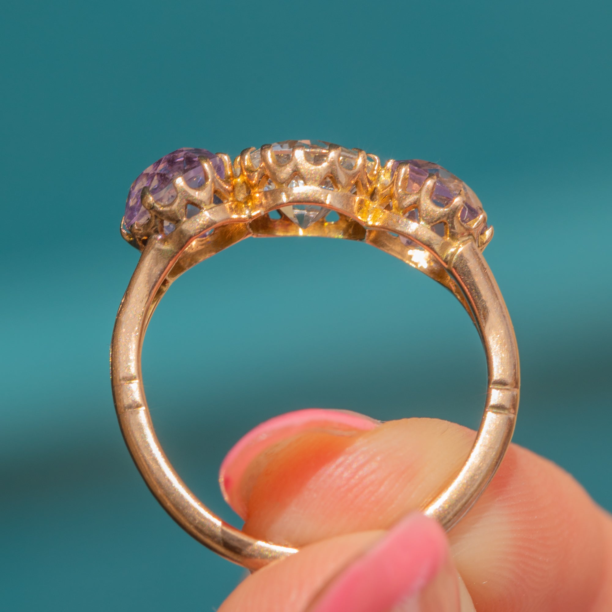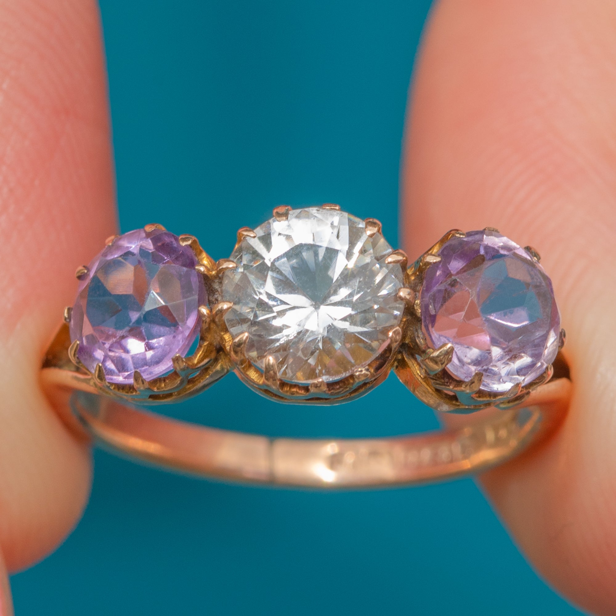 A striking antique 9ct Gold Amethyst spinel trilogy ring! With a total weight of 1.35ct, her two lavender-hued Amethysts sit lovingly beside an icy 1.35ct Spinel, nestled into antique claw settings.