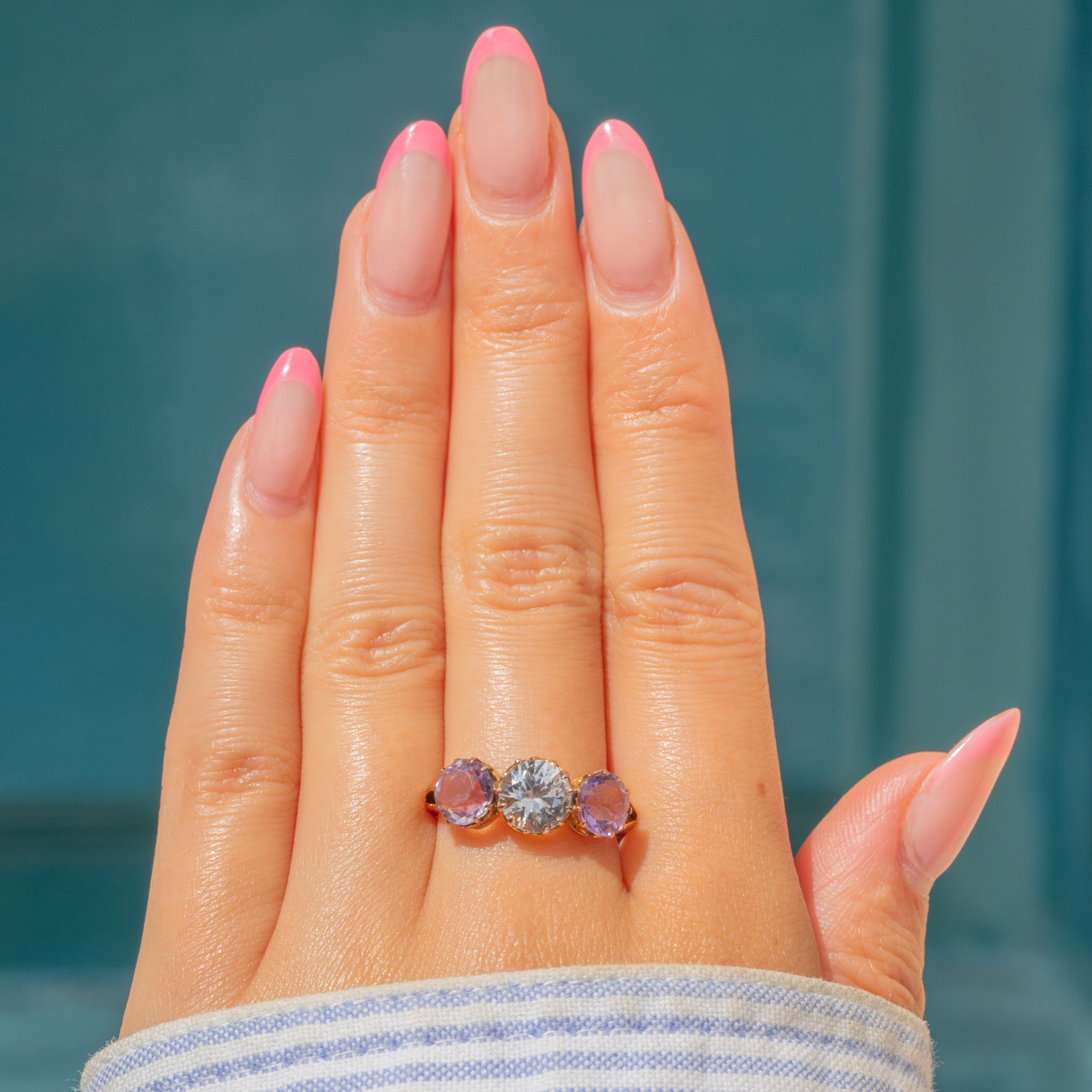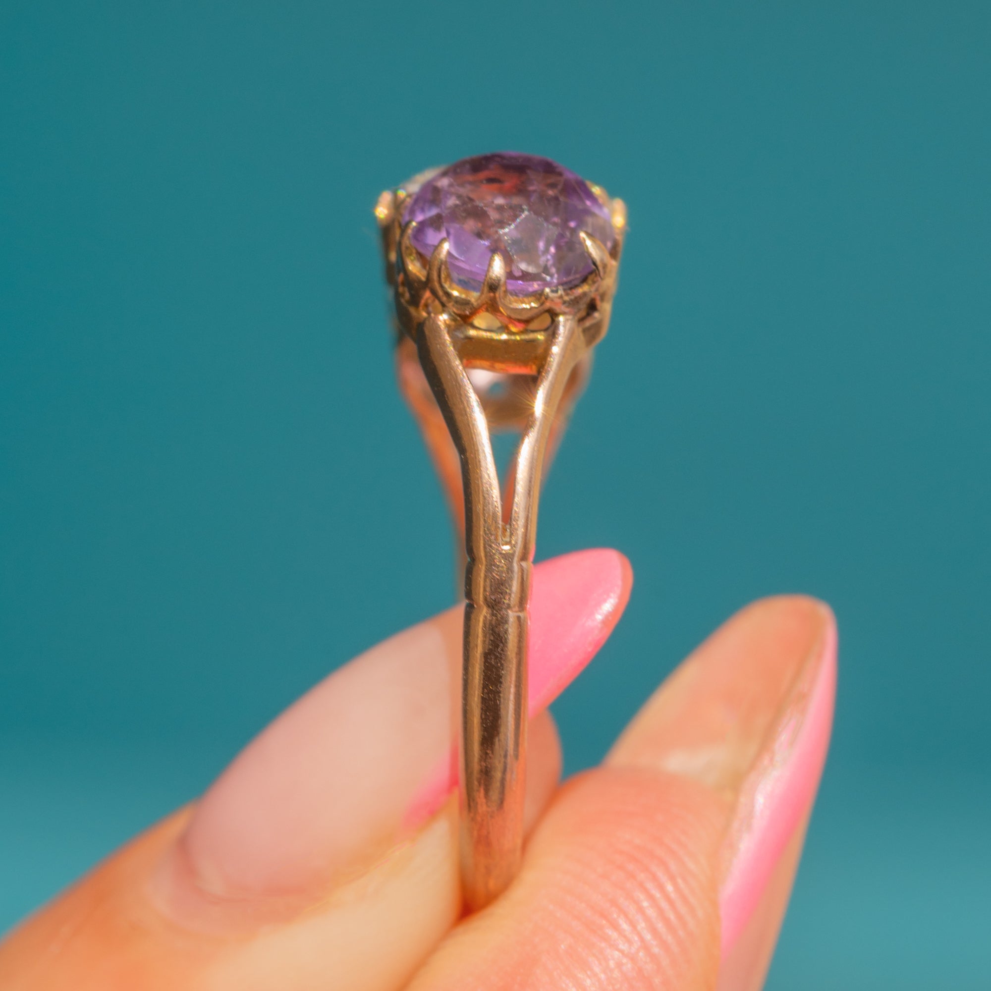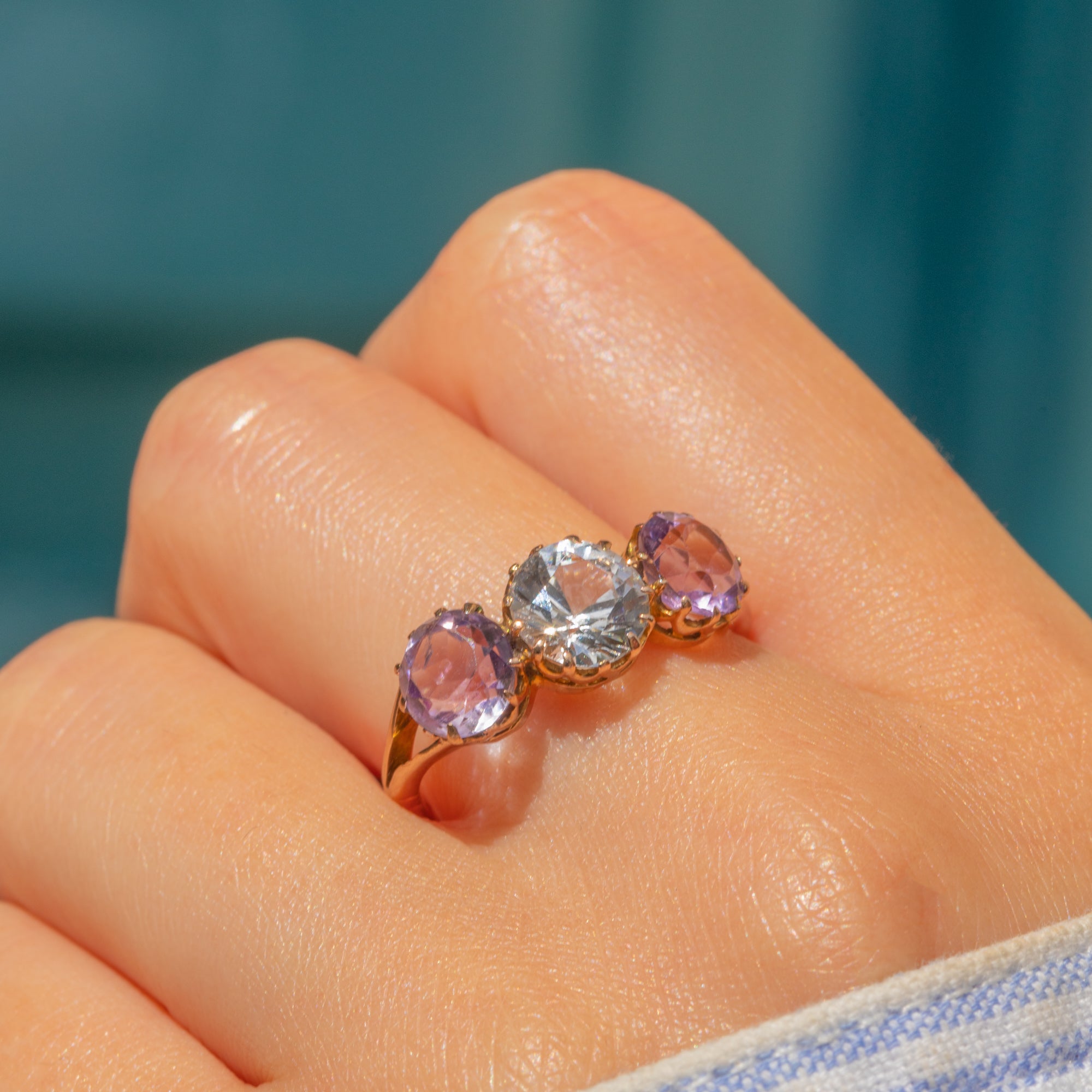 A striking antique 9ct Gold Amethyst spinel trilogy ring! With a total weight of 1.35ct, her two lavender-hued Amethysts sit lovingly beside an icy 1.35ct Spinel, nestled into antique claw settings.