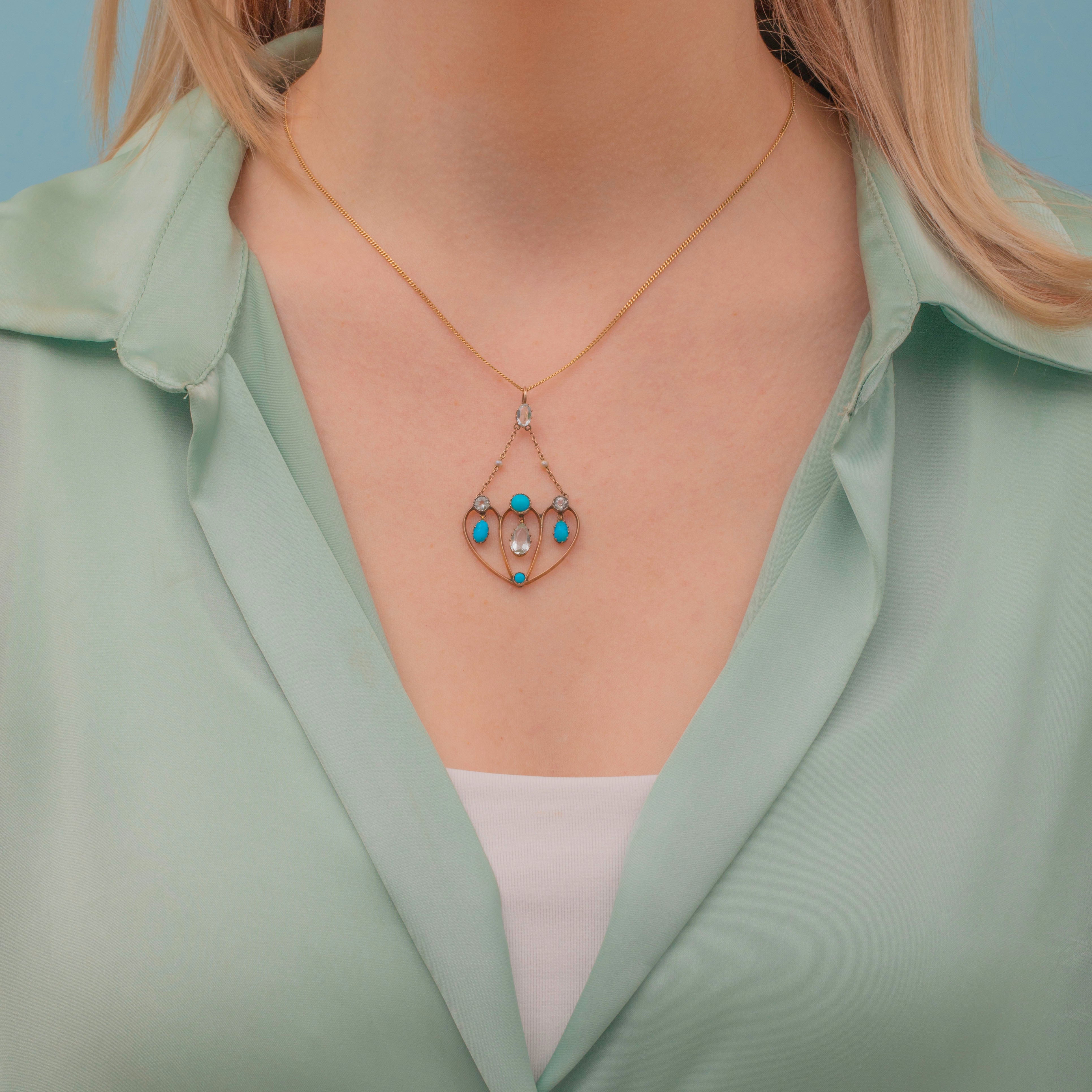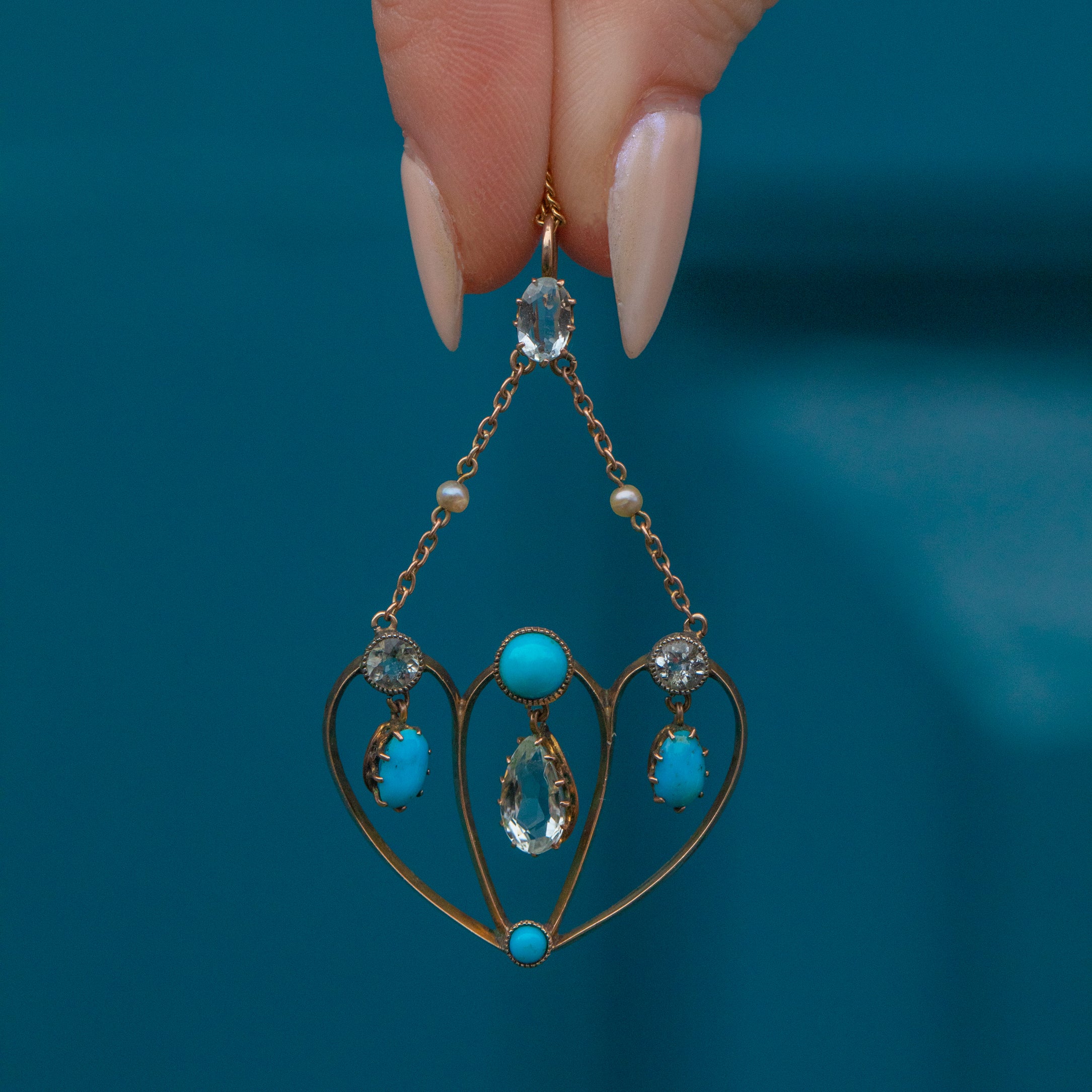 VERY GOOD. This antique 9ct Gold Aquamarine Turquoise pendant is in very good condition. The Gold has a lovely buttery hue with only minor age-related surface wear and has remained structurally sound. The Turquoise are smoothly domed and securely set, with no chips or scuffs visible. There is a minor scuff on one of the Aquamarines, but the remaining three are pristine and they have all remained secure within their settings. The trace links are firmly connected and the Pearls are pristine. Promising many more years of wear, this Victorian pendant will make a superb addition to your collection!