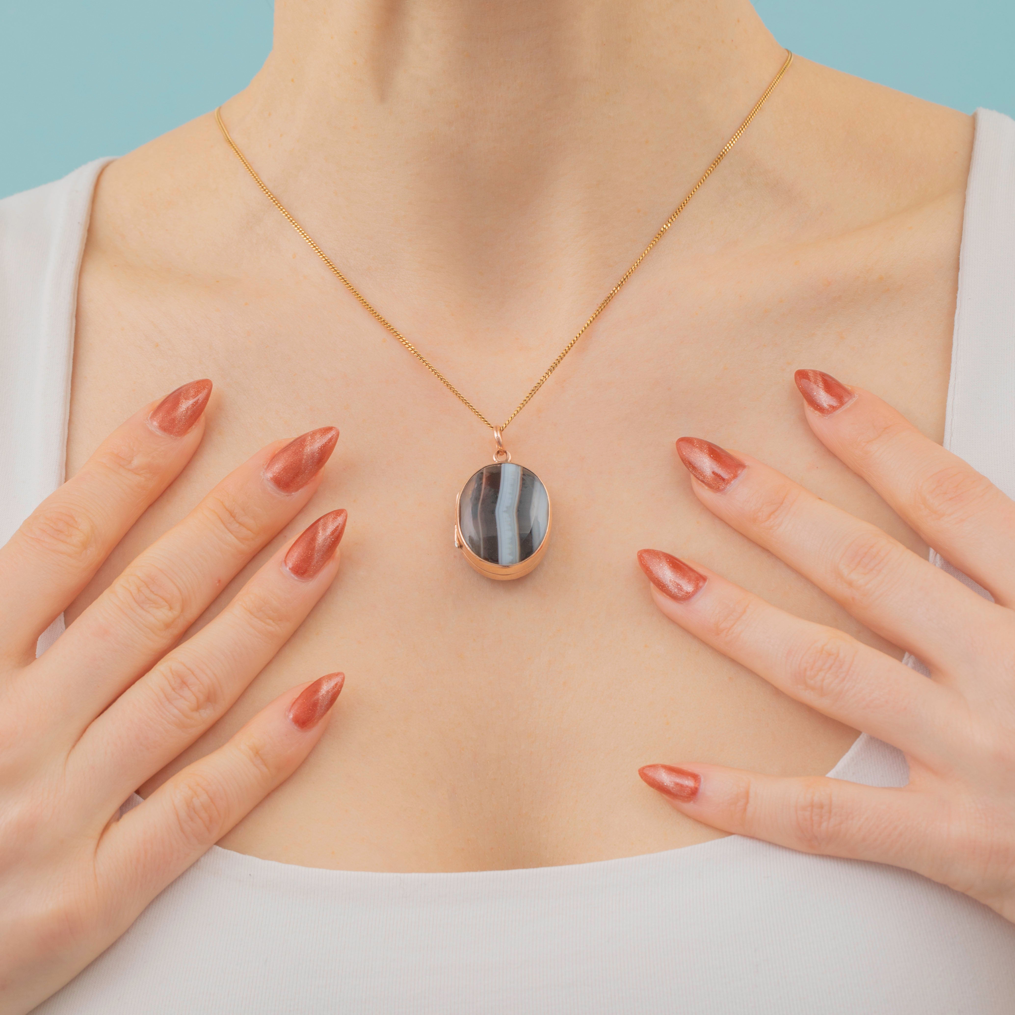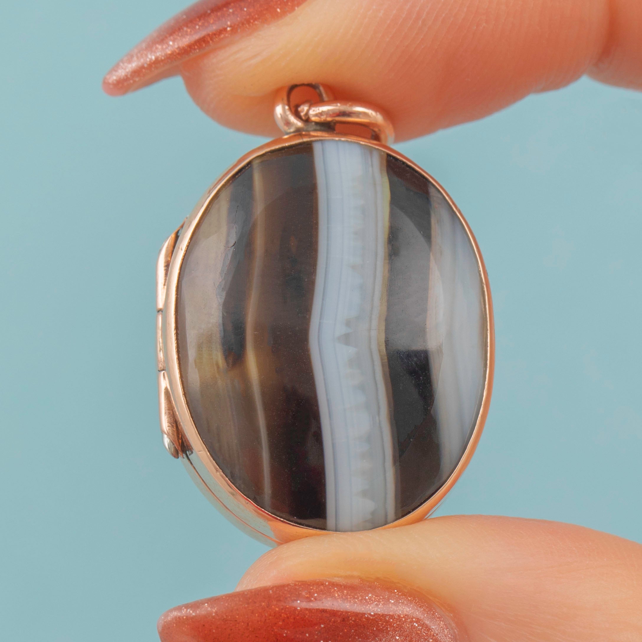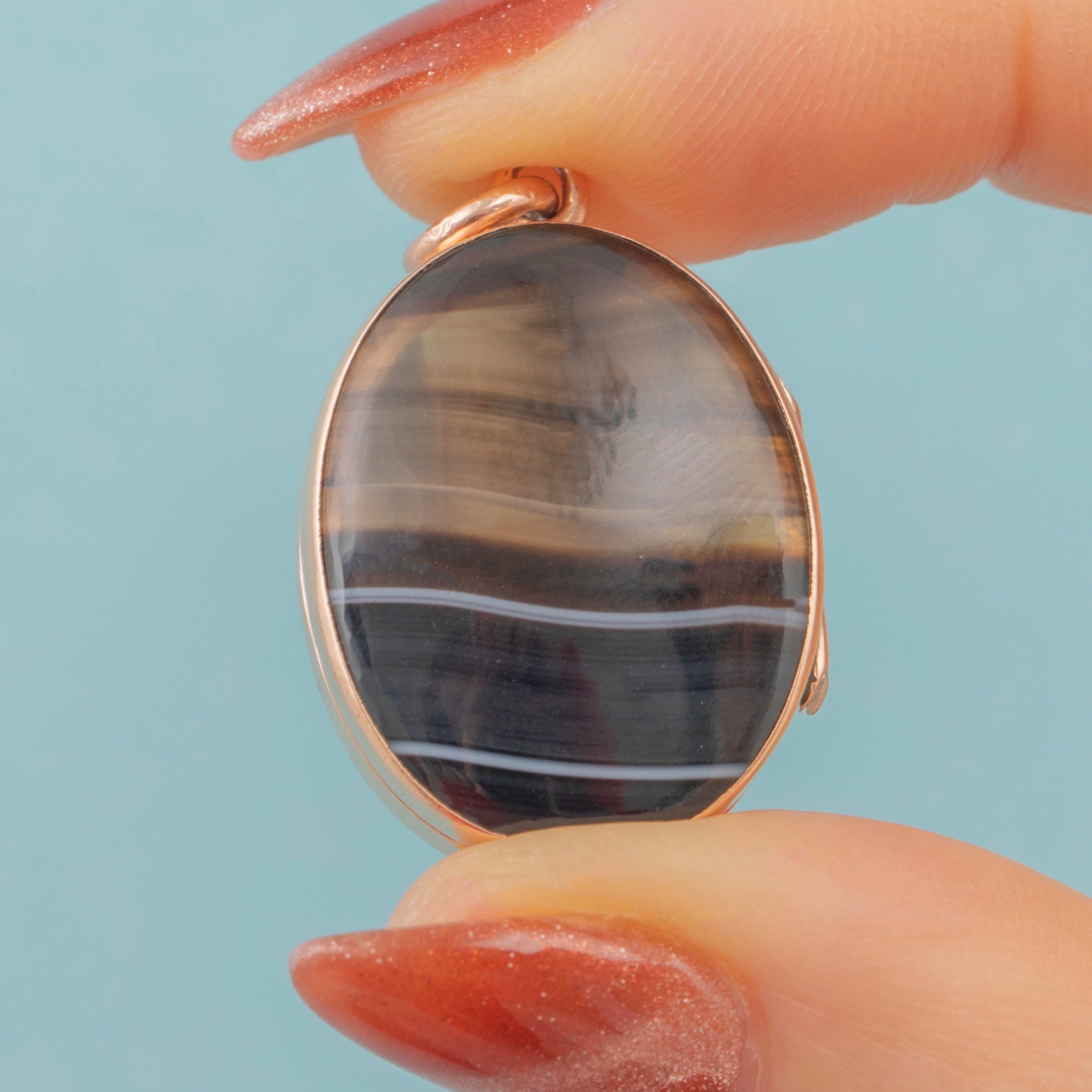 Both her back and front are crafted from stunning banded Agate stones, each an amalgamation of cool earthy tones, from black and brown to contrasting white and grey, effortlessly complemented by the warmth of her rosy 9ct Gold locket settings.