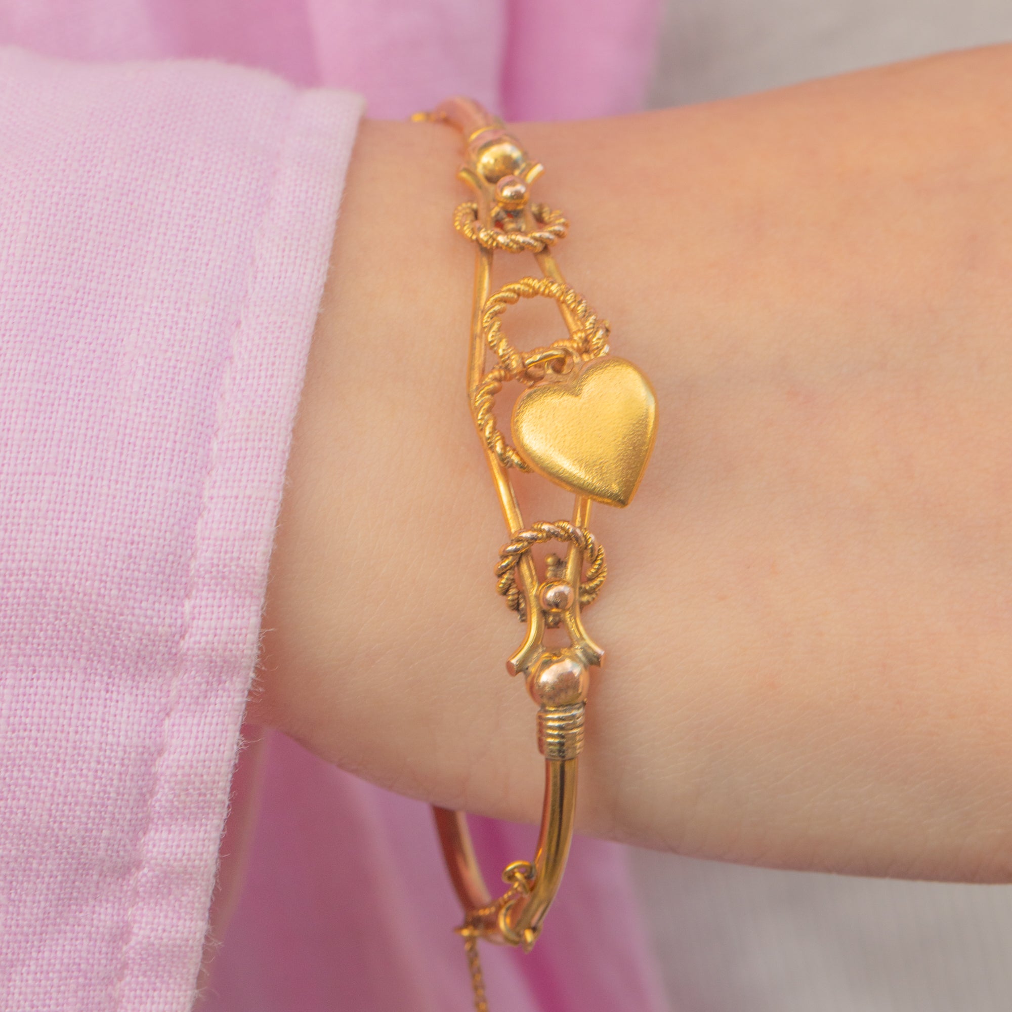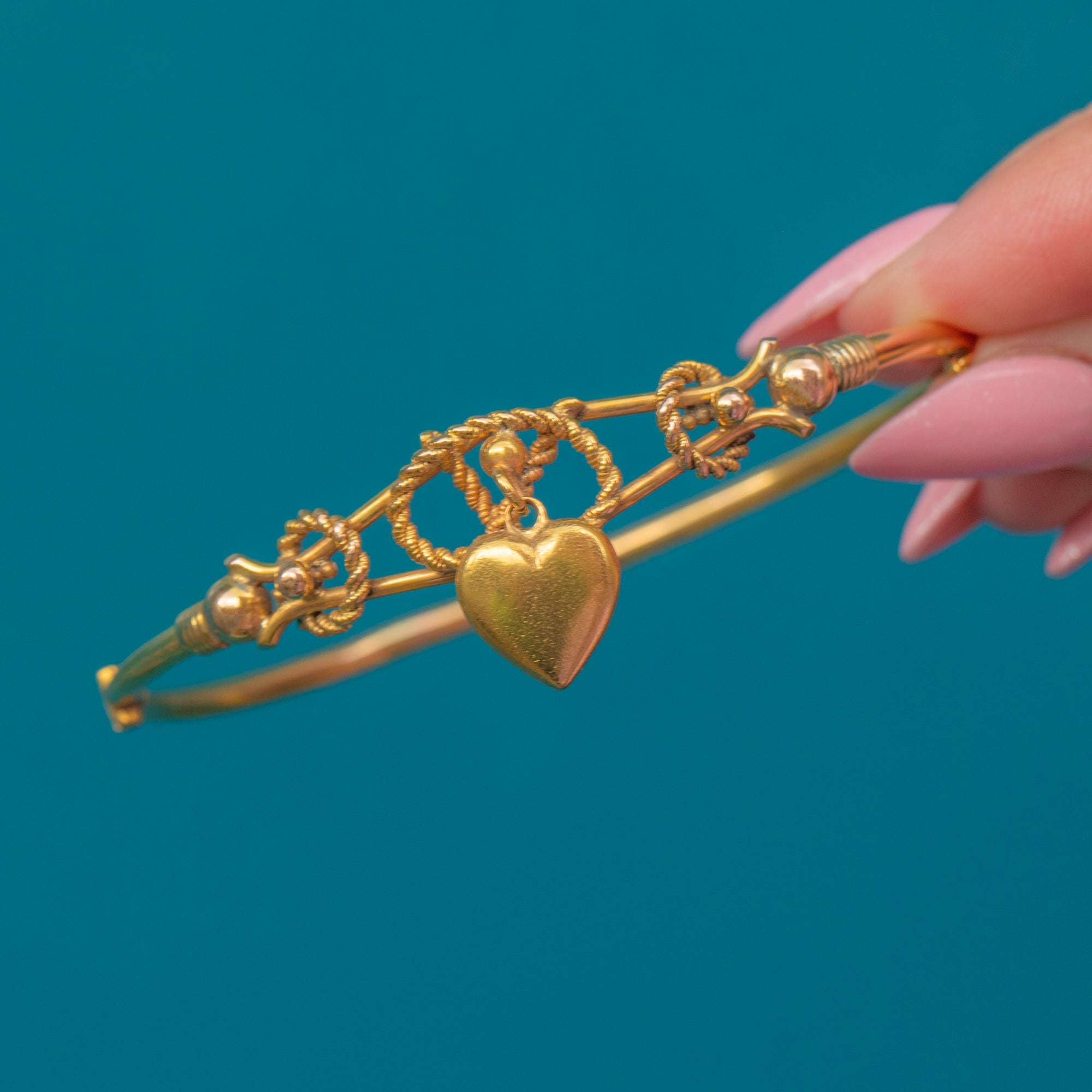 This Victorian 9ct Gold bangle exudes antique elegance, adorned with a playful puffy heart charm that gives the piece a feeling of life and movement.