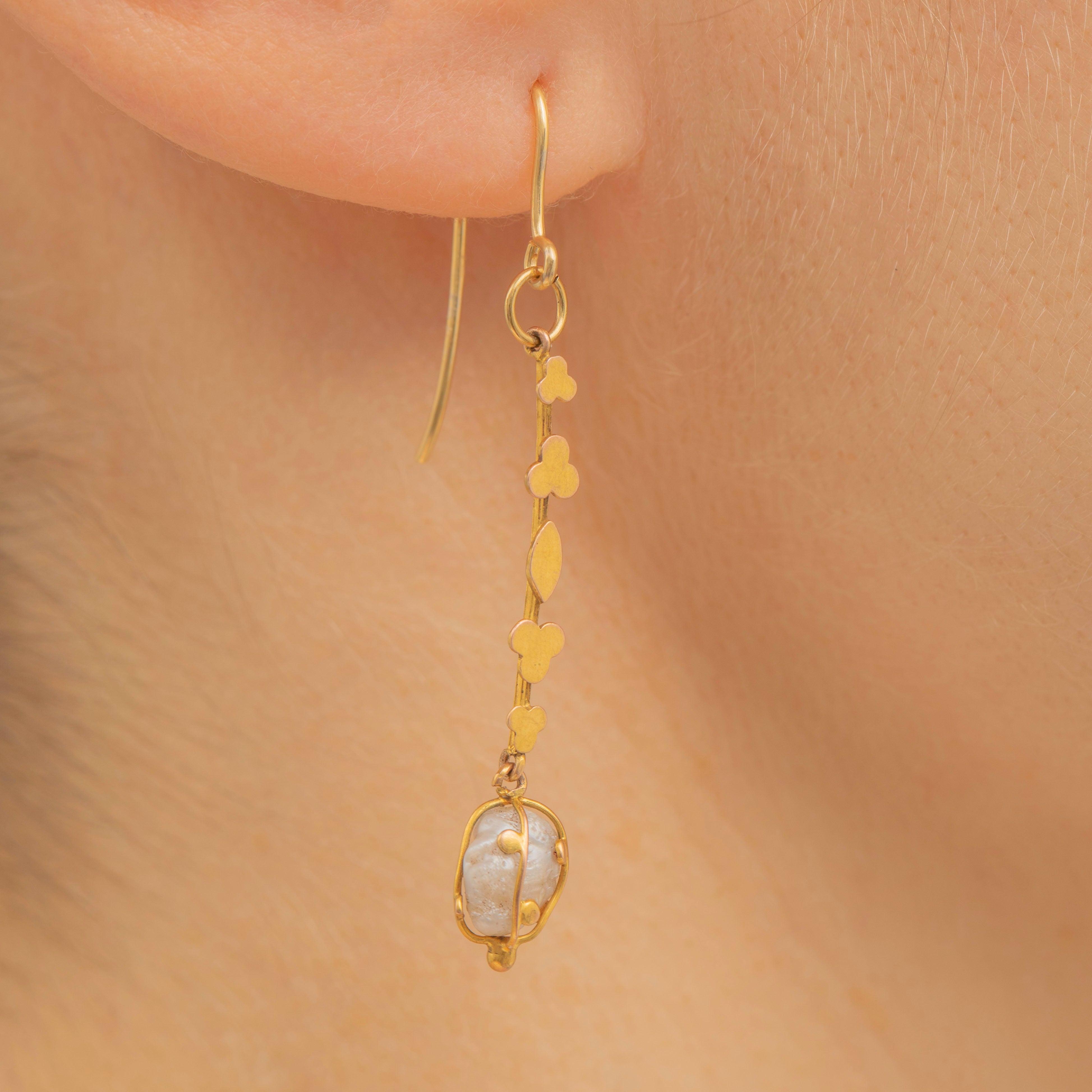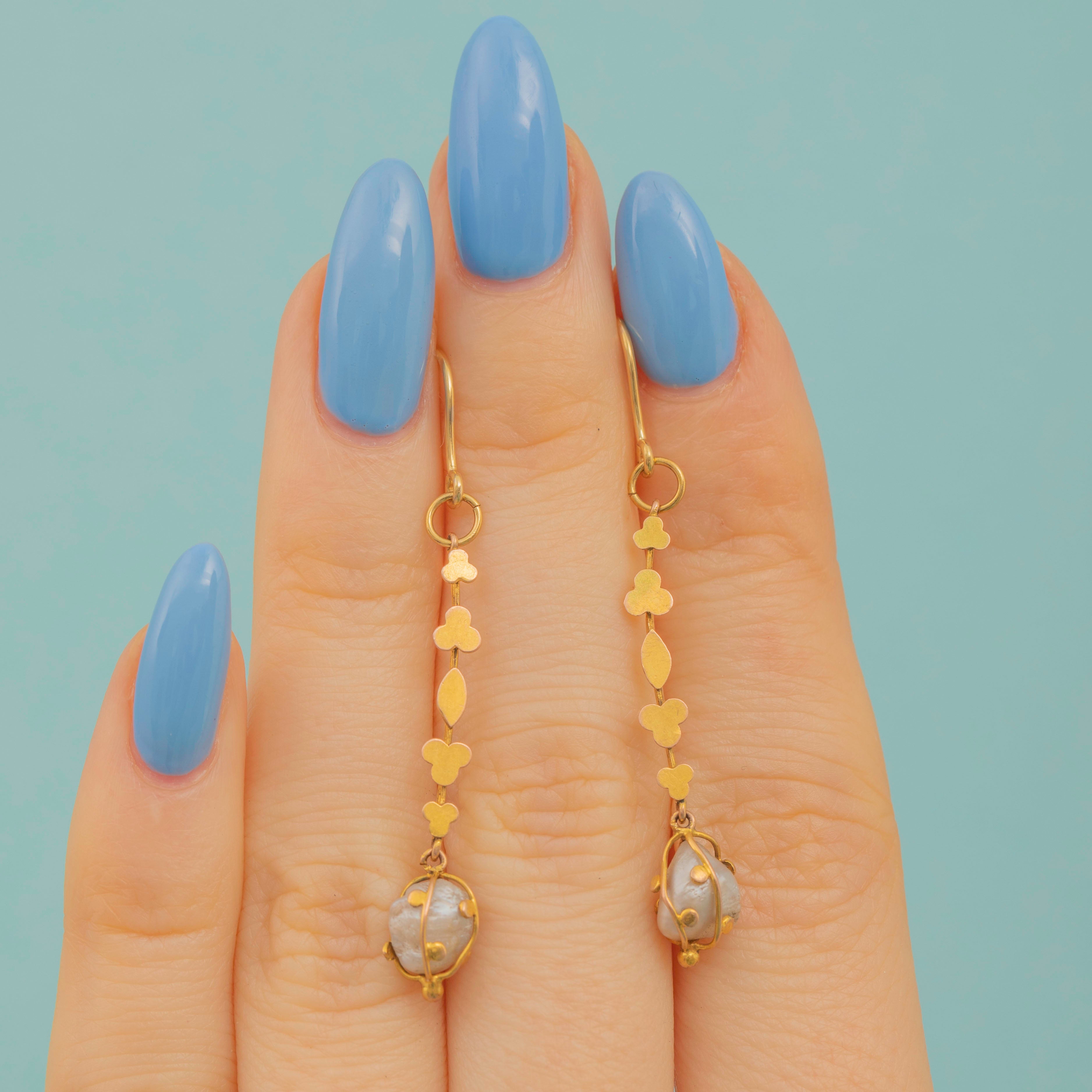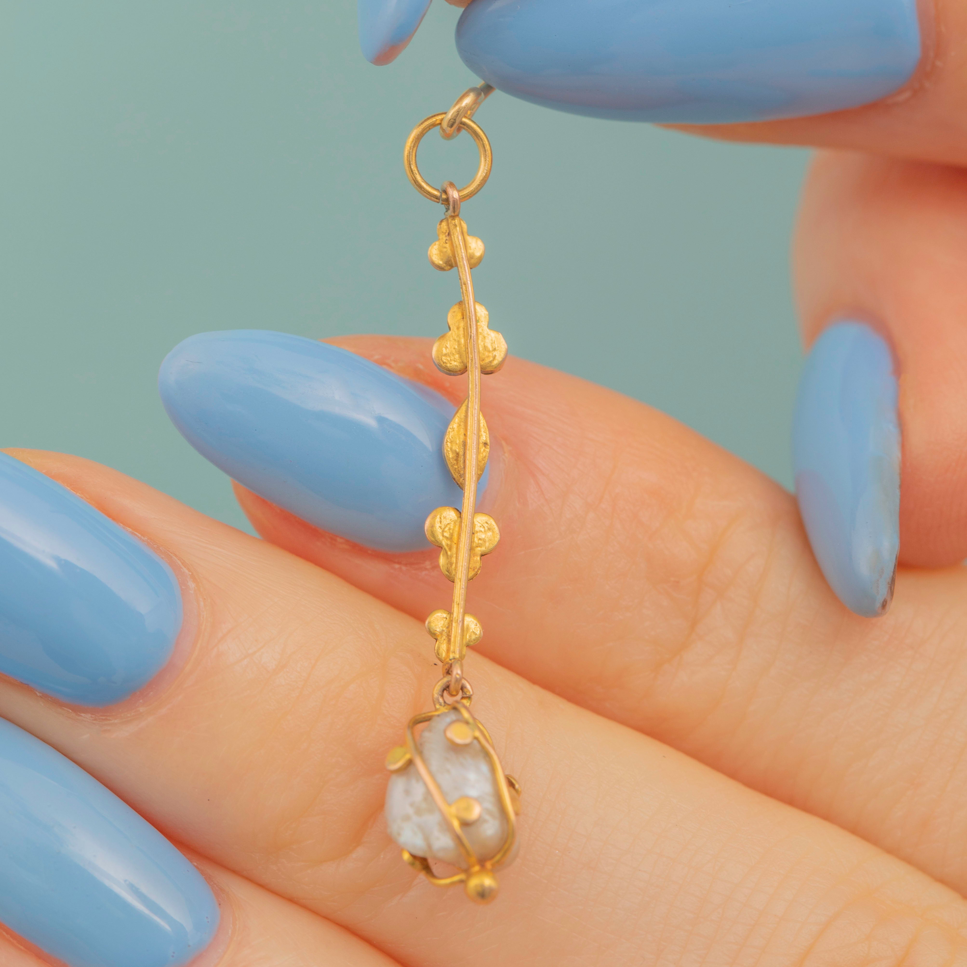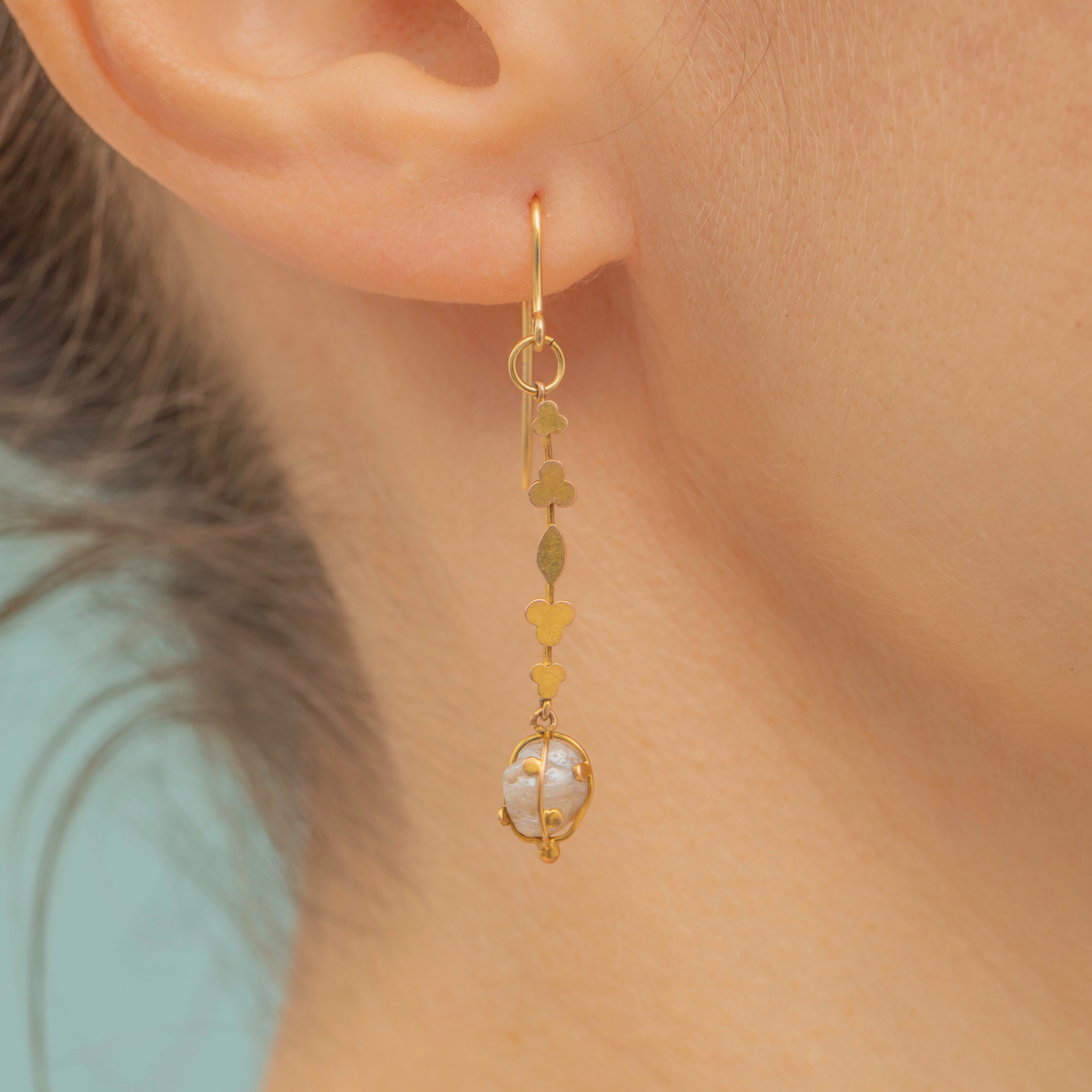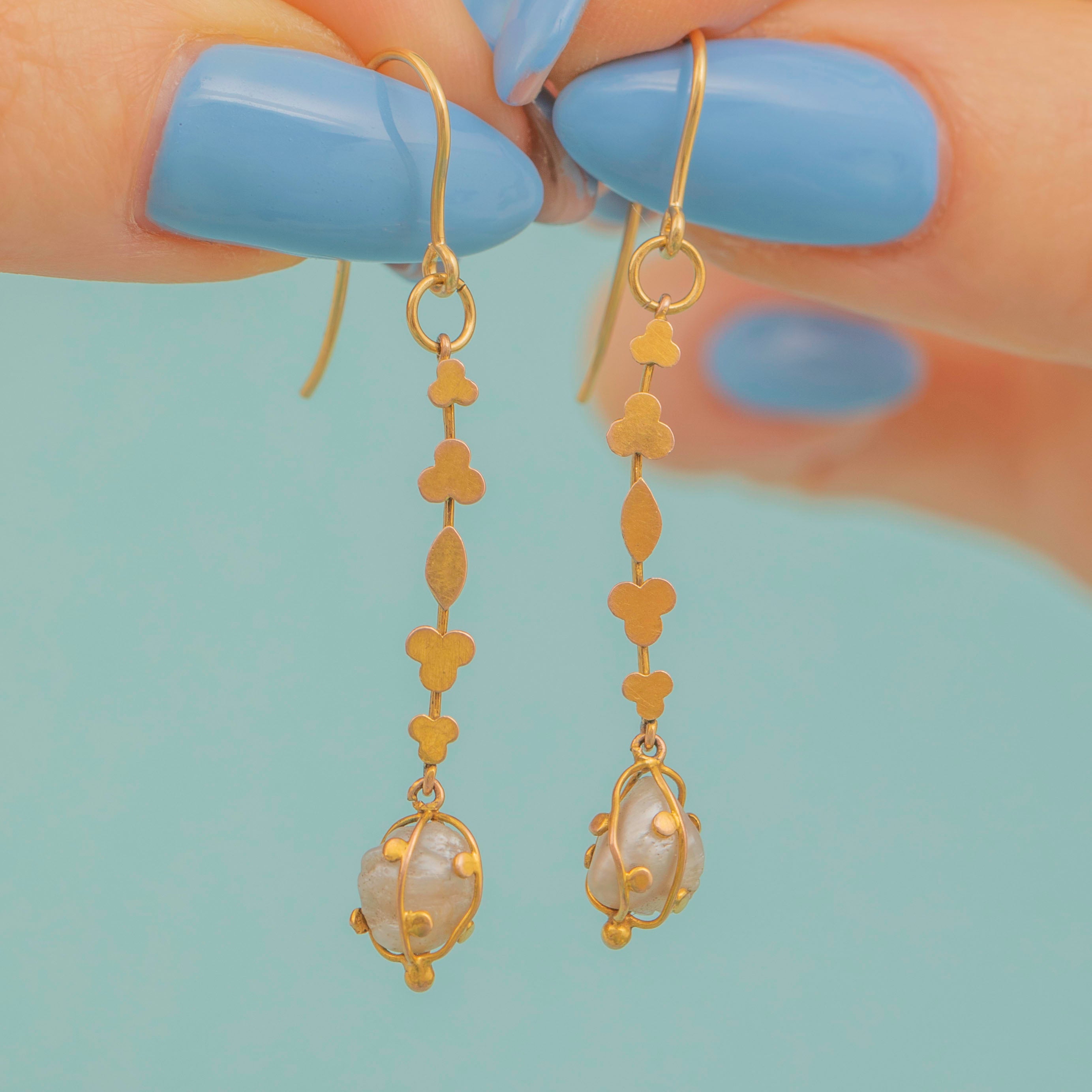 EXCELLENT. With very little to report, these antique 9ct Gold Baroque Pearl drop earrings are in excellent condition. The Baroque Pearls give the most intriguing luminous glow and remain secure in their cage settings. The Gold is brightly saturated and the details have are securely connected, promising many more years of wear and enjoyment!