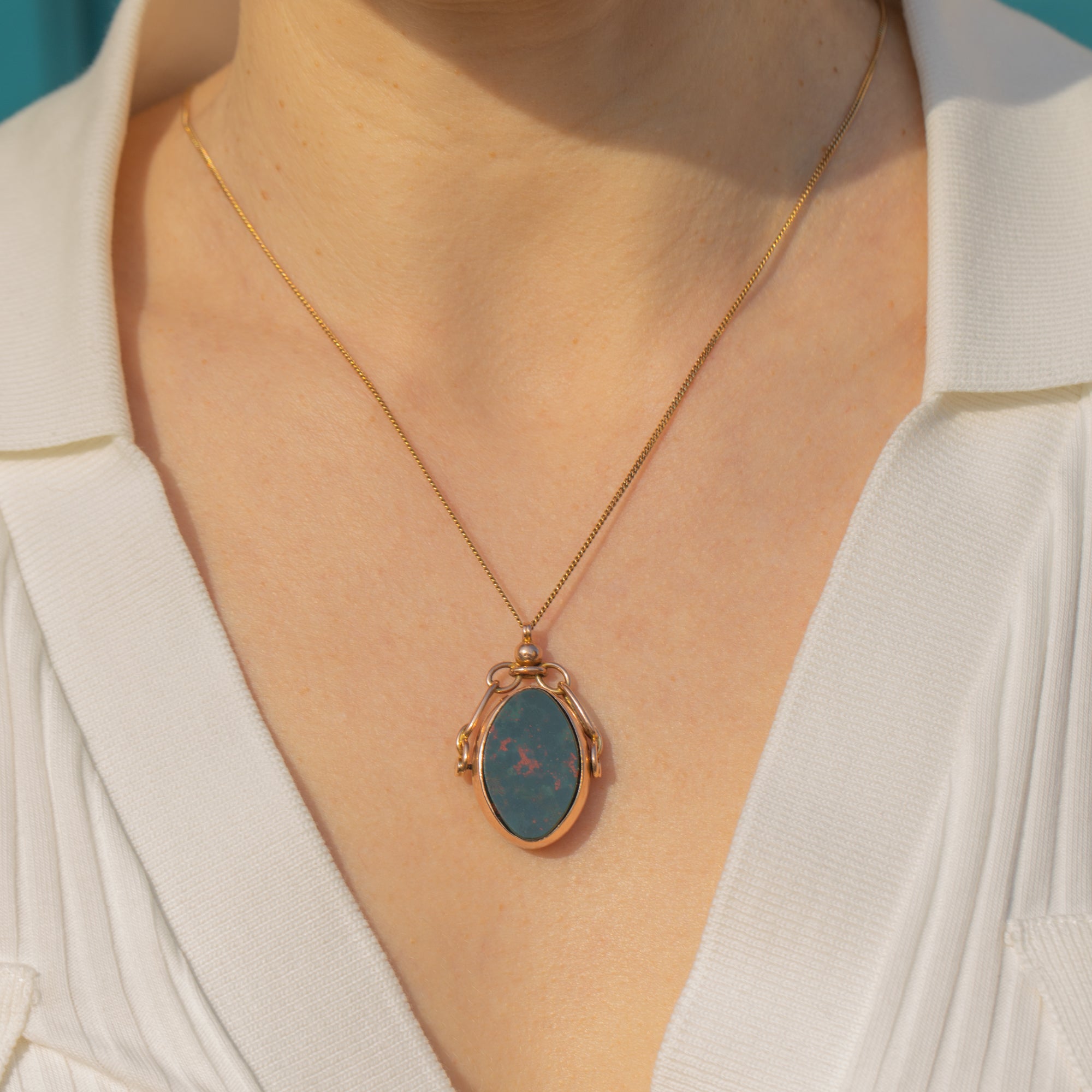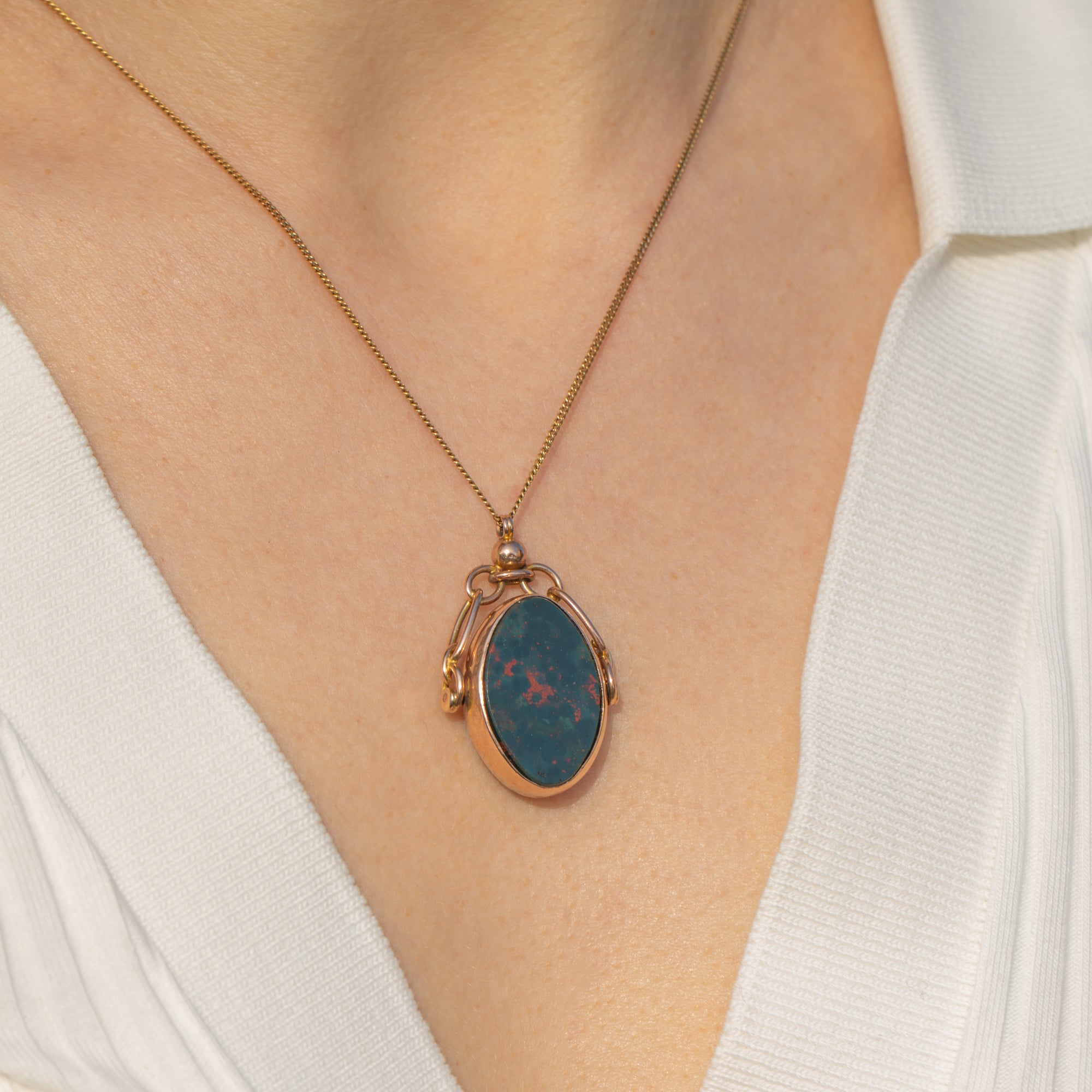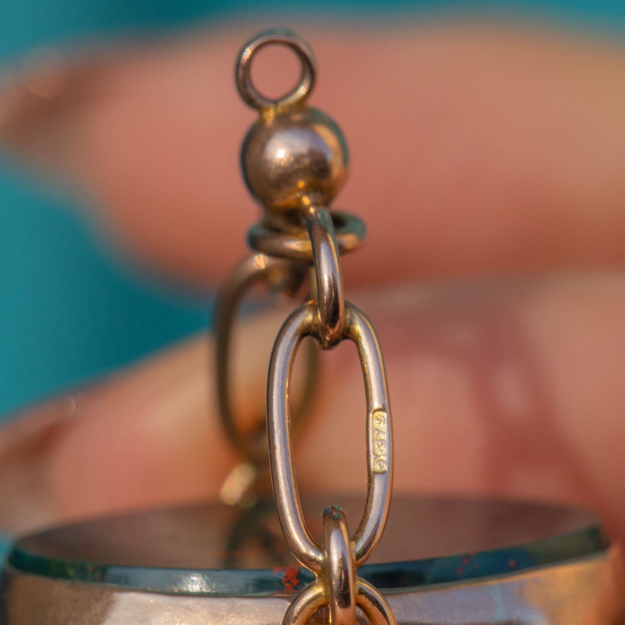 This antique 9ct Gold Bloodstone Carnelian spinner fob pendant is full of charm! Crafted from rosy-hued Gold with a decorative chain-link bale, this antique spinner fob displays a dark forest green Bloodstone on one side and a deep mahogany Carnelian on the other.