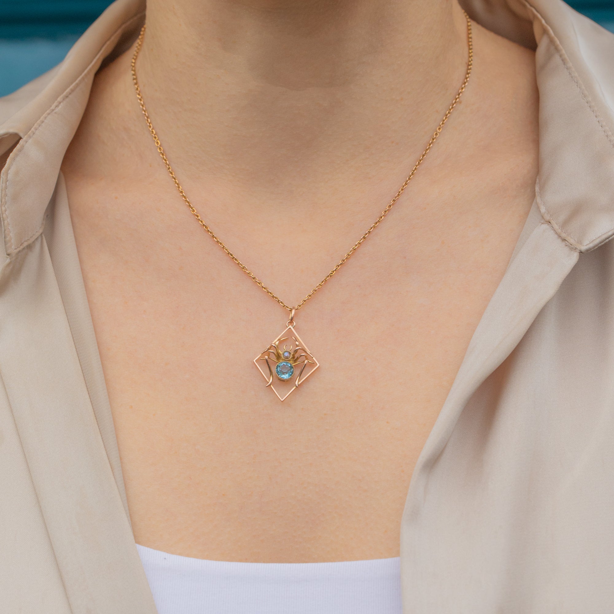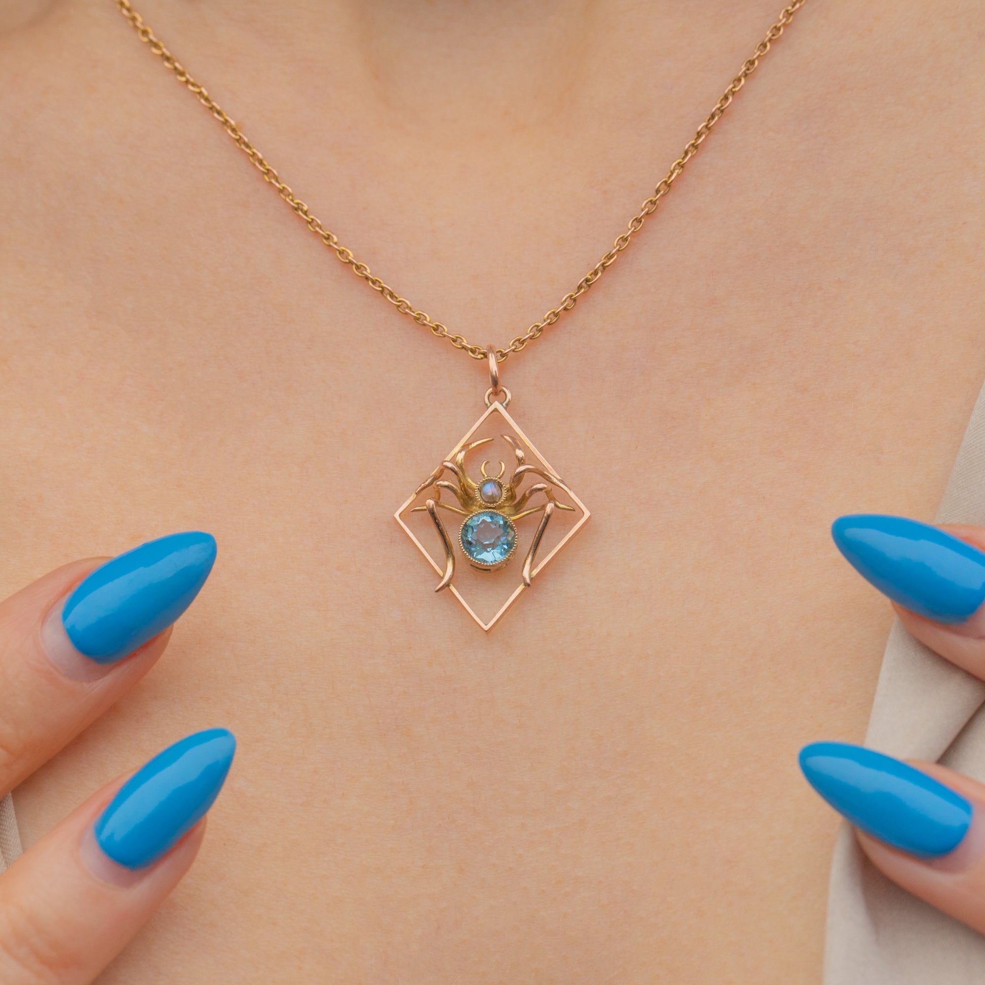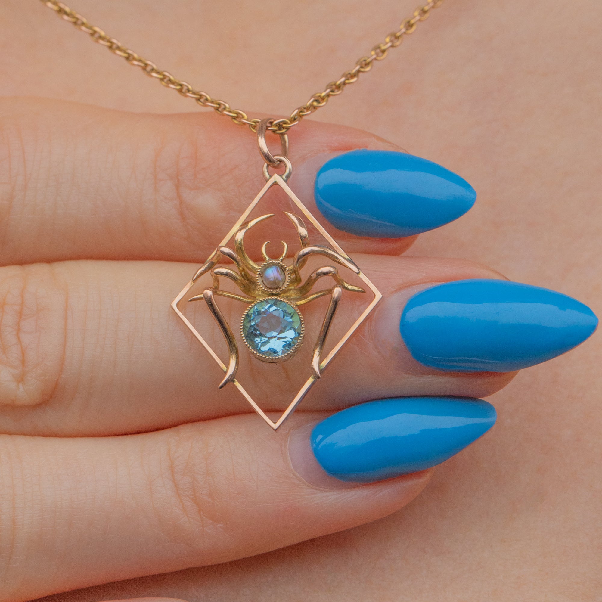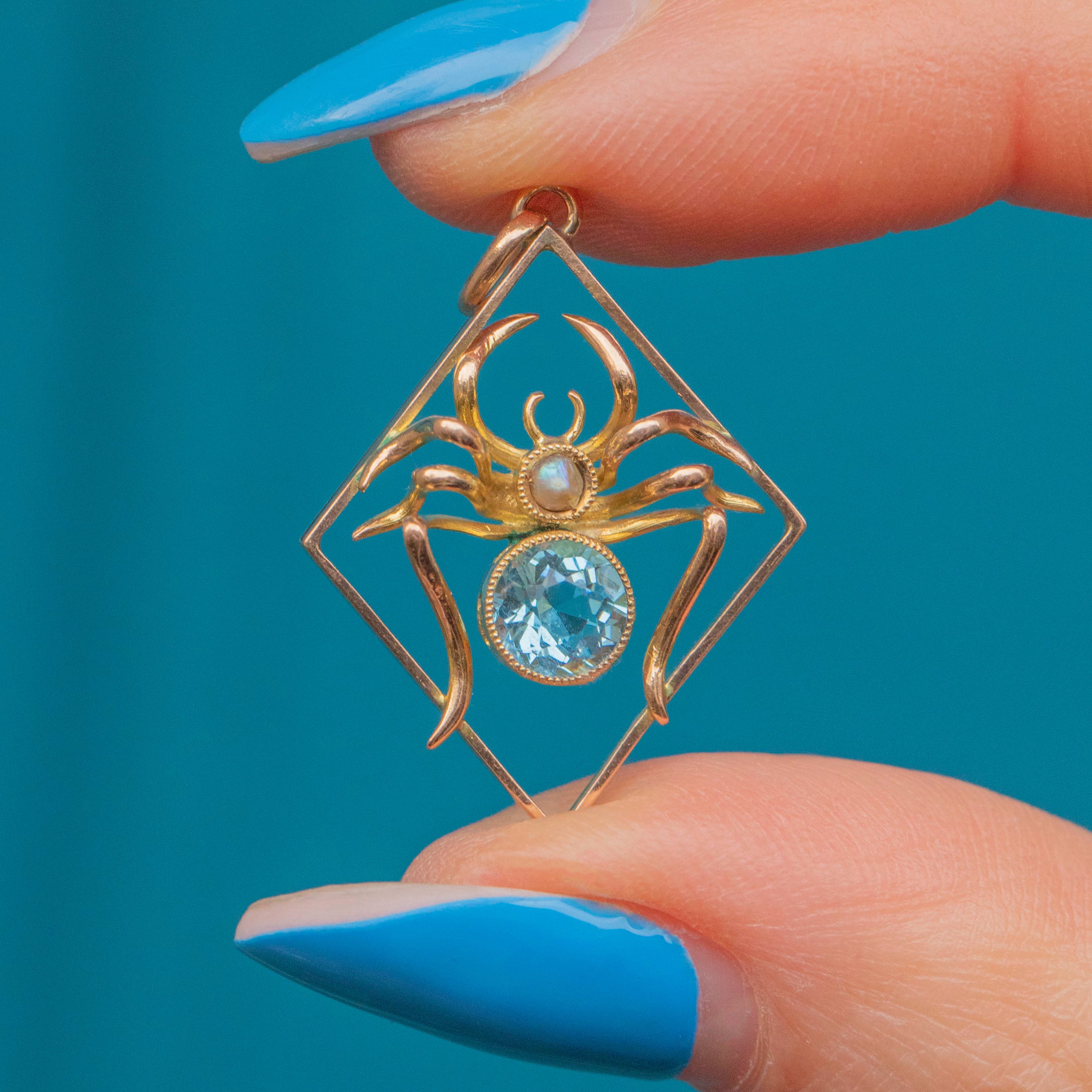 Exuding crisp aqua blue hues, her faceted blue Paste magically twinkles in the light, and is effortlessly complimented by her creamy Pearl. Set within buttery 9ct Gold settings, you will want this lightweight spider pendant to spin her web around your décolletage!