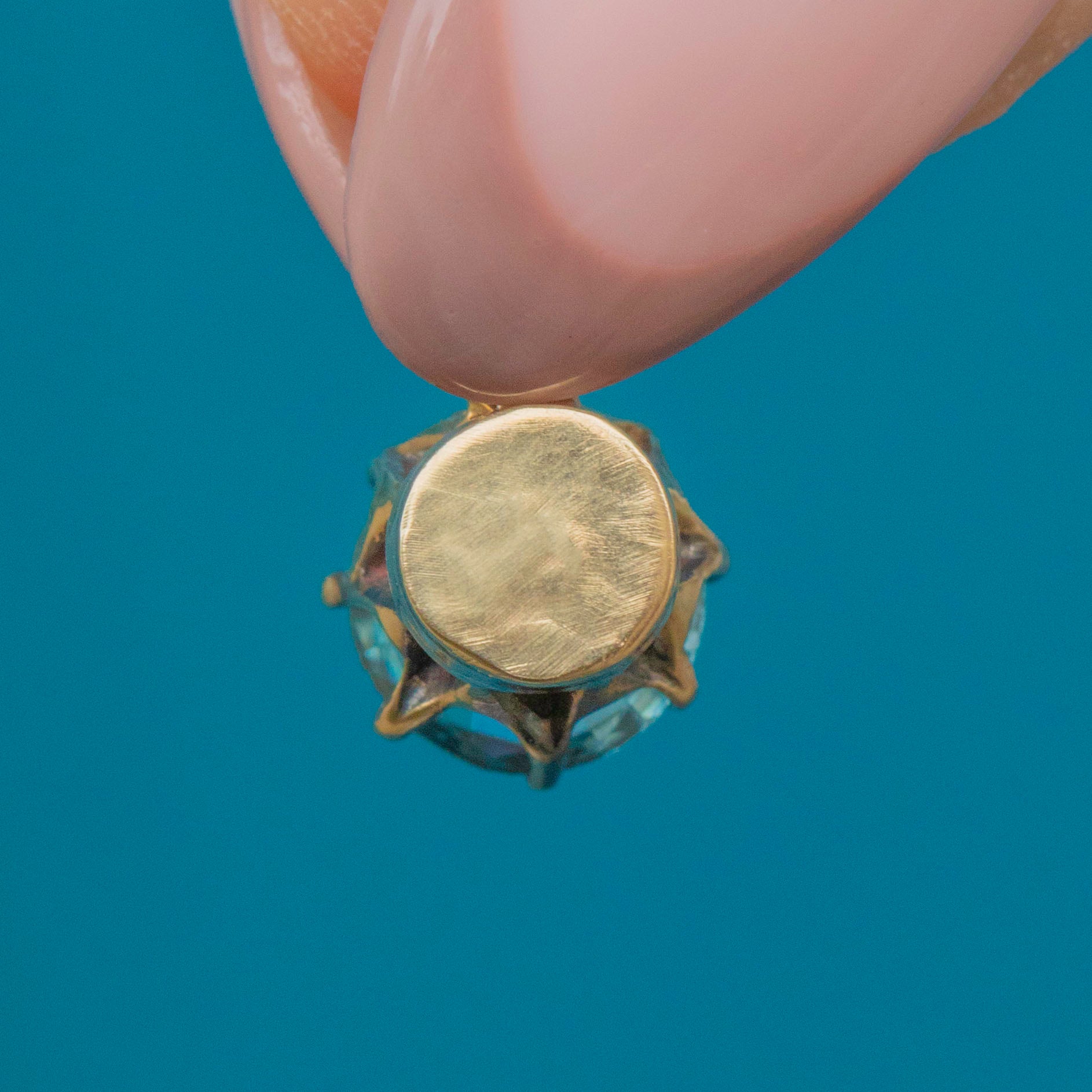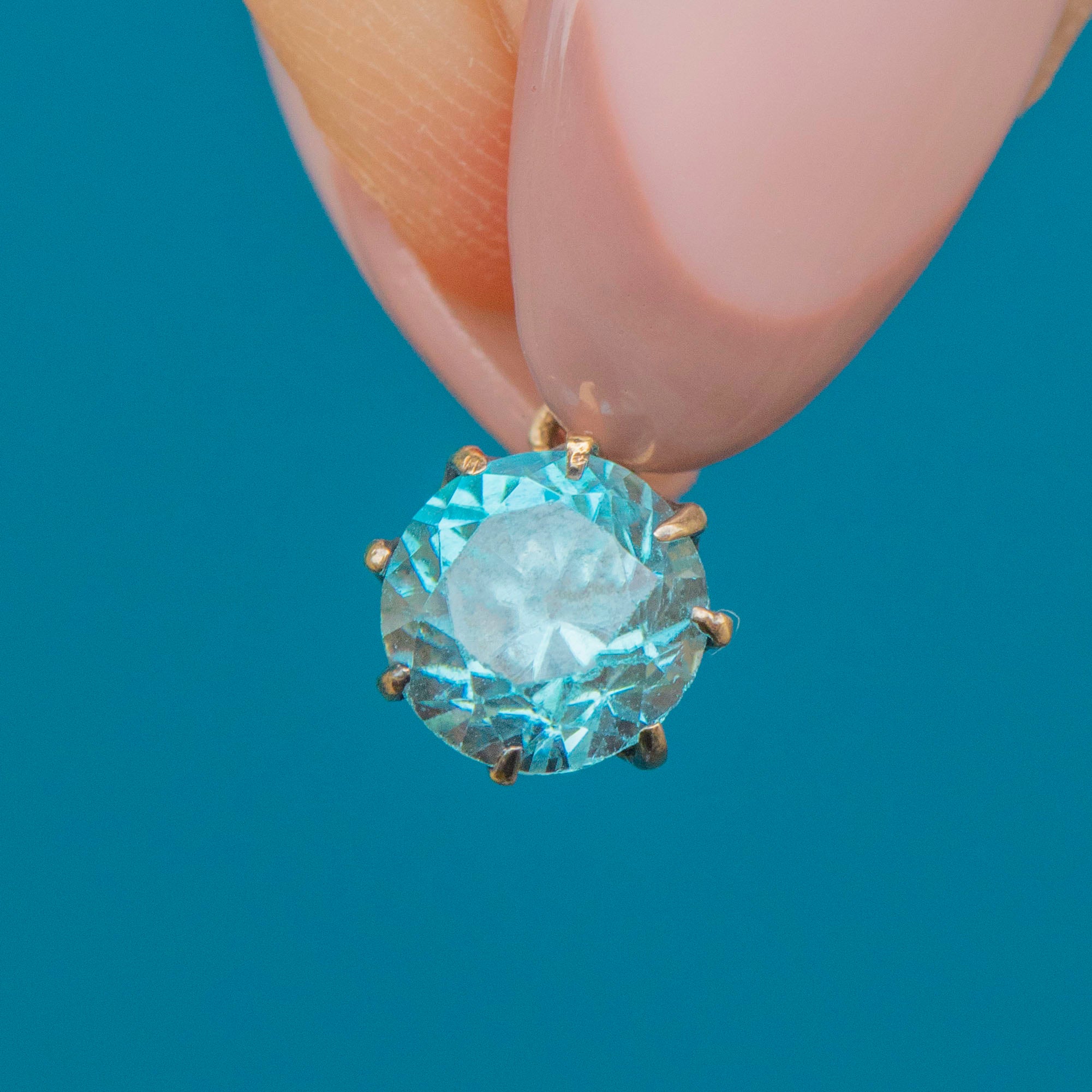 VERY GOOD. This antique 9ct Gold blue Zircon charm is in very good condition. The Zircon is radiant and free from chips or abrasions. When looking side-on, the Zircon doesn't sit flush within its setting, however, there is no movement and it is securely set. The Gold is buttery and the gallery intact, with each white Gold claw present and robust.
