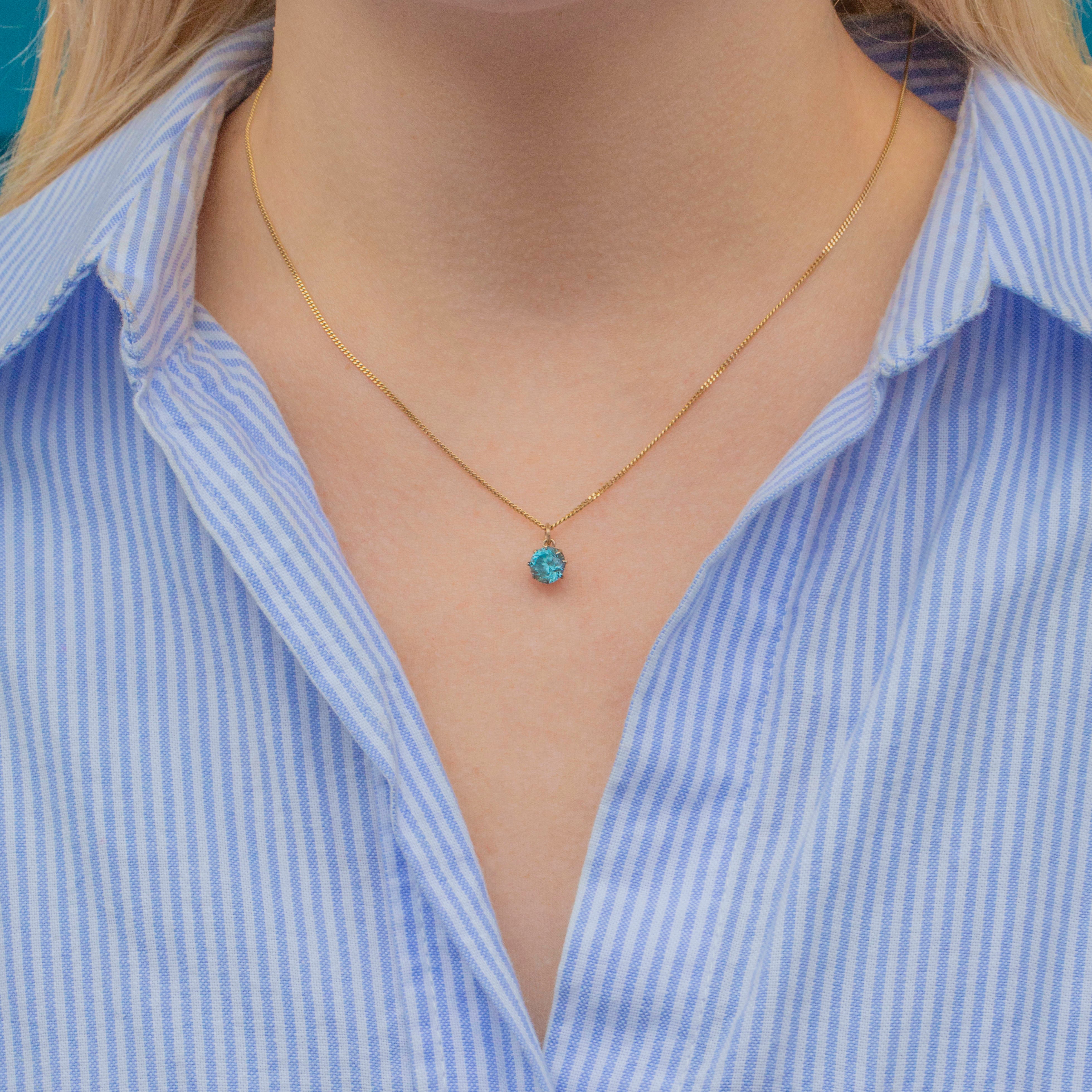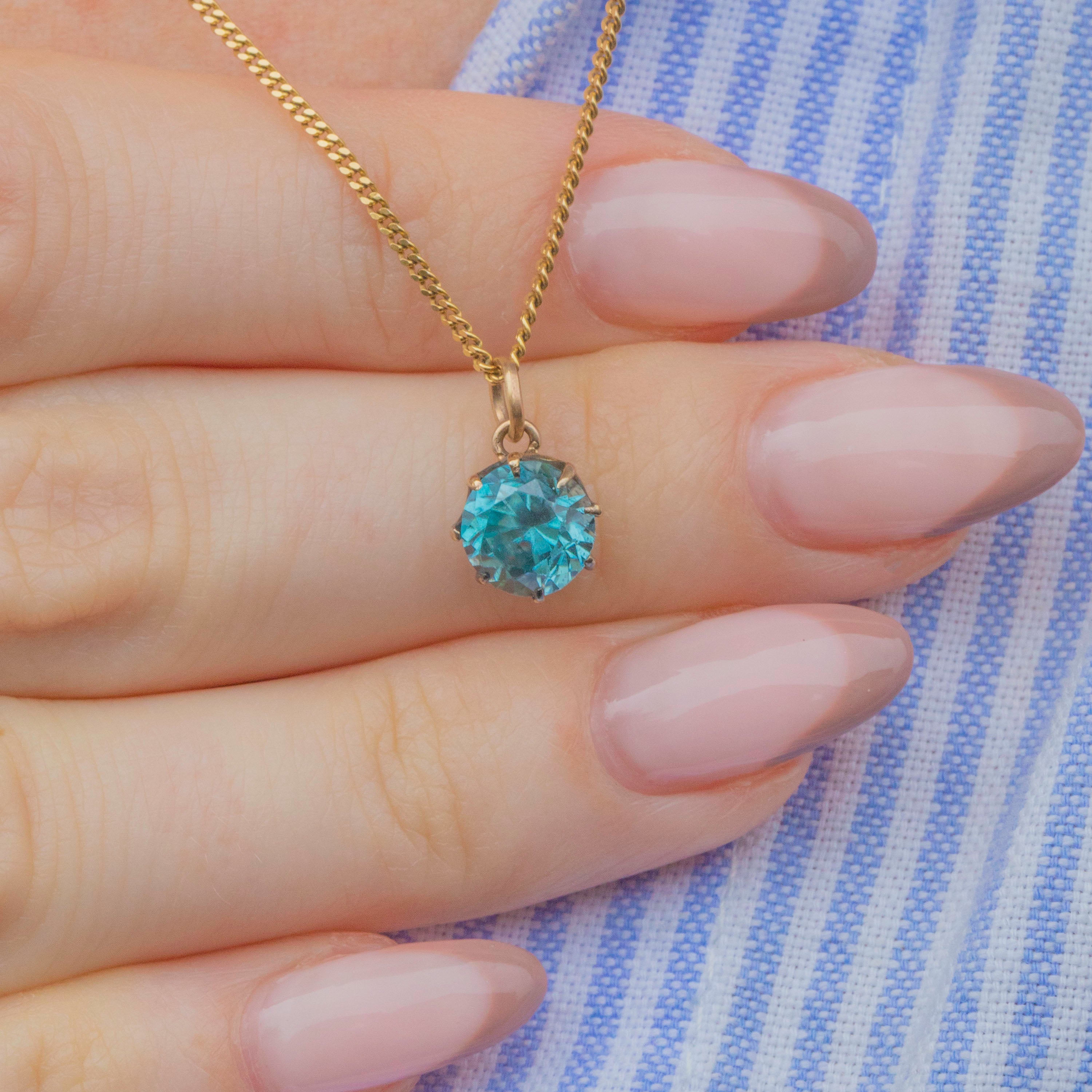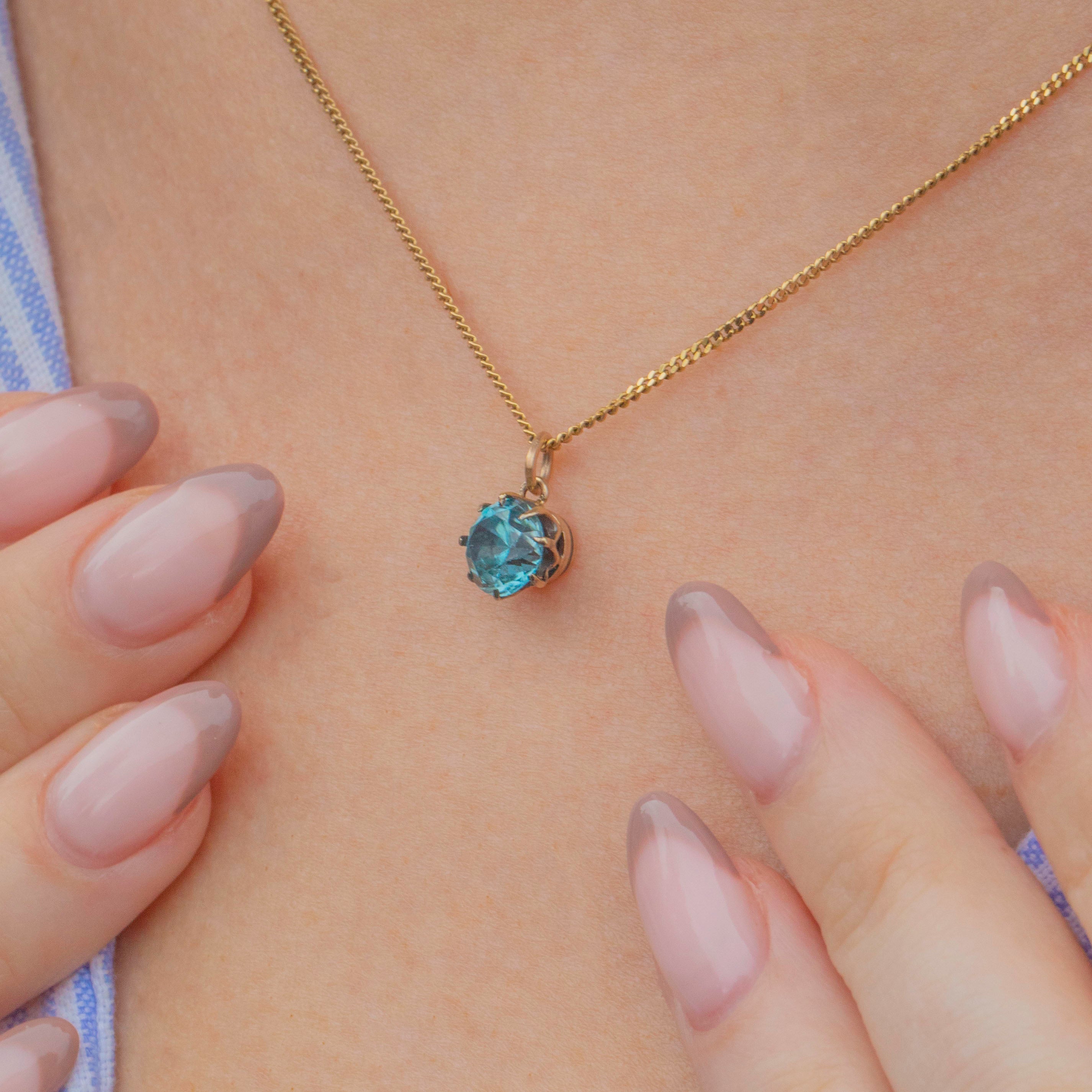 Add a vibrant pop of colour to your décolletage with this antique 9ct Gold blue Zircon charm! Exuding a bright scintillation, the 2.13ct Zircon bursts with a delightful celeste hue and is displayed within white Gold claws for a refined finish.