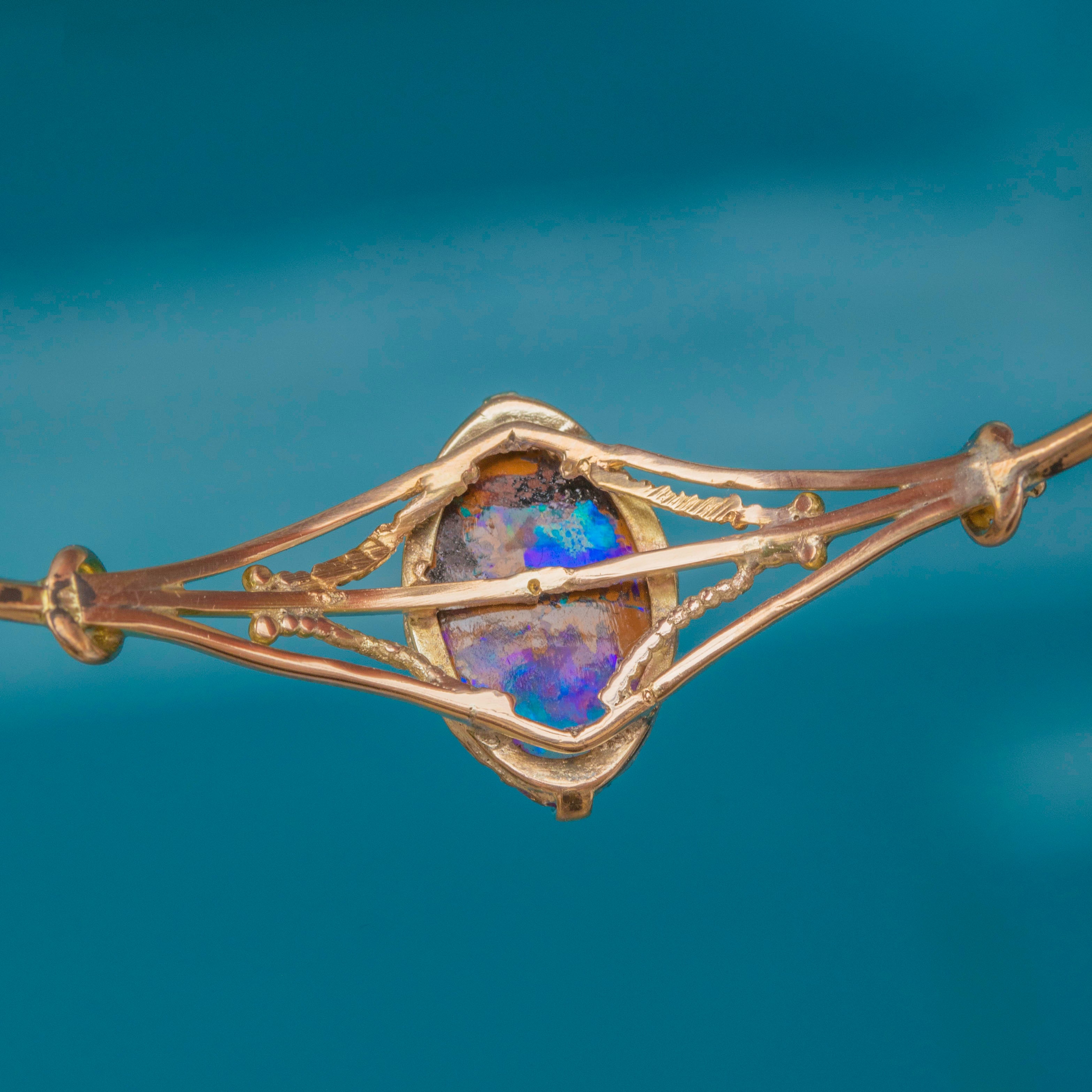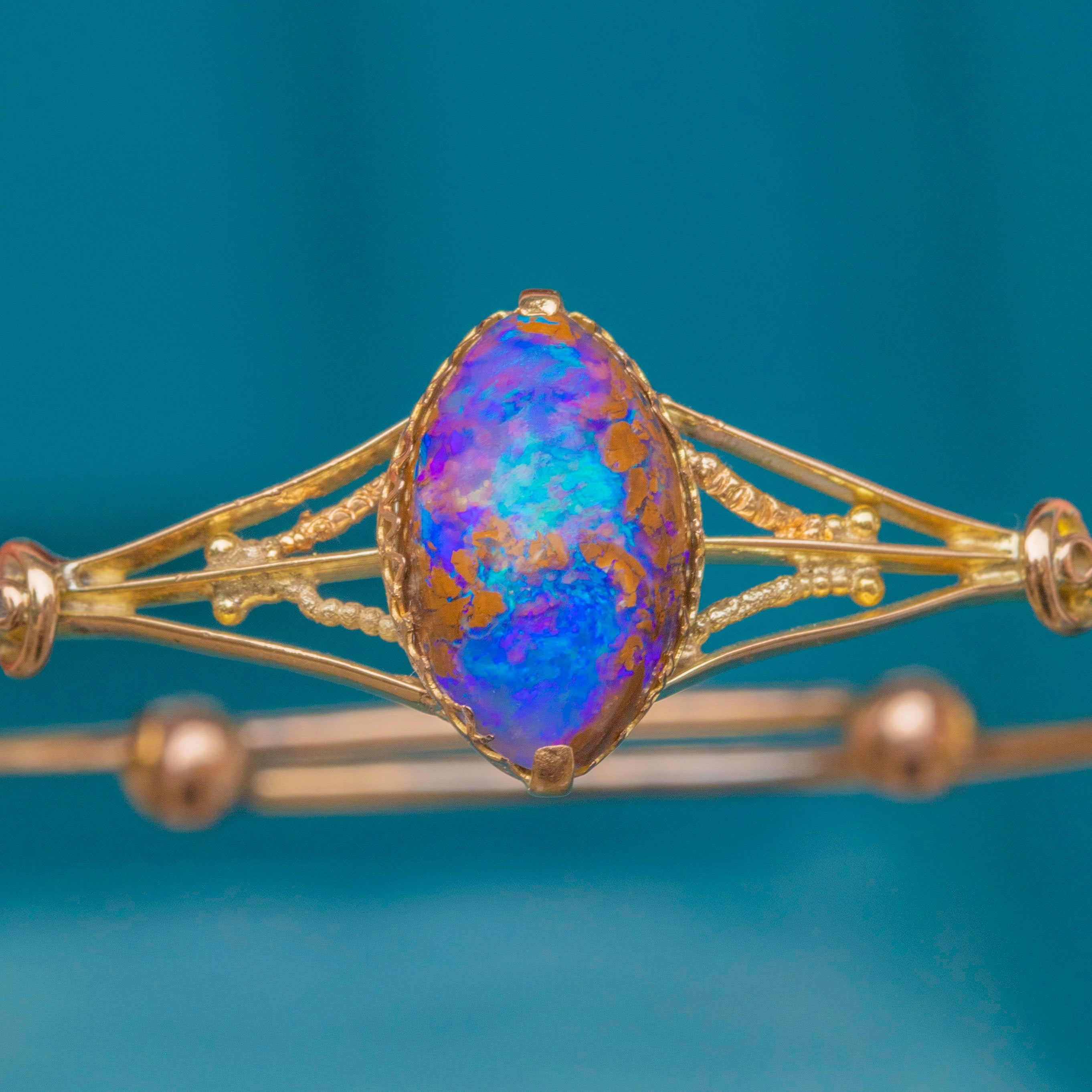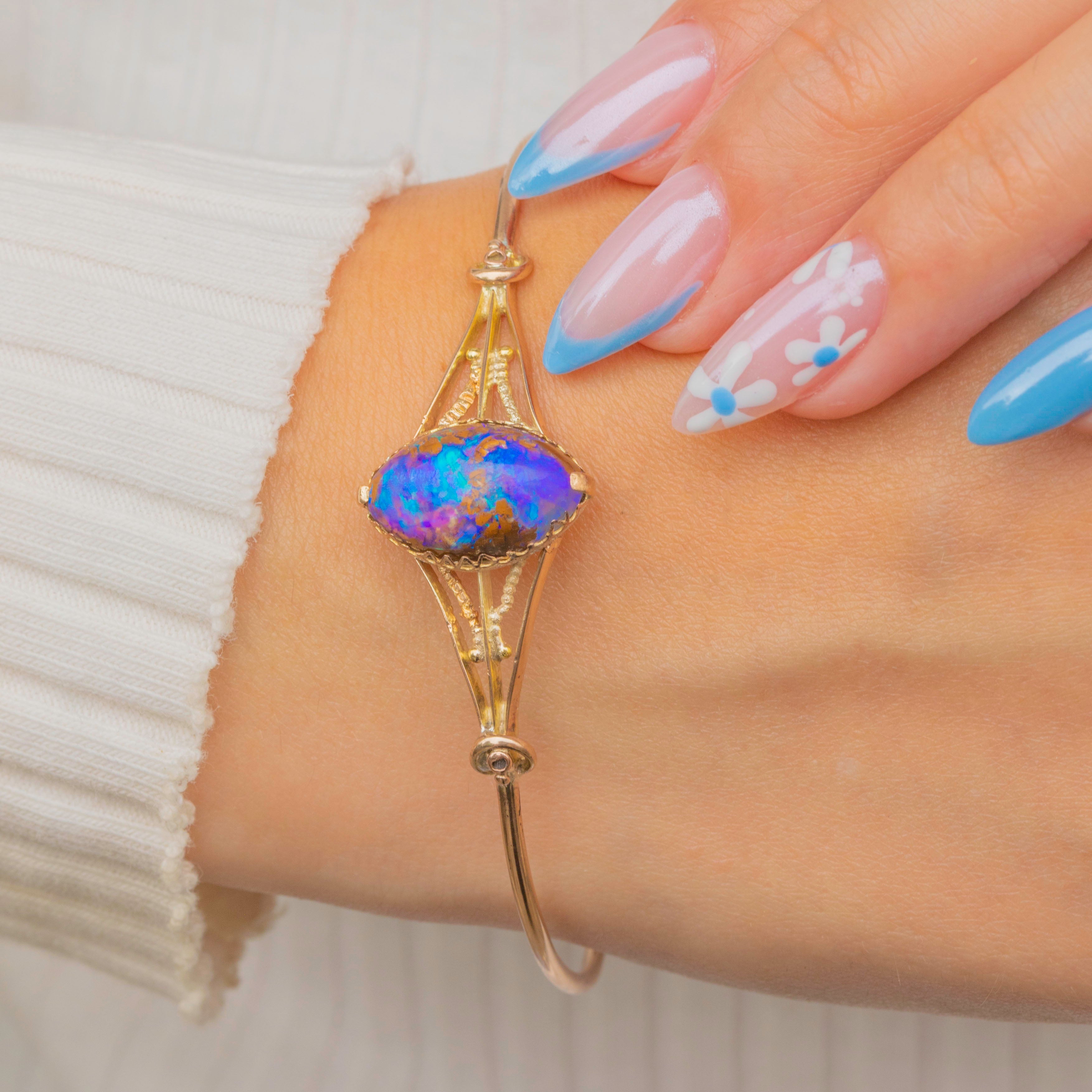 VERY GOOD-EXCELLENT: The Gold is bright and glossy, with the extendable back providing a comfortable wear. The Boulder Opal is stunning and set securely in its bezel. There is some minor wear to the back of the Gold settings, though this cannot be seen when wearing. With little else to note, this antique bangle can be worn with confidence.