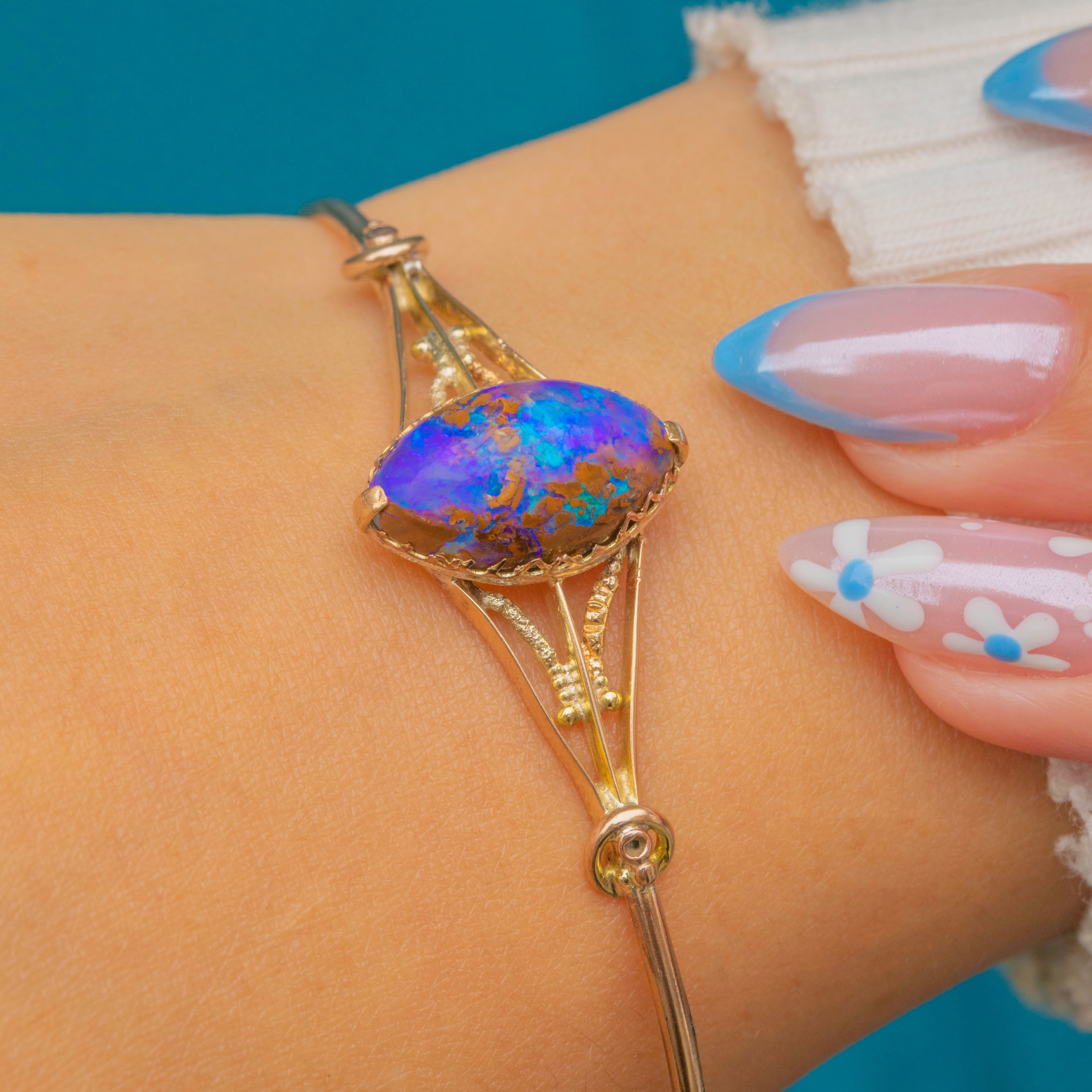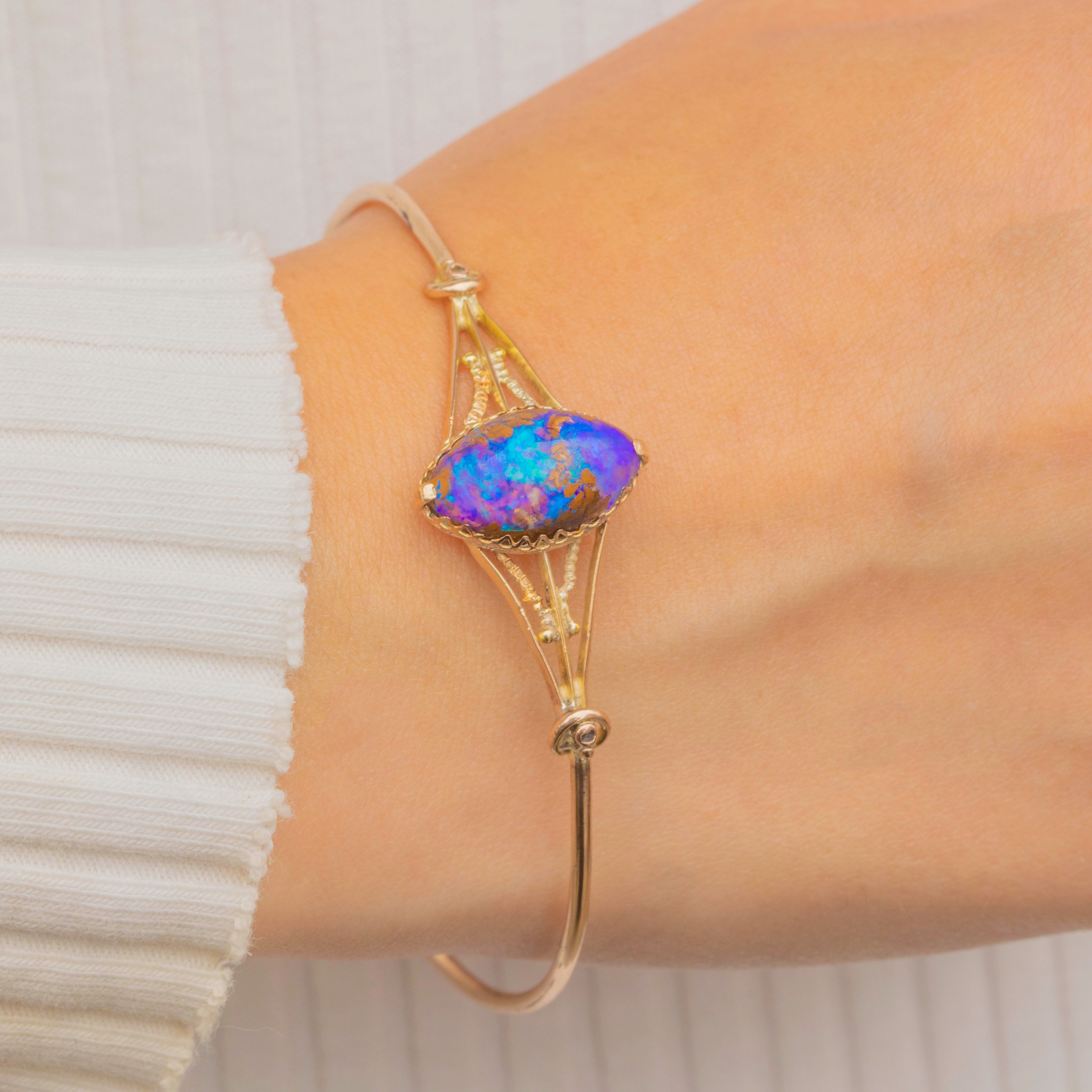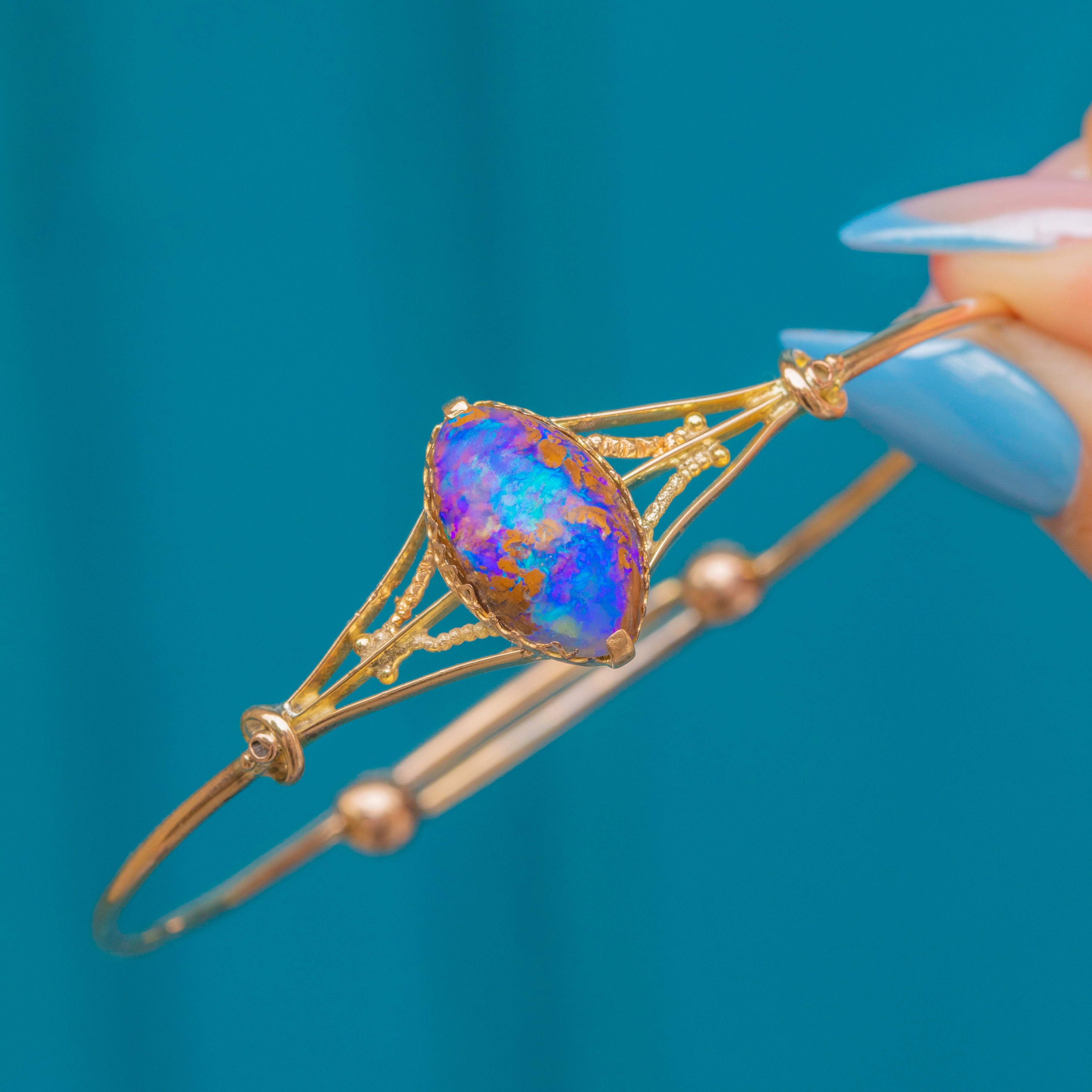 This elegant Victorian bangle is centred by a stunning natural Boulder Opal cabochon, radiating striking saturated purple tones with an iridescent sheen throughout. It features a myriad of natural inclusions and is set in a glossy Gold bezel, adorned by striking shoulders.