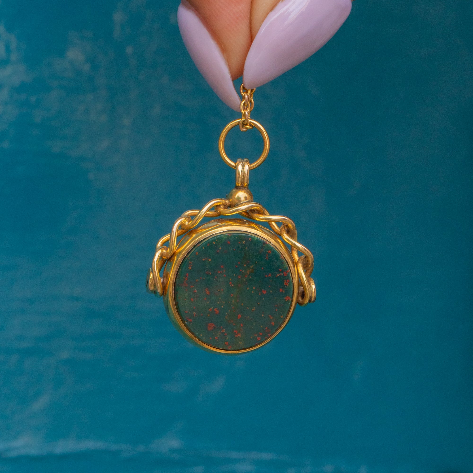 VERY GOOD TO EXCELLENT. This antique 9ct Gold Carnelian Bloodstone swivel fob pendant is in fabulous condition. The 9ct Gold is buttery and both stones are securely set. The Bloodstone has a minor chip on the side, but this is only noticeable under close inspection. The Carnelian is perfectly smooth, and free from nibbles or chips. The 9ct Gold has minor surface wear, but has remained bright and the hallmarks are crisp and legible. The swivel component is in perfect working order, so this piece can be worn and adored for many more years!