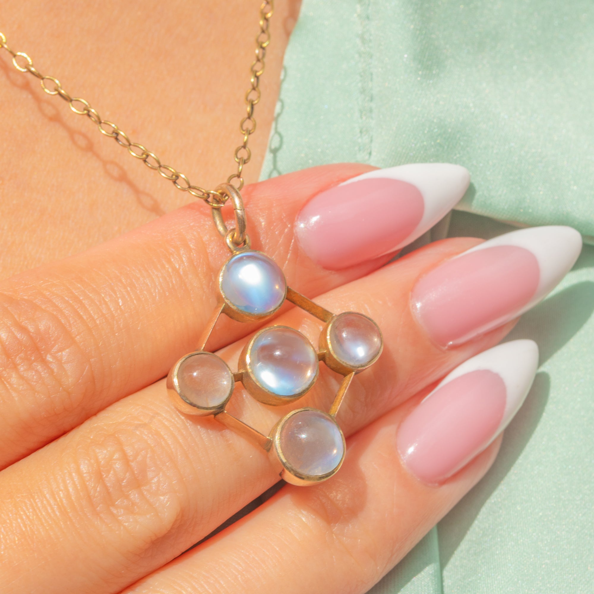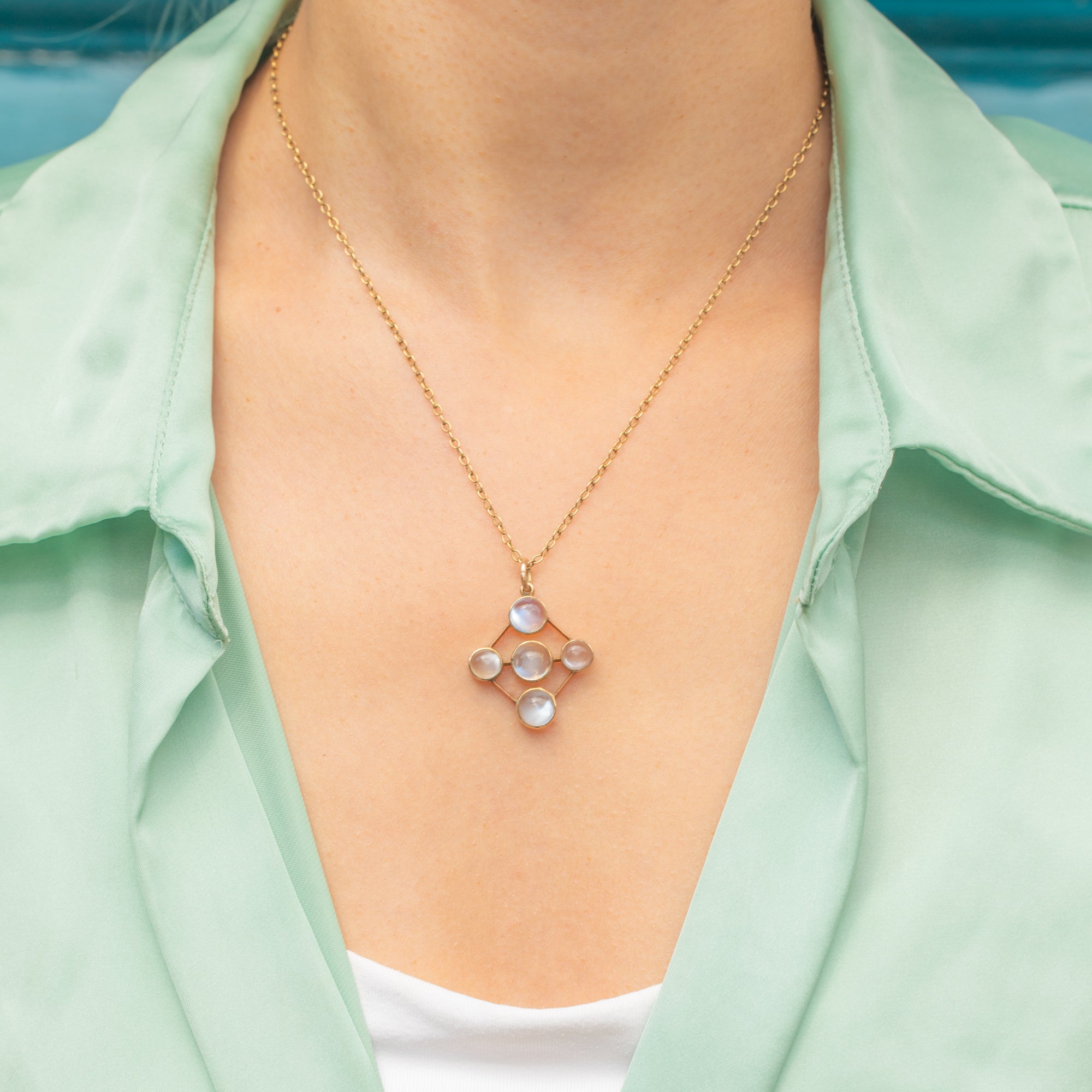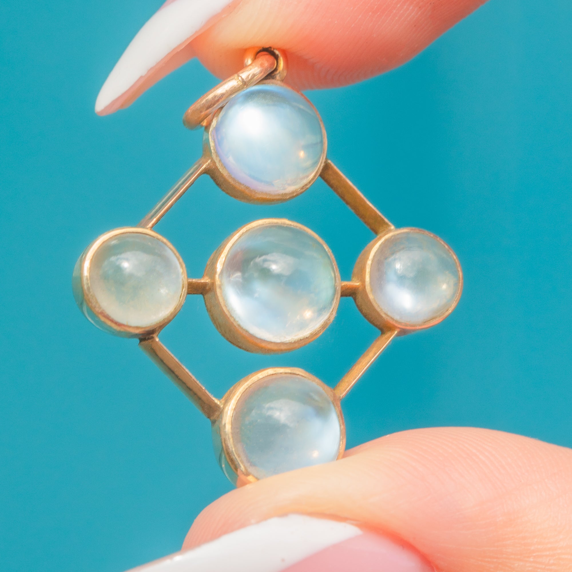 This Victorian pendant has been formed into a bold design, boasting five iridescent Moonstone cabochons, with a combined 4.30 carats!