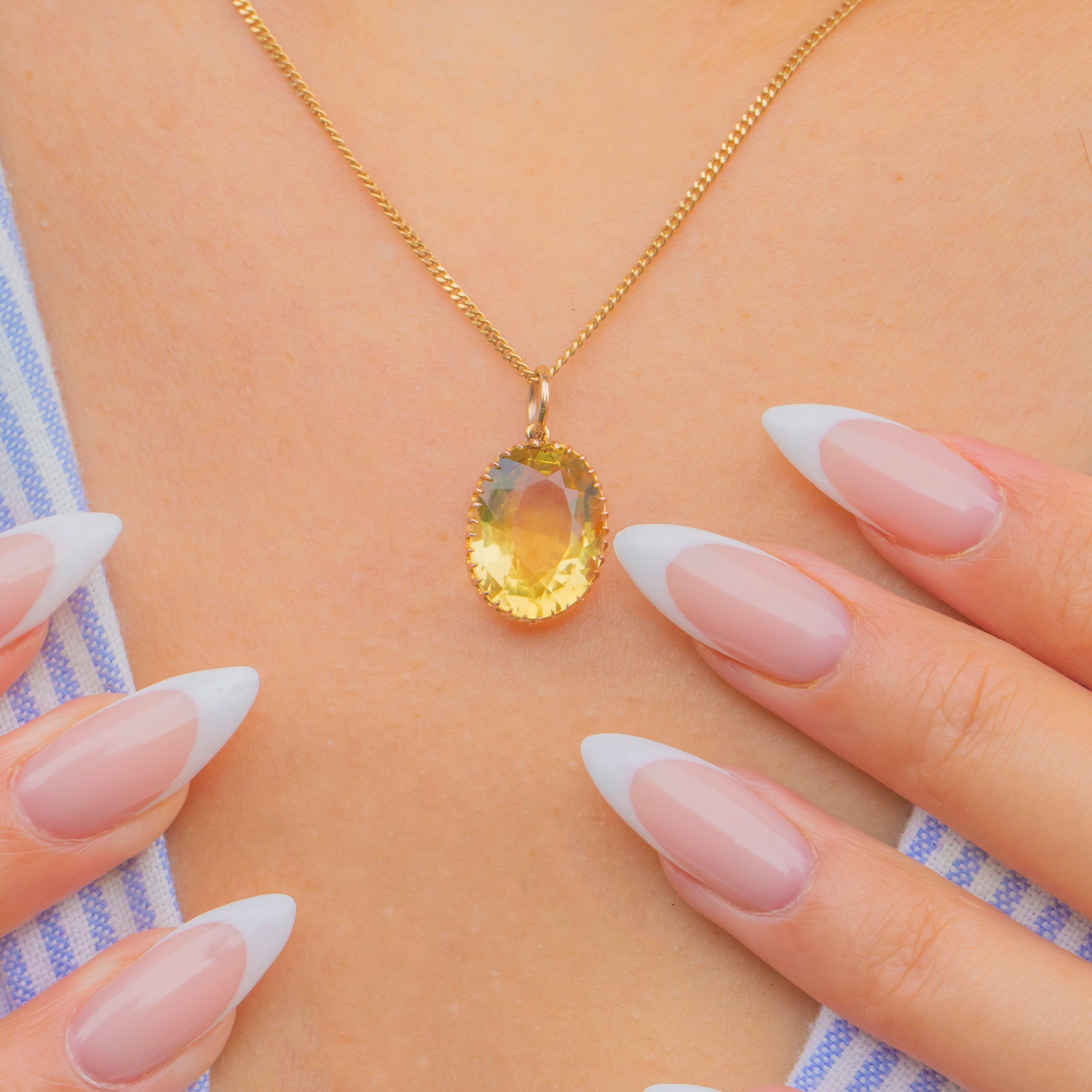 Hugging her show-stopping Citrine are claw settings, crafted from 9ct Gold, offering a buttery tone that marries perfectly with the Citrine's heartwarming hues. This Victorian Citrine pendant is just bursting with character, she is too good to resist!