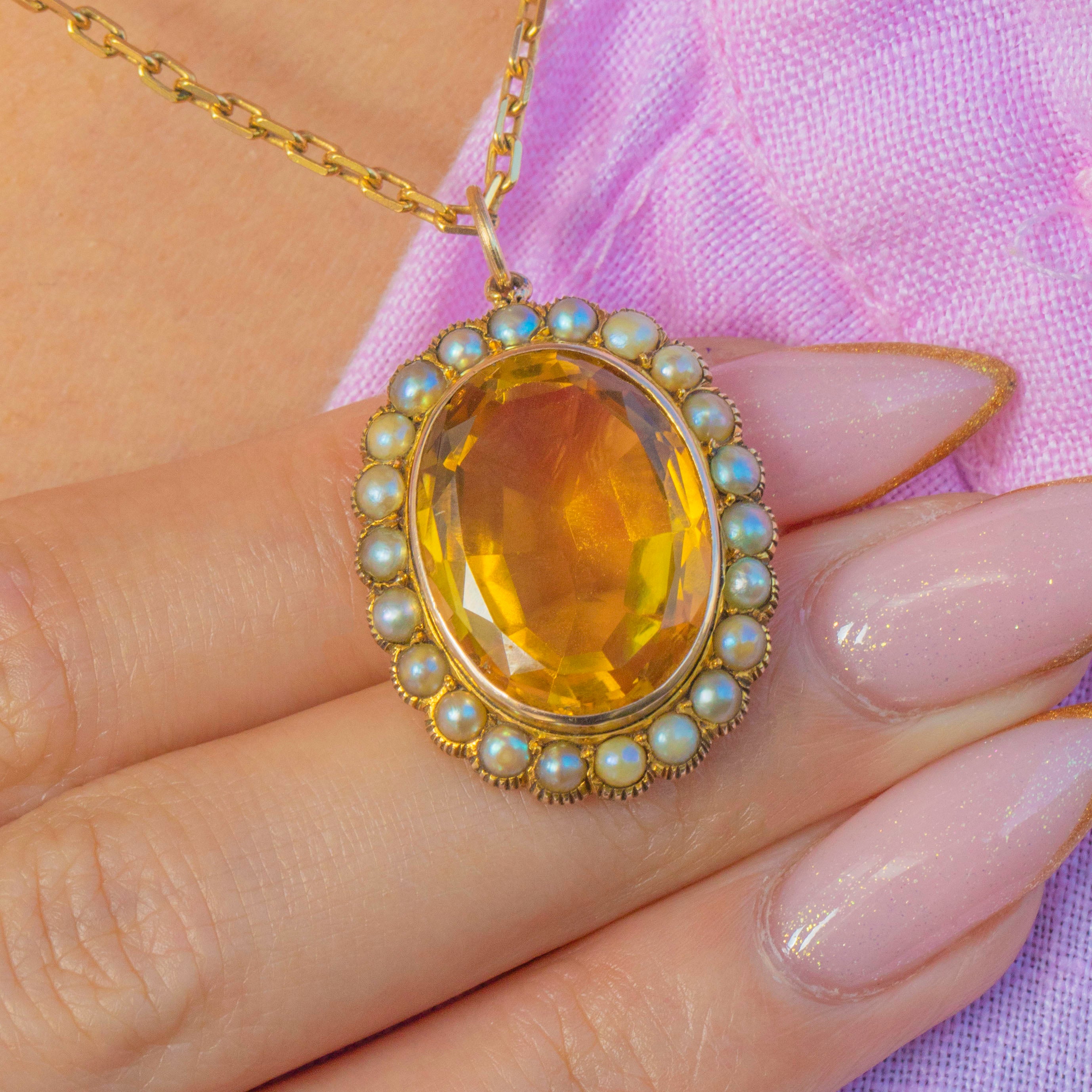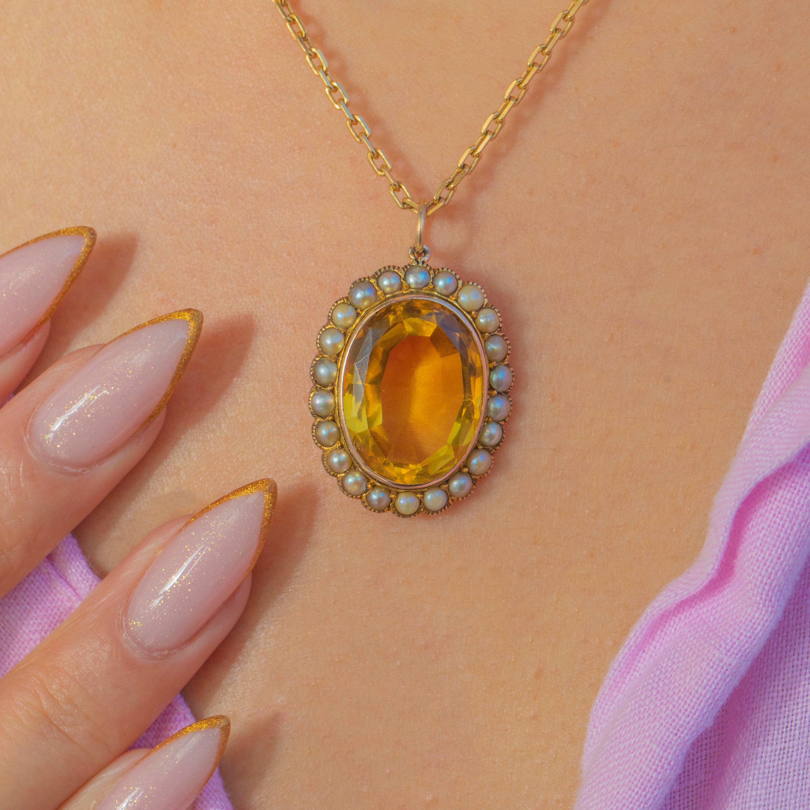 This gorgeous antique pendant centres on a rich golden Citrine in a classic oval cut, surrounded by a sweet halo of creamy Pearls. The 10.40ct Citrine is beautifully proportioned and full of life, creating a wonderfully luxurious look on the neckline.