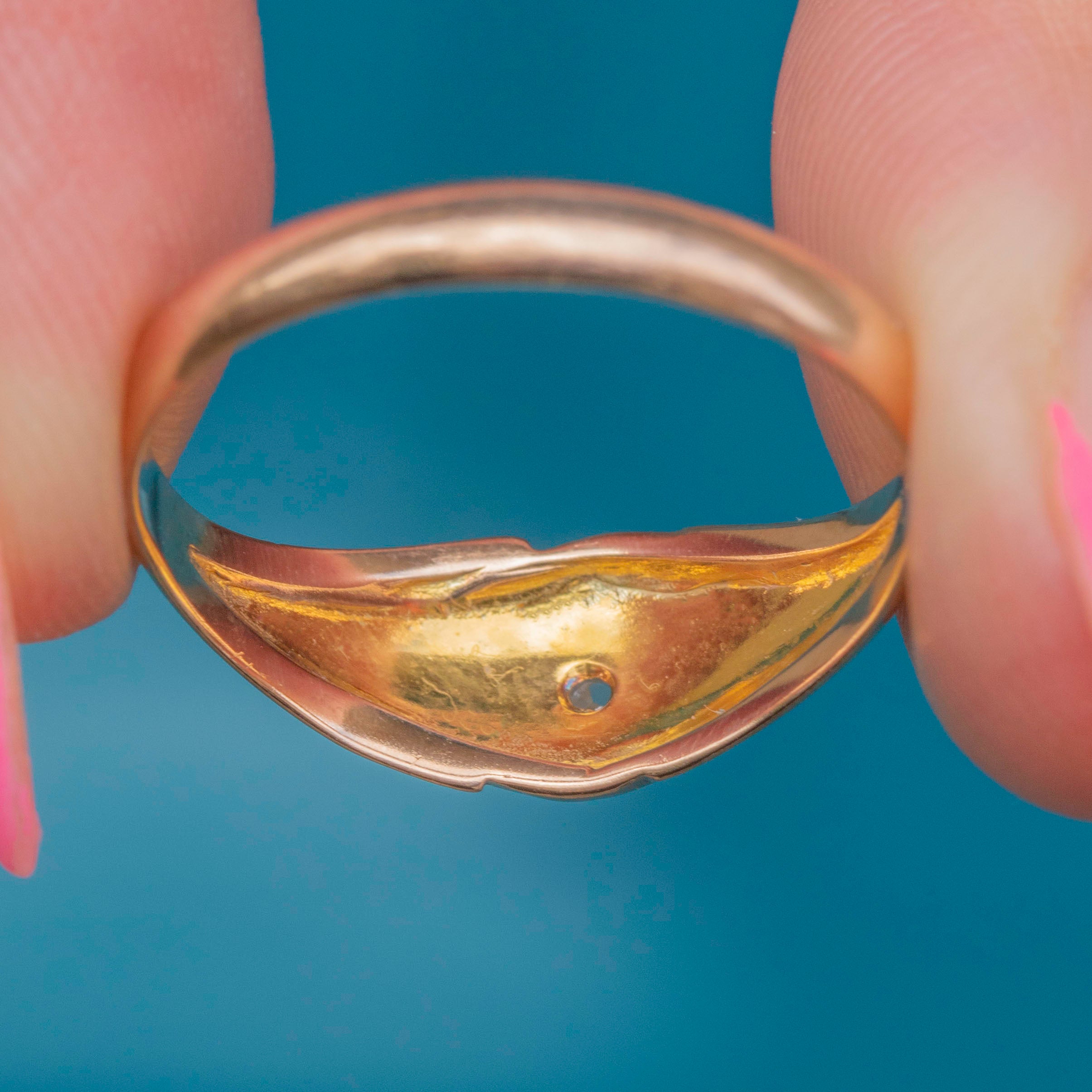 VERY GOOD: This 9ct Gold Diamond star set gypsy ring is in very good condition. She is an exemplar of antique craftsmanship and has retained a wonderful glossy sheen. There are some signs of surface wear to the Gold, including light scratches as well as evidence of a previous resize, though this is difficult to spot without a loupe. The band is not perfectly round, however, this does not affect the wearability of the ring. Her Diamond is securely set meaning you can wear this antique gypsy ring with confidence.