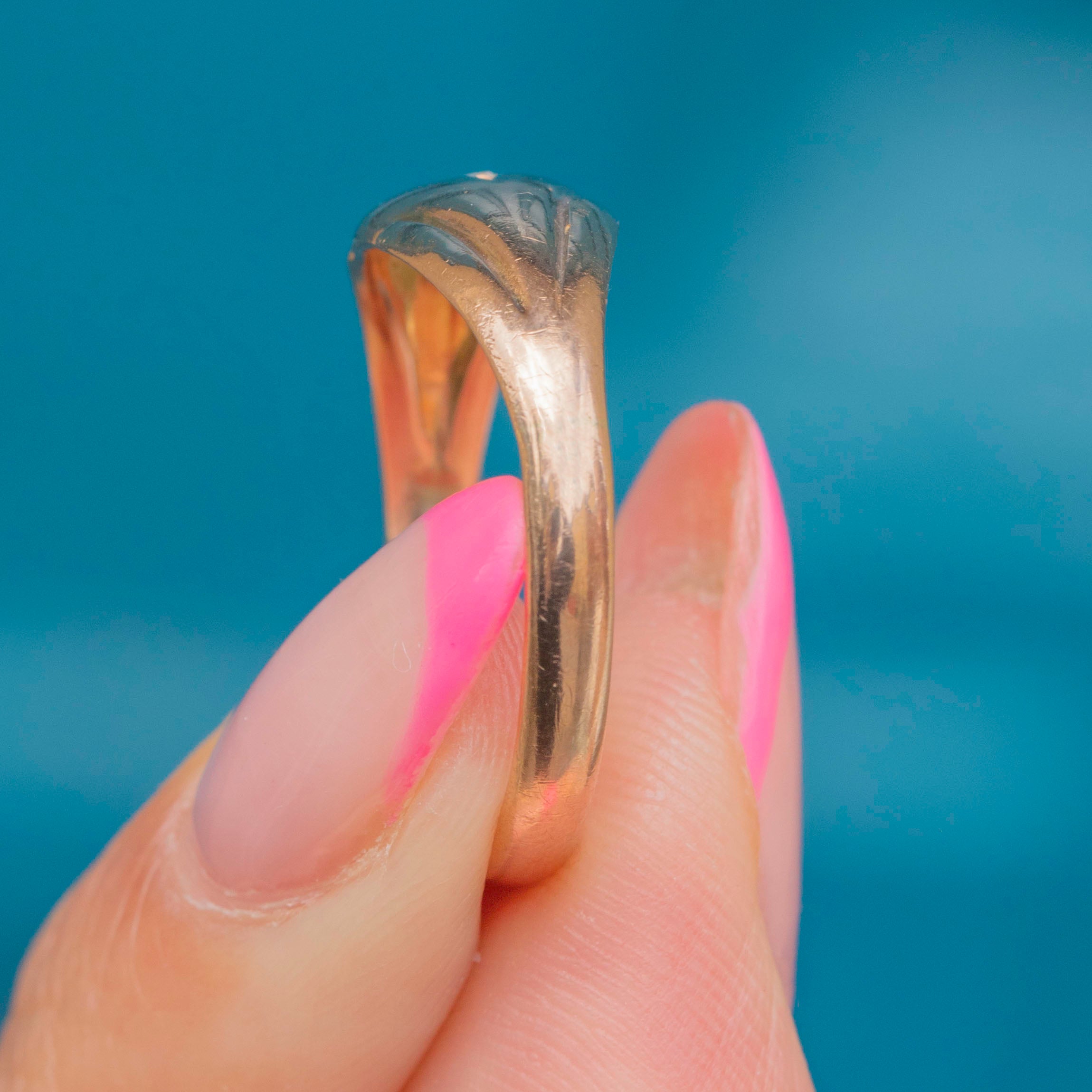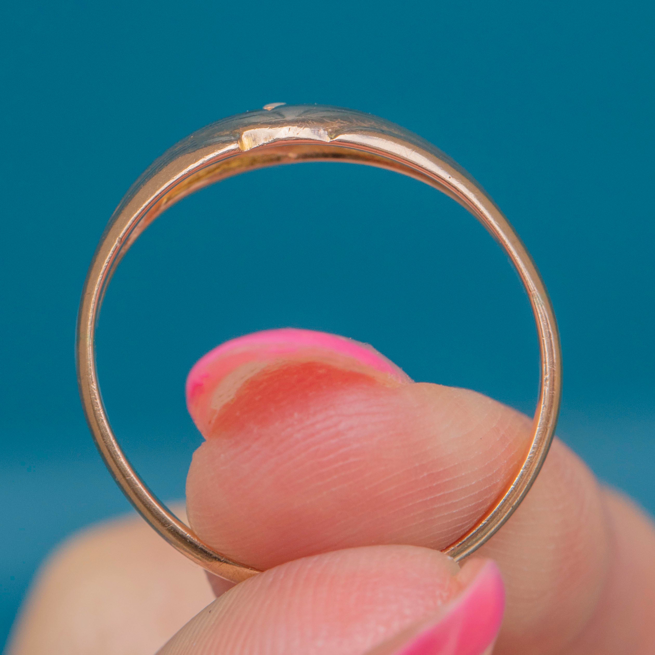 Crafted from rosy 9ct Gold and adorned by a central scintillating rose-cut Diamond, this antique ring dazzles from every angle! Gypsy rings are a fabulous option for stacking, and with a smooth form and glossy sheen, this piece is no exception!