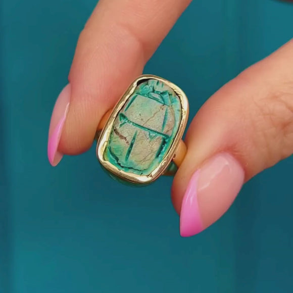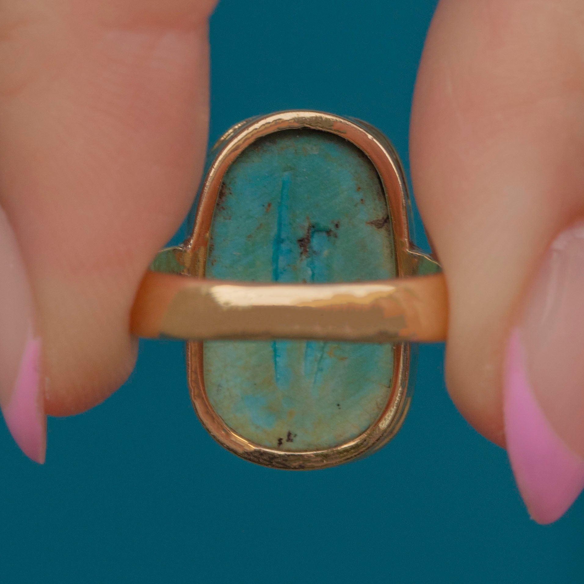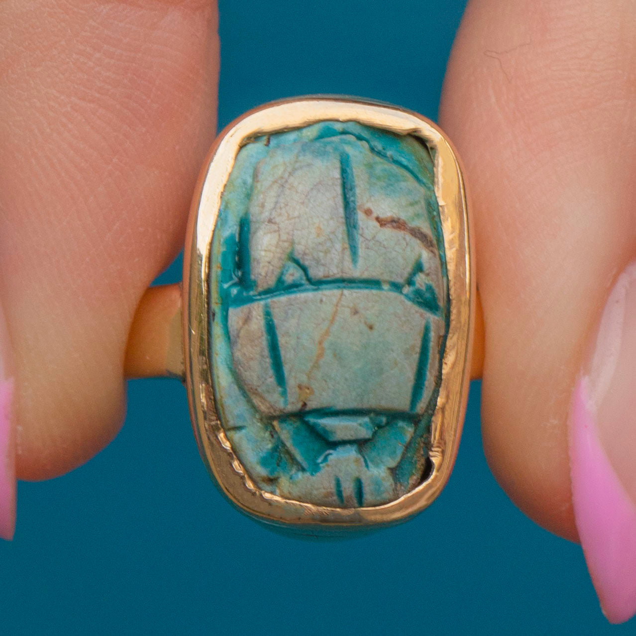 Showcasing a soft teal blue Scarab with skillful engraving, this Art Deco ring offers a glimpse into the sacred symbolism of ancient Egypt. The ring's historical significance and exquisite craftsmanship make it a treasured piece!