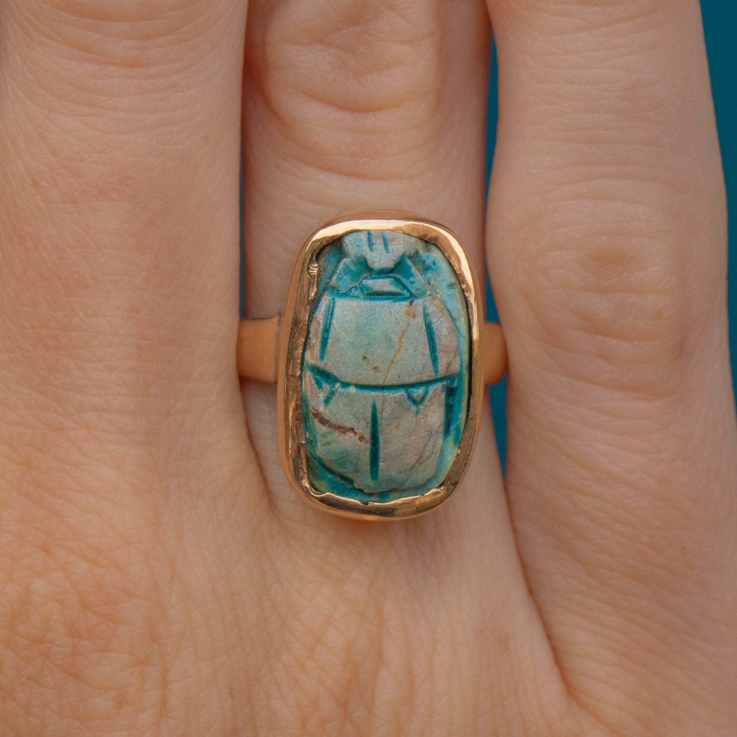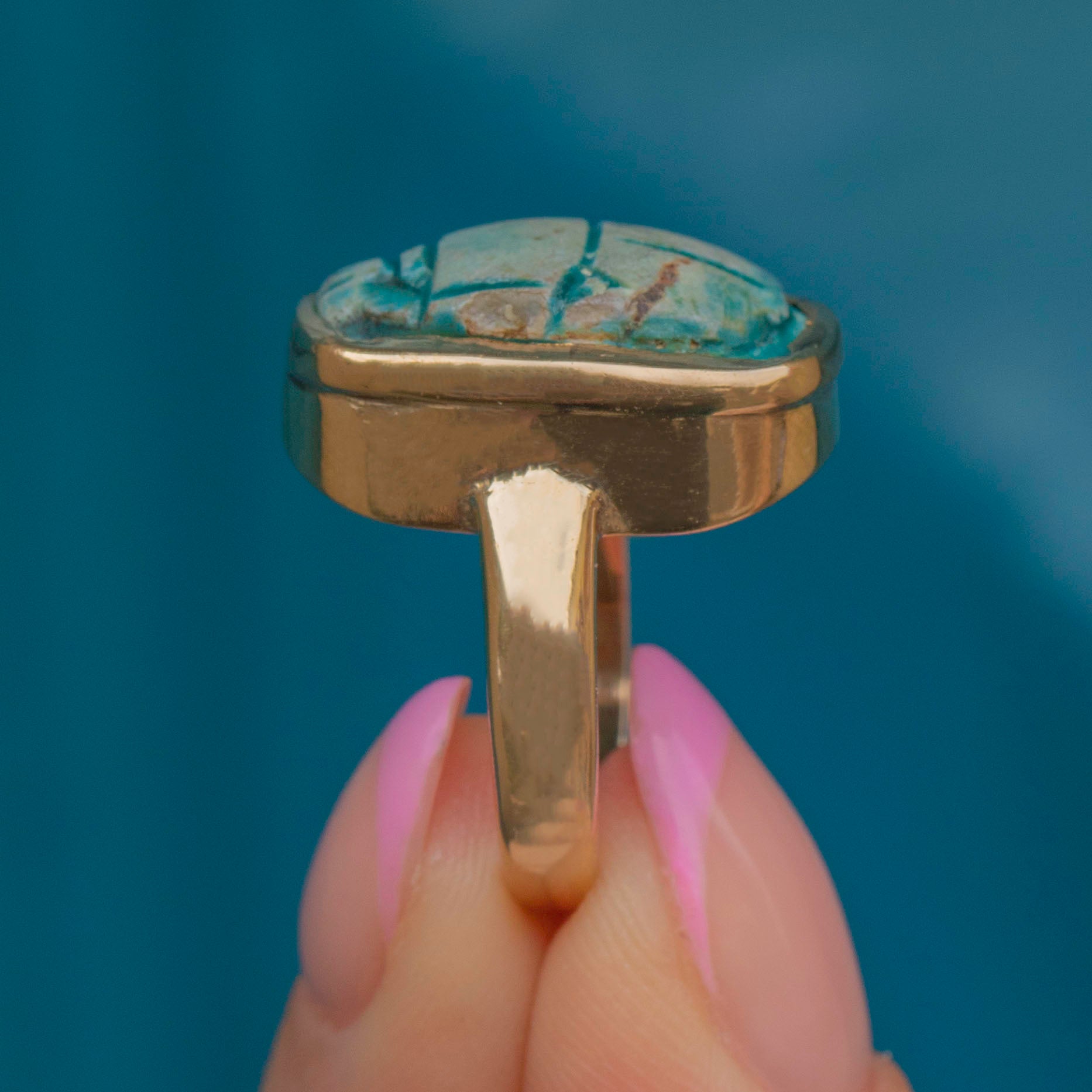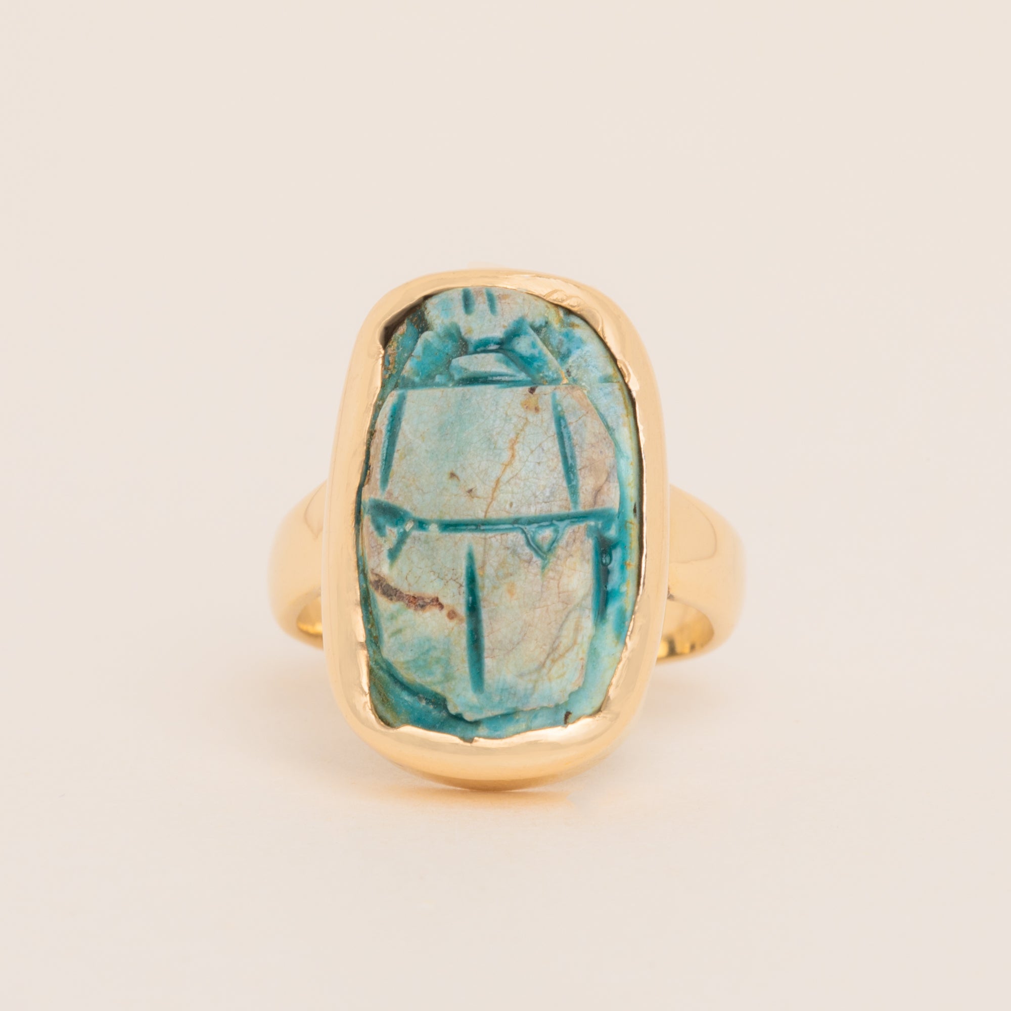Showcasing a soft teal blue Scarab with skillful engraving, this Art Deco ring offers a glimpse into the sacred symbolism of ancient Egypt. The ring's historical significance and exquisite craftsmanship make it a treasured piece!