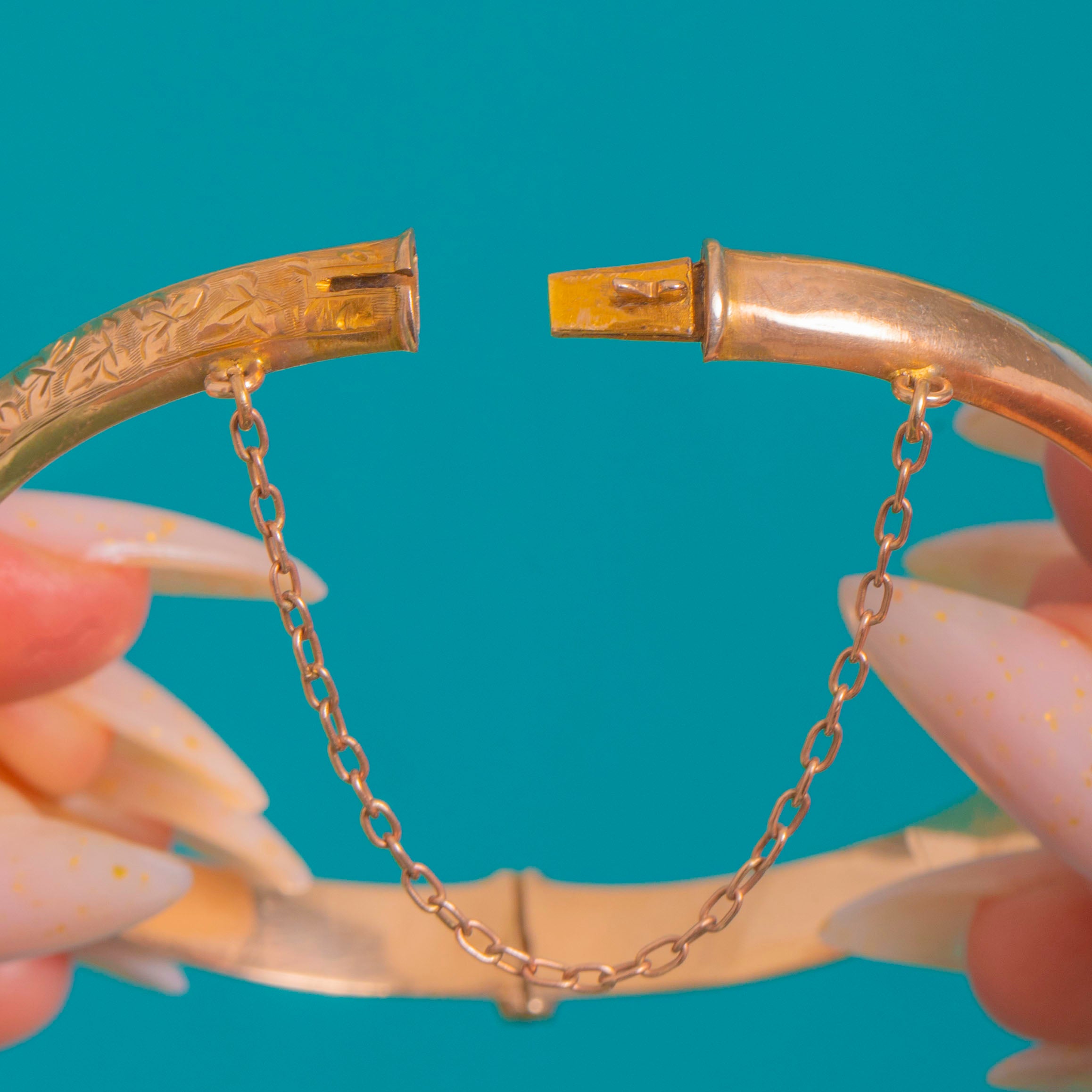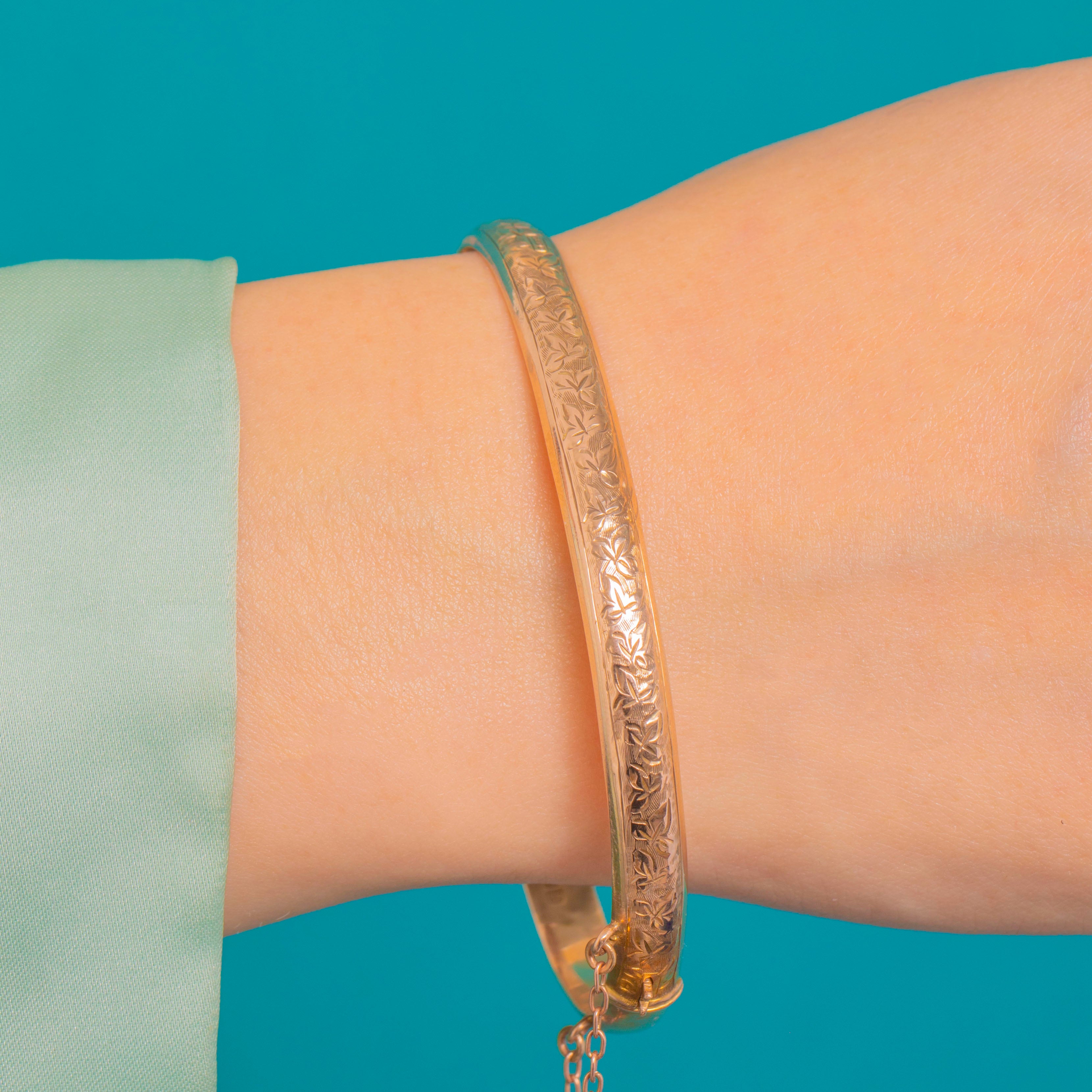 Delicately engraved and beautifully refined, this 9ct Gold hinged bangle dates to c.1912 and brims with charm. The outer face is bright-cut with trailing foliate scrolls, framed by fine polished borders that catch the light against its warm yellow-to-rosy glow. Its oval, D-section profile offers an elegant, timeless silhouette.