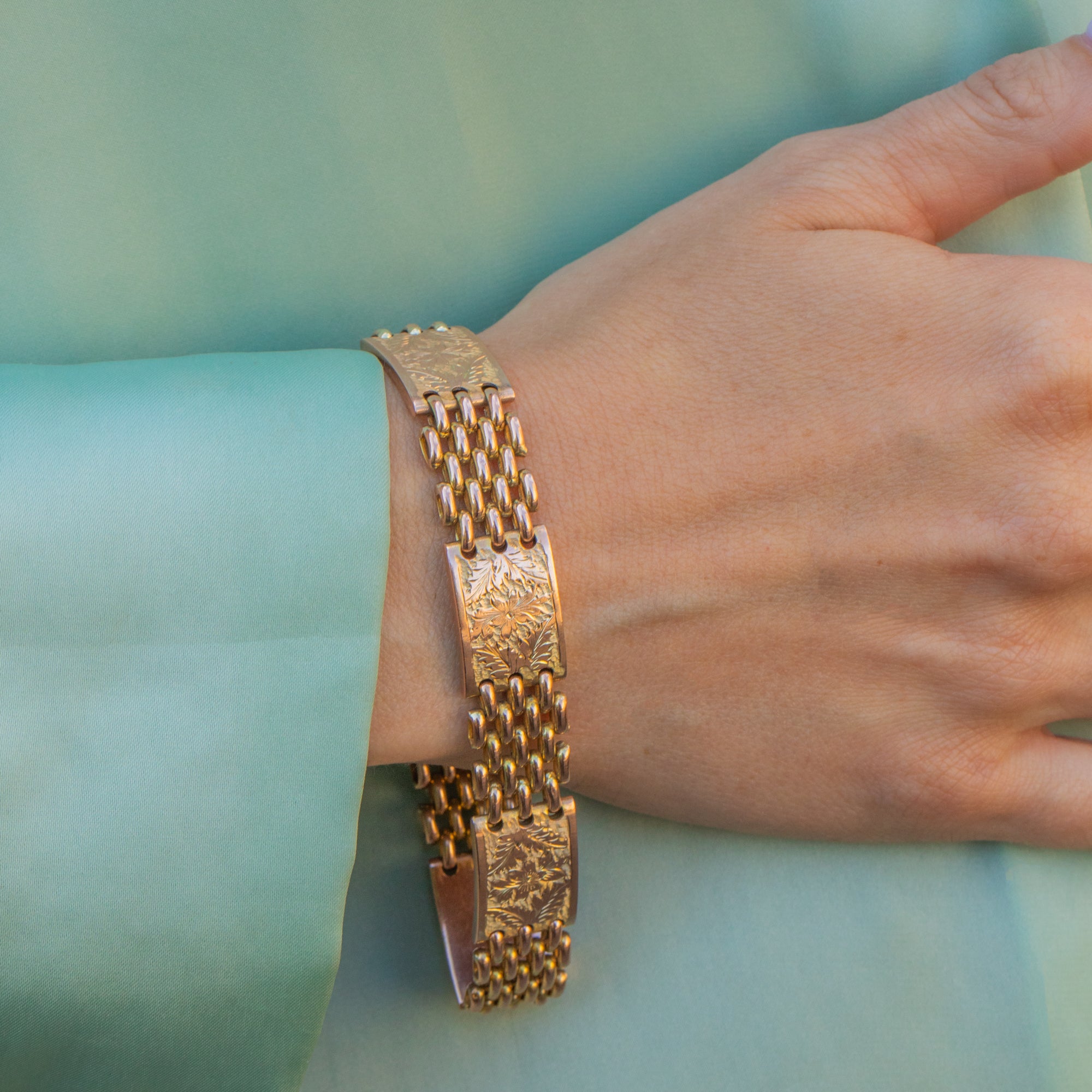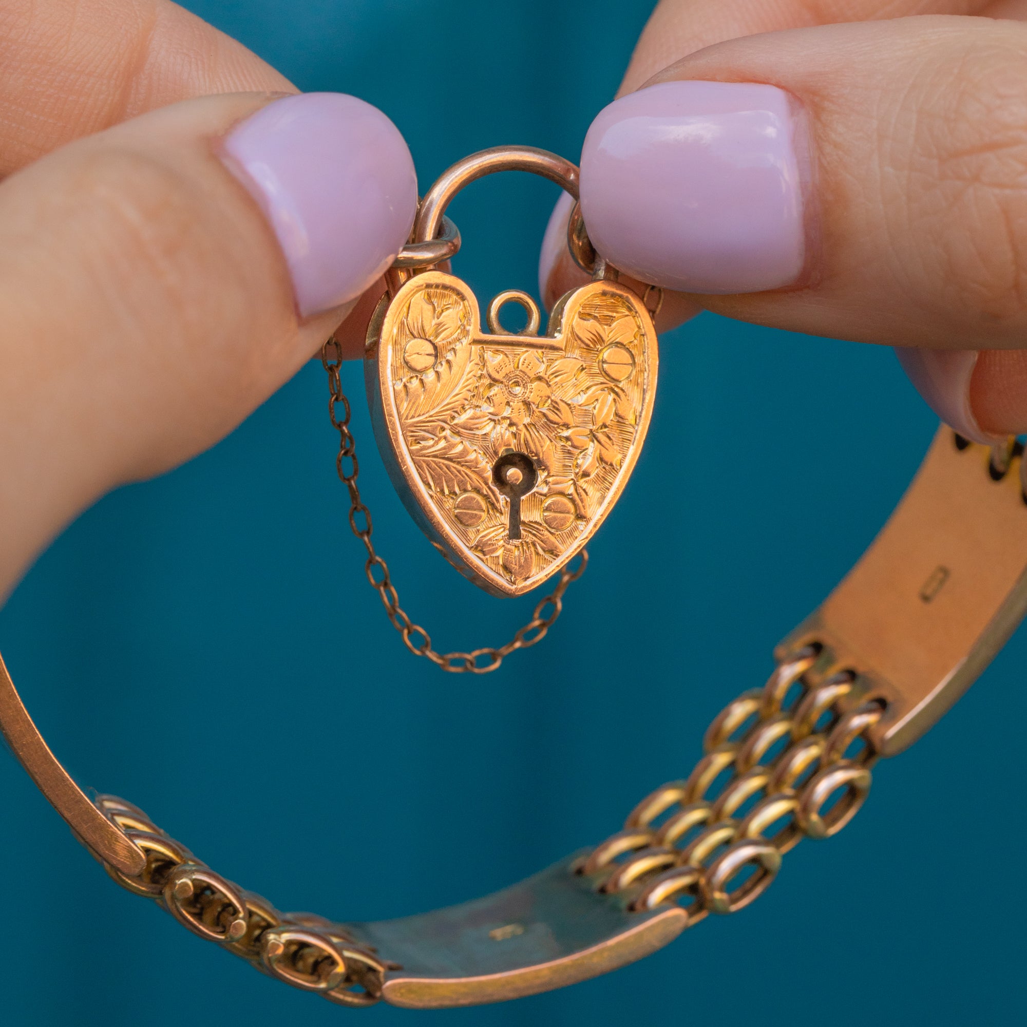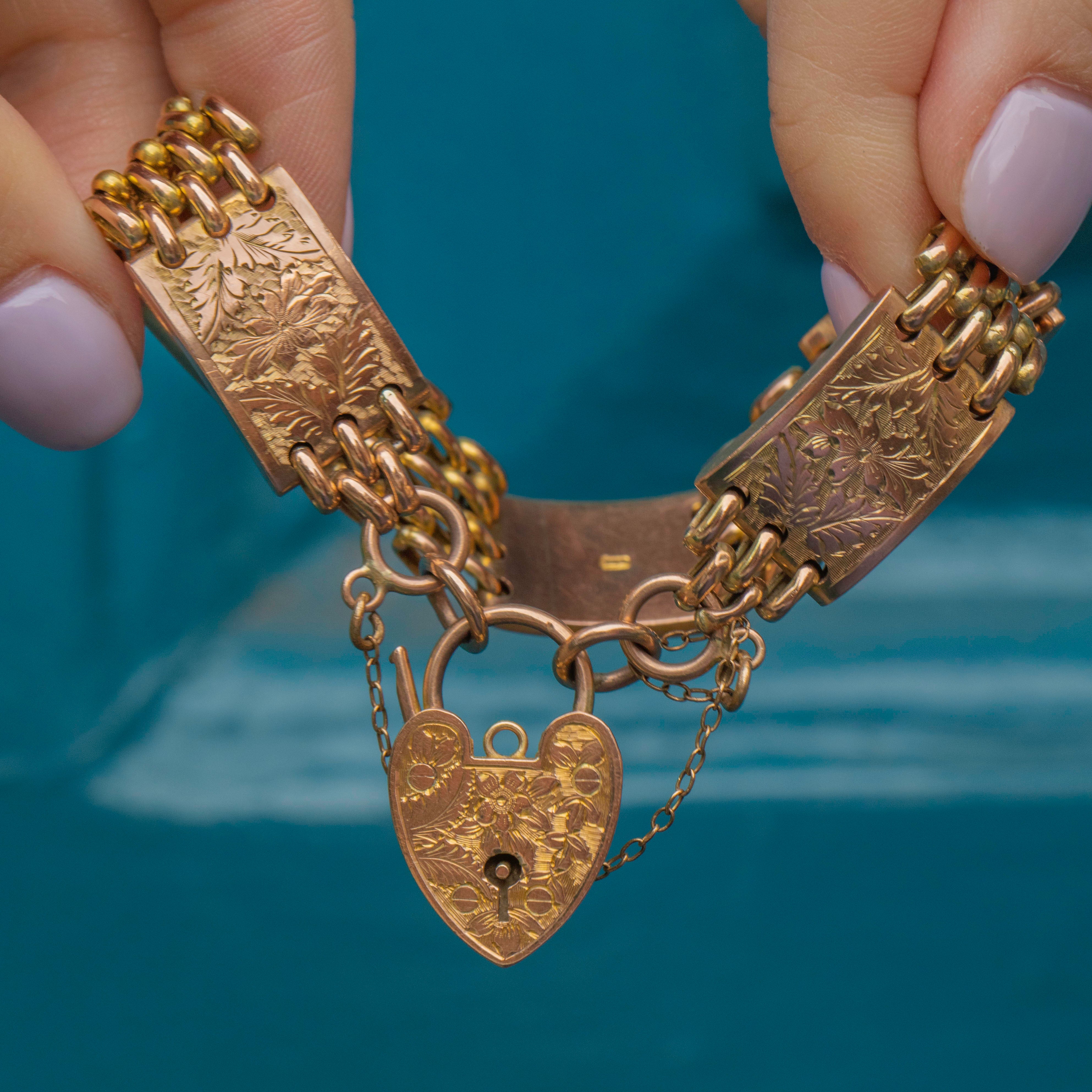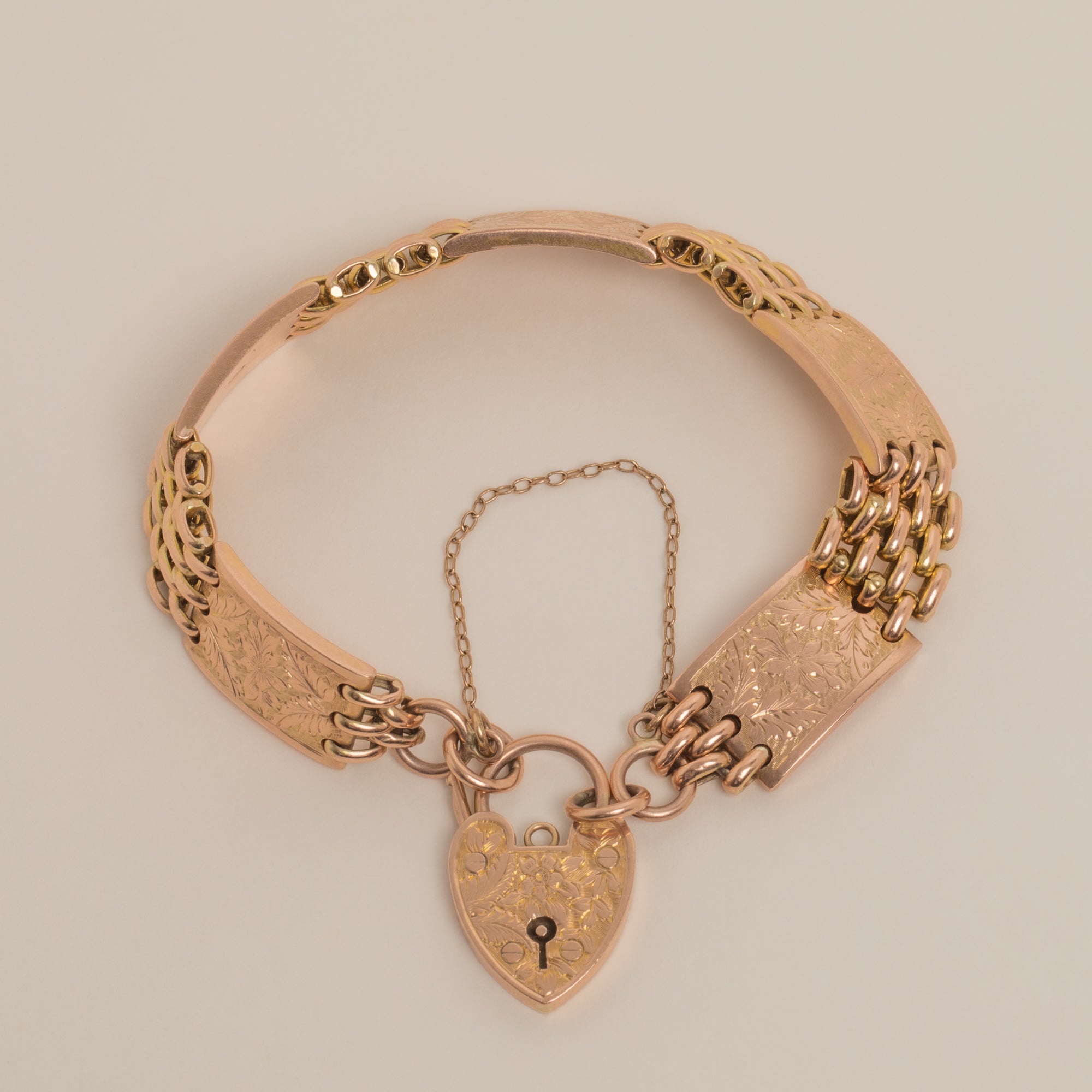 EXCELLENT. This antique 9ct Gold engraved gate bracelet is in excellent condition. The engraved panels are securely linked, with a lovely rosy hue. The intricate heart padlock is free from wear, its clasp opening and closing with ease. The piece also has an additional security chain, giving you peace of mind while wearing this spectacular Victorian gate bracelet!