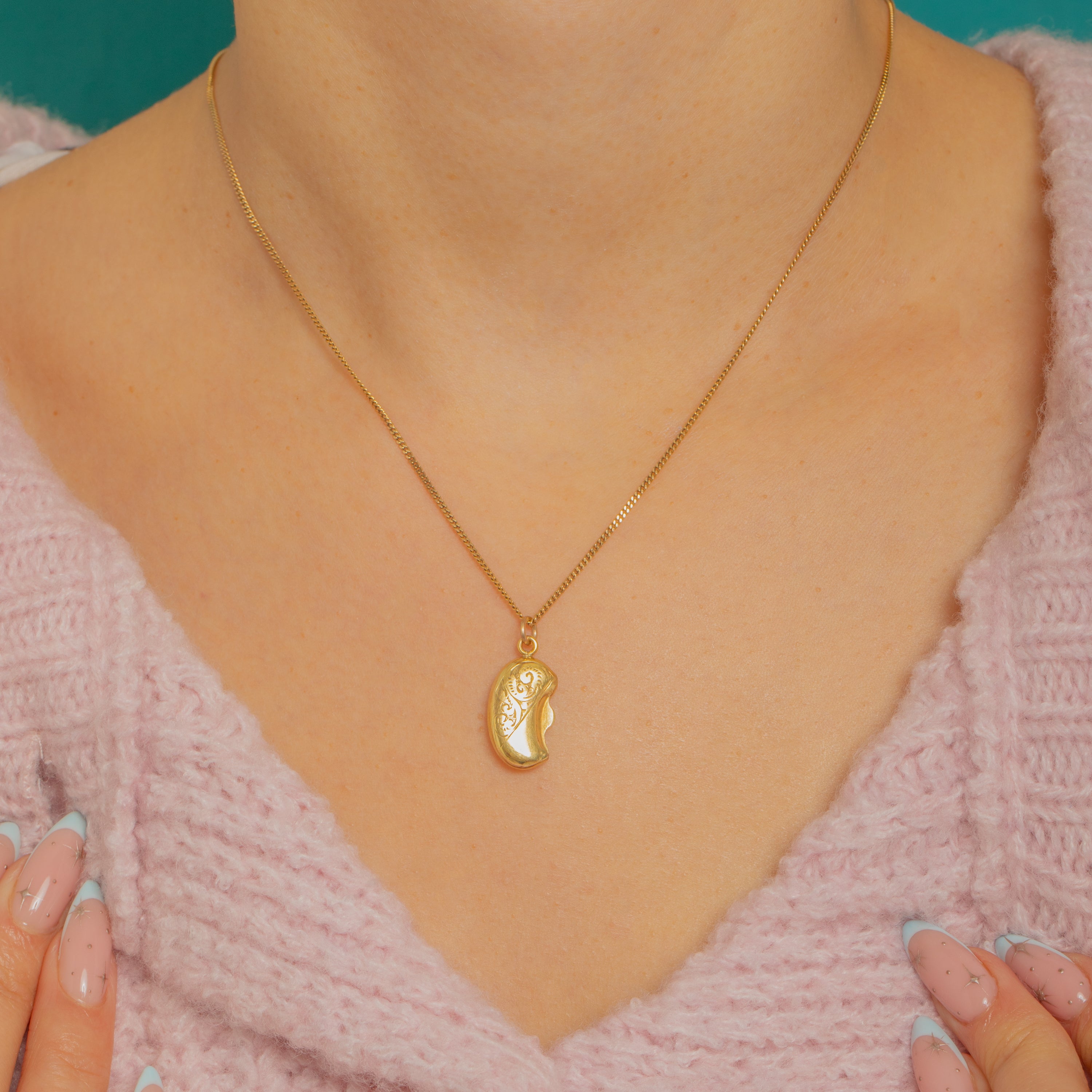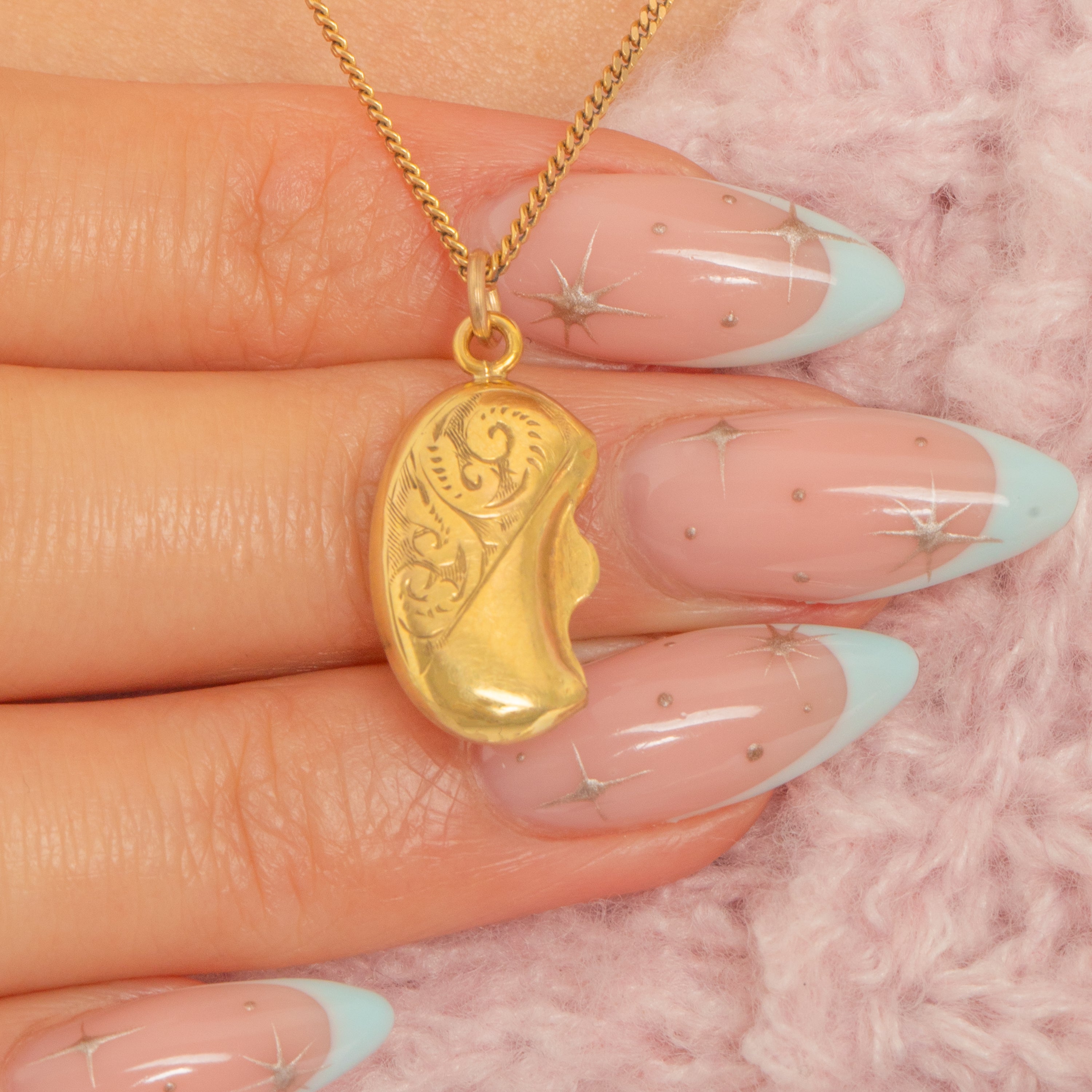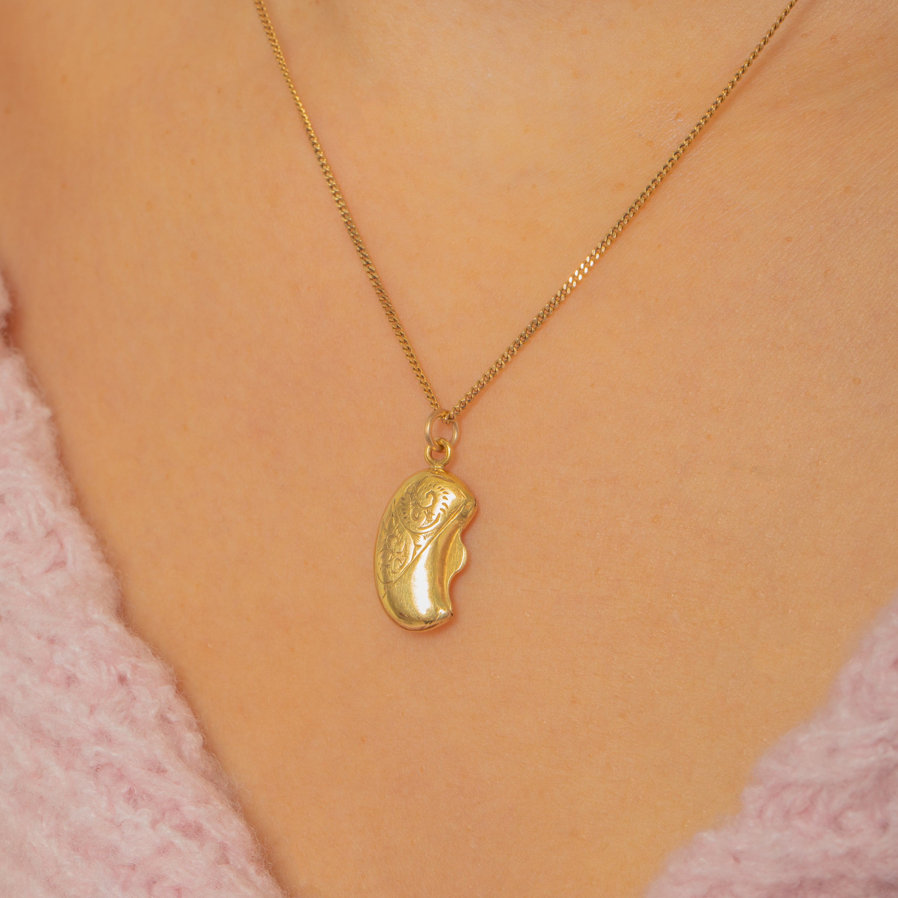 A charming Edwardian “lucky bean” rendered in glowing 9ct Gold, this petite pendant is hallmarked Birmingham 1907. Its softly asymmetric bean silhouette is enriched with crisp bright-cut foliate scroll engraving to the front, divided by a gentle diagonal ridge that lends subtle sculptural depth. The buttery Yellow Gold finish gleams with a high polish, while the reverse is smoothly domed for a tactile feel.