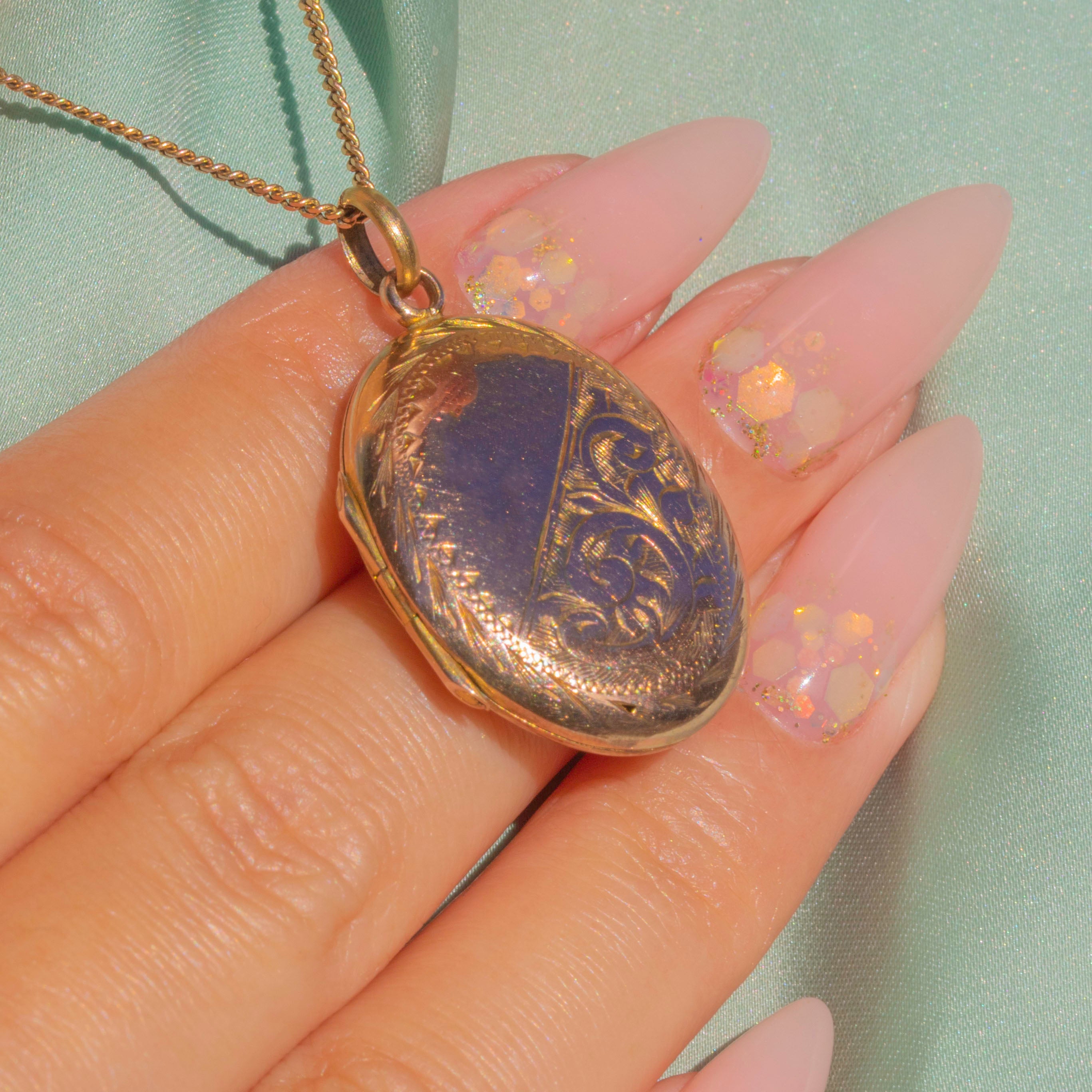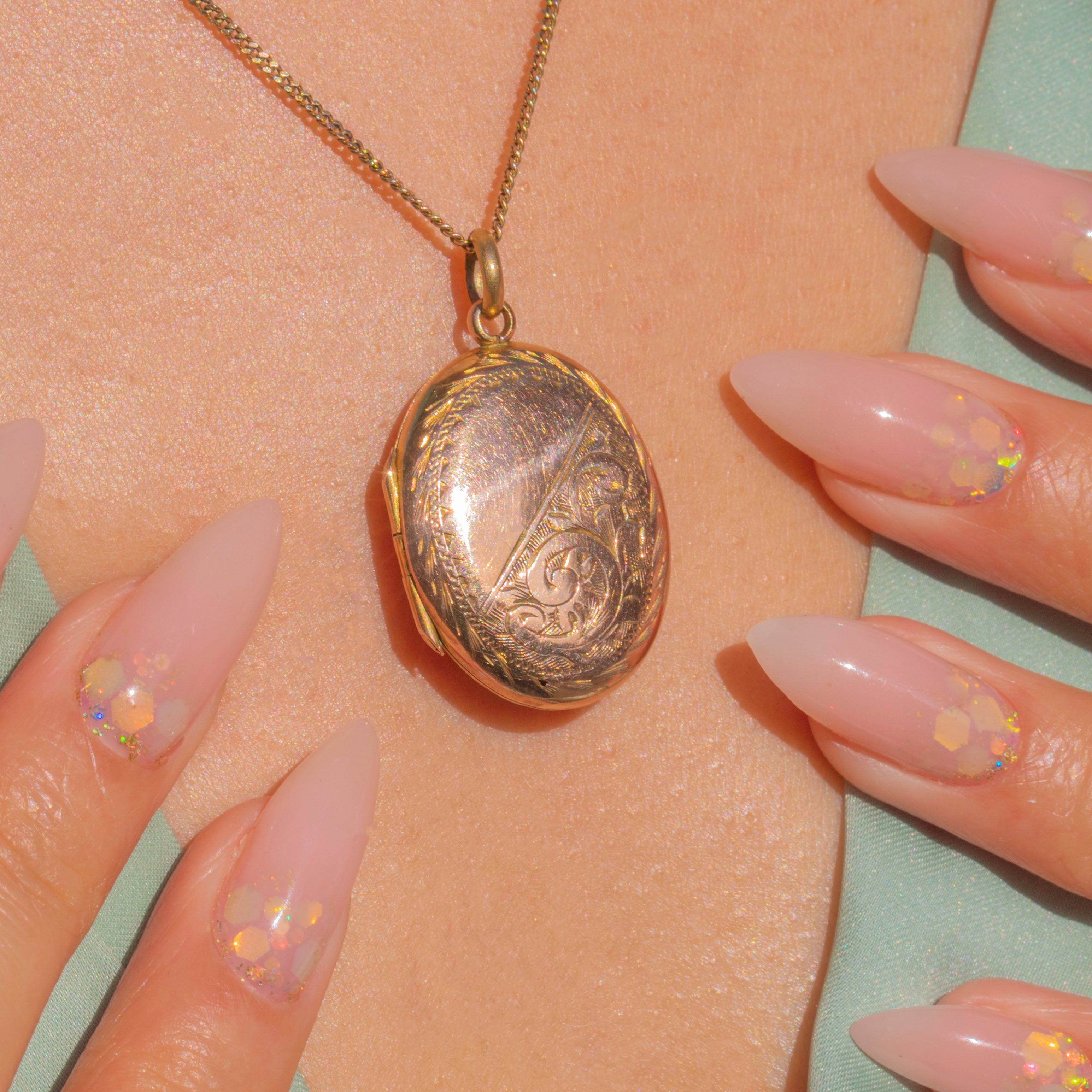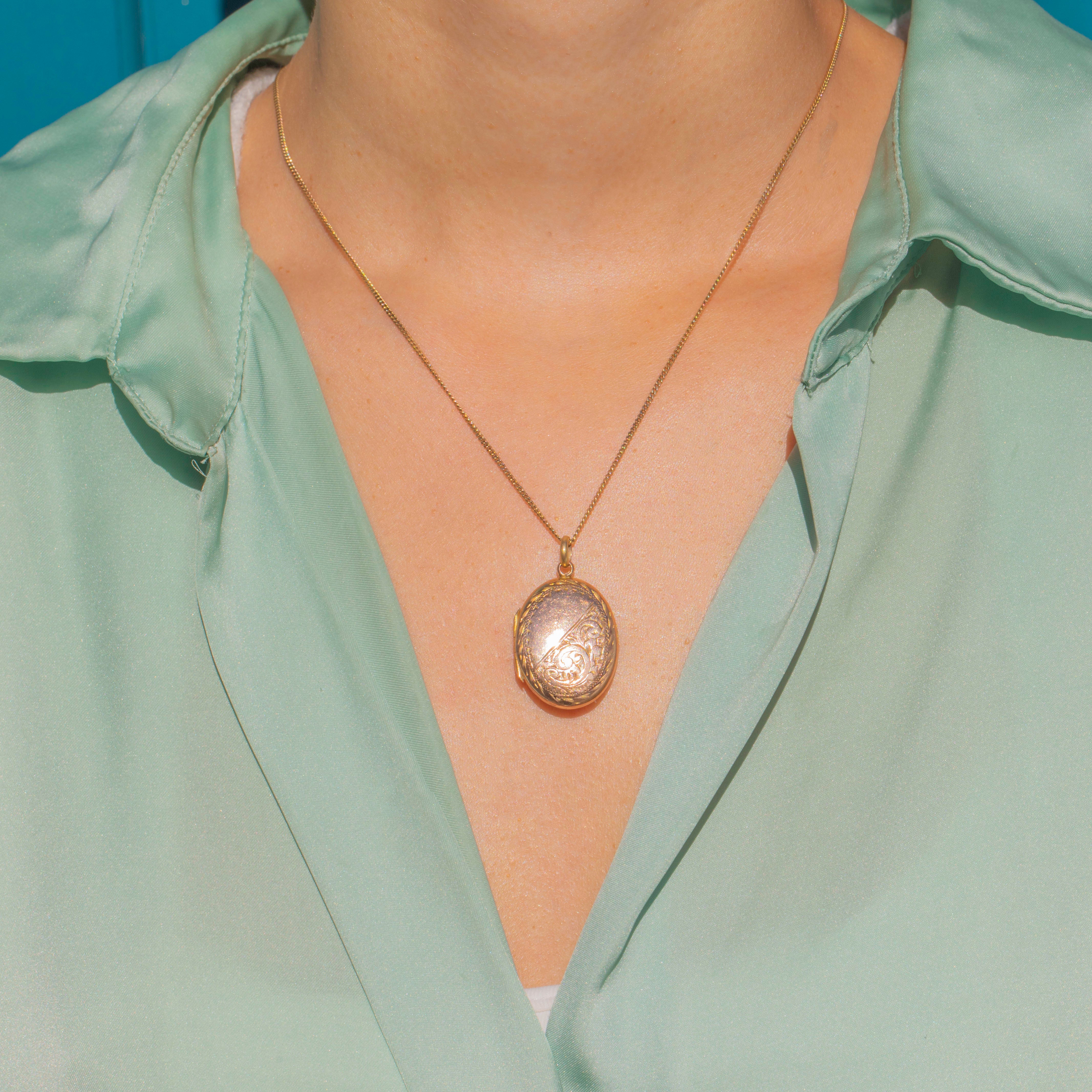 This antique Edwardian oval locket is crafted in 9ct Gold and beautifully engraved to the front with delicate detail. The warm Gold gleams softly, giving this piece both elegance and character. The classic oval form is timeless, making it a versatile keepsake for everyday wear.