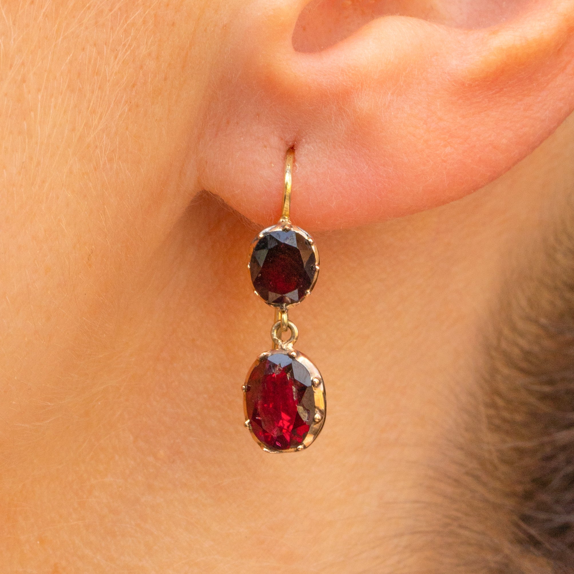 VERY GOOD. These Georgian 9ct Gold flat-cut Garnet earrings are in very good condition. These pretties have deliciously hued flat-cut Garnets, foiled to perfection. There are some notable chips to the bottom Garnet on one of the earrings, visible under close inspection. With slender and generously sized 15ct Gold hooks, you can wear these sumptuous Georgian earrings comfortably and confidently!