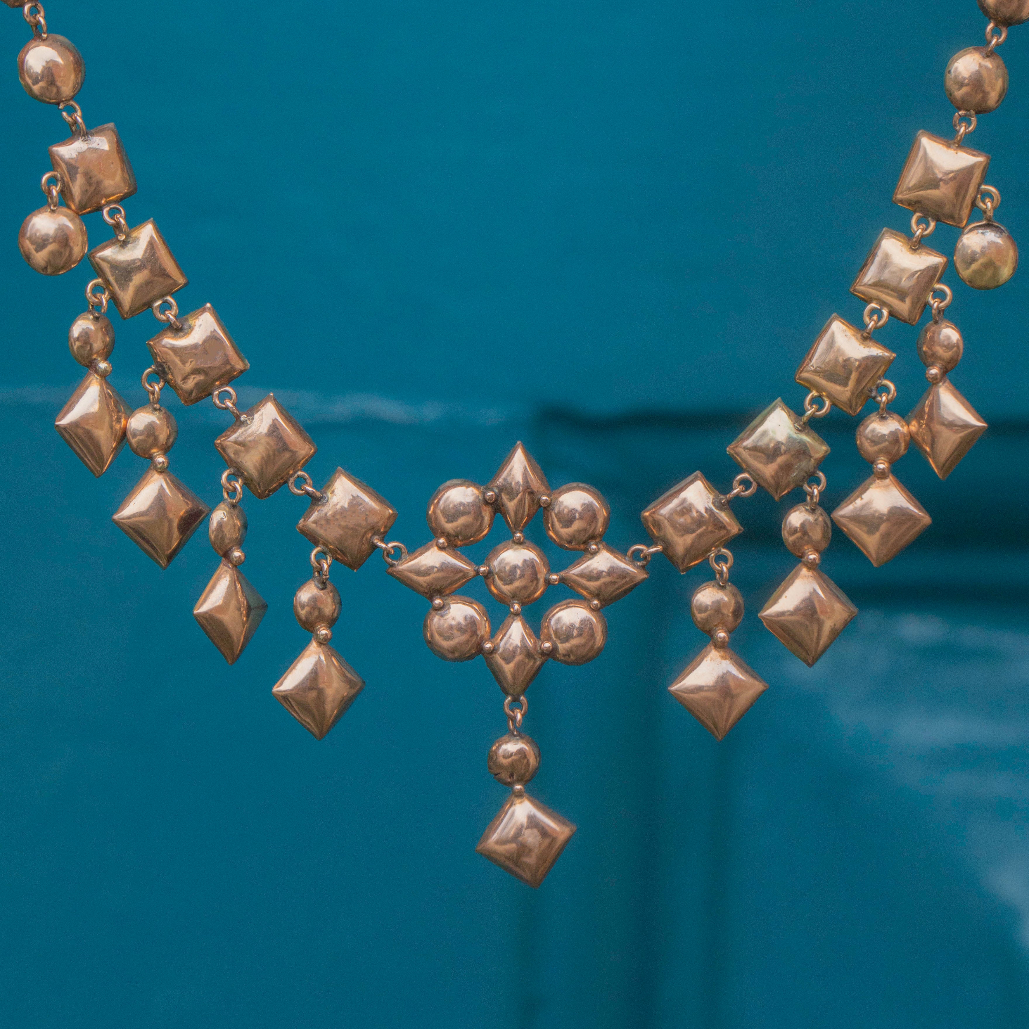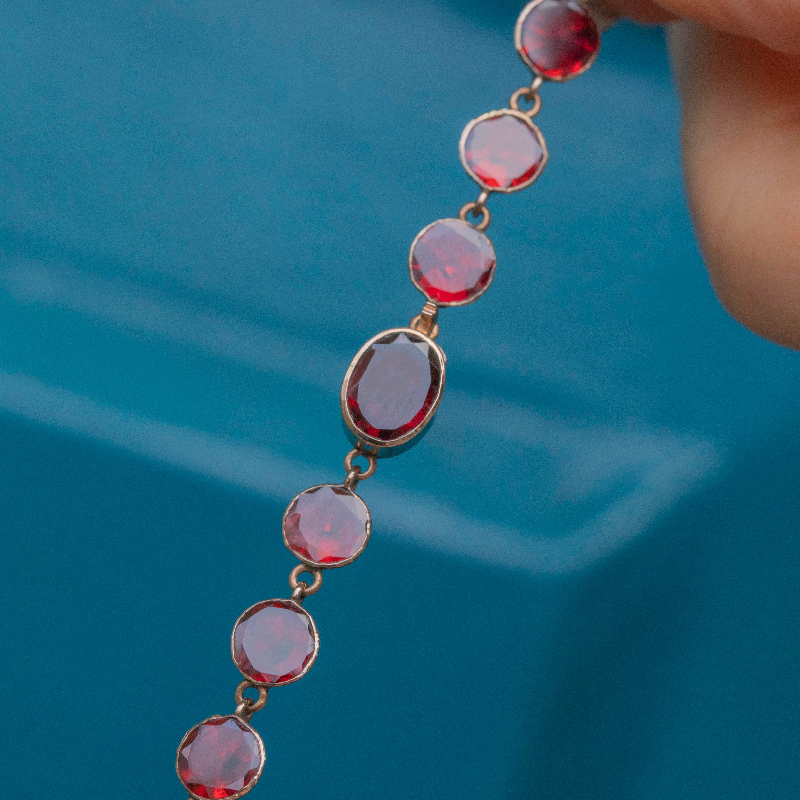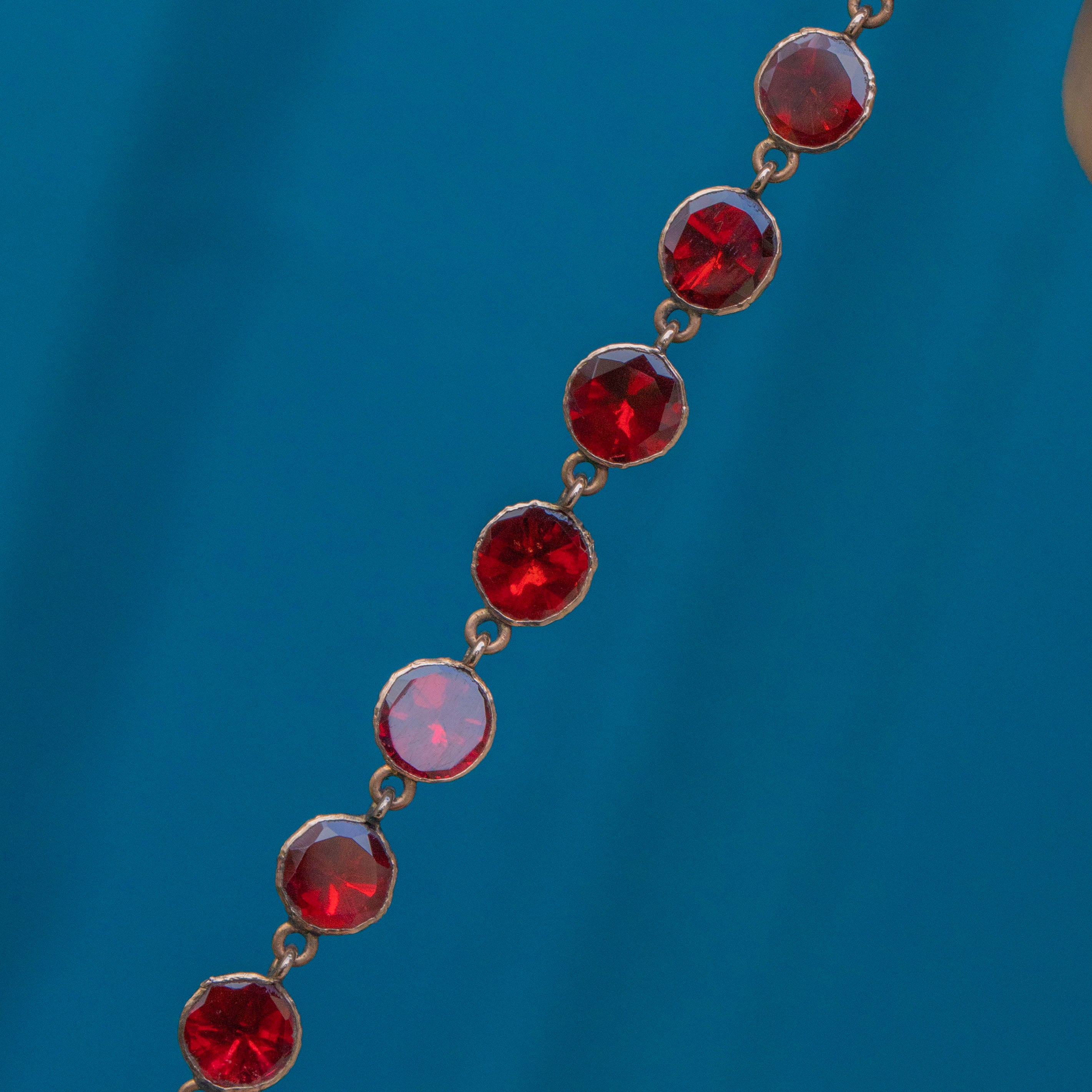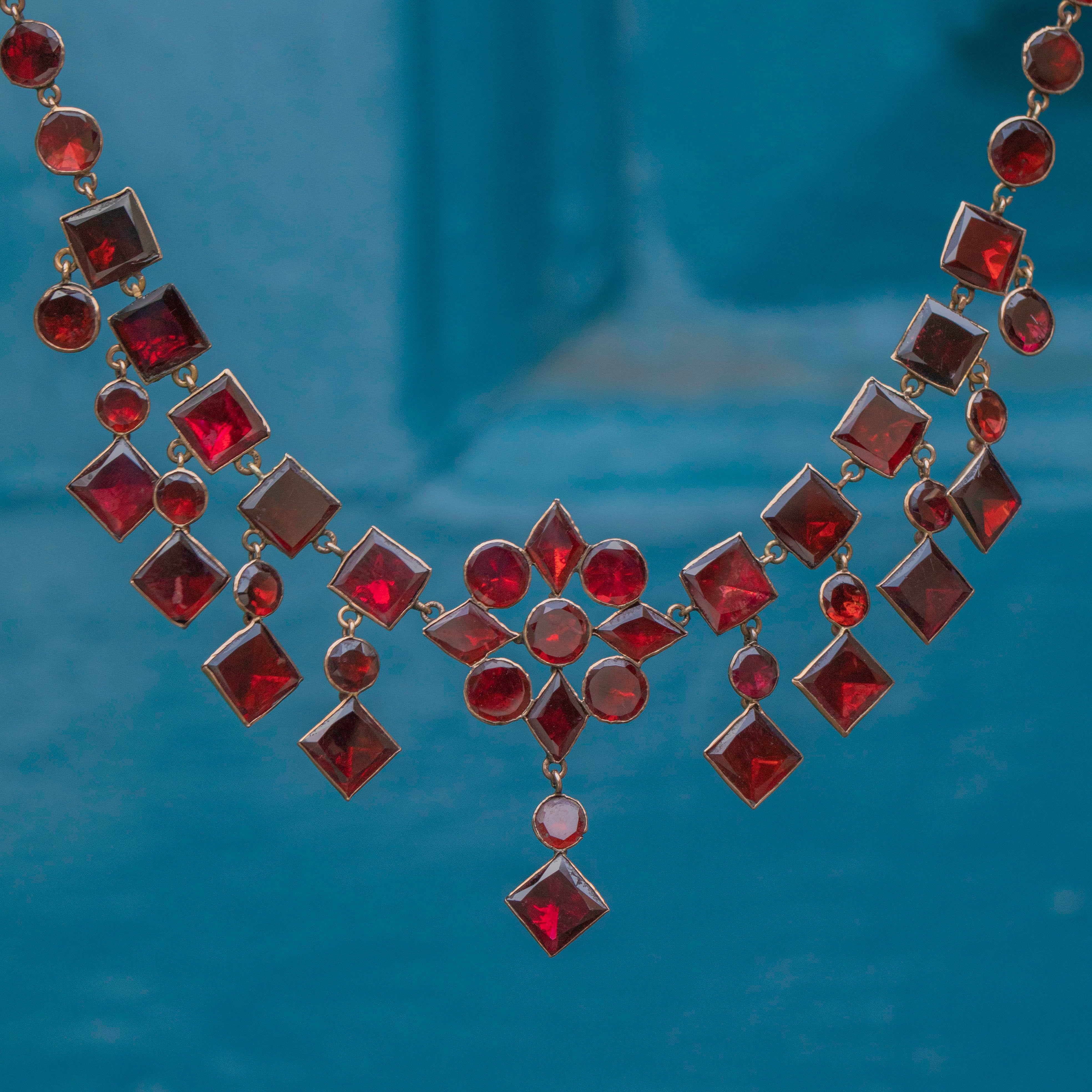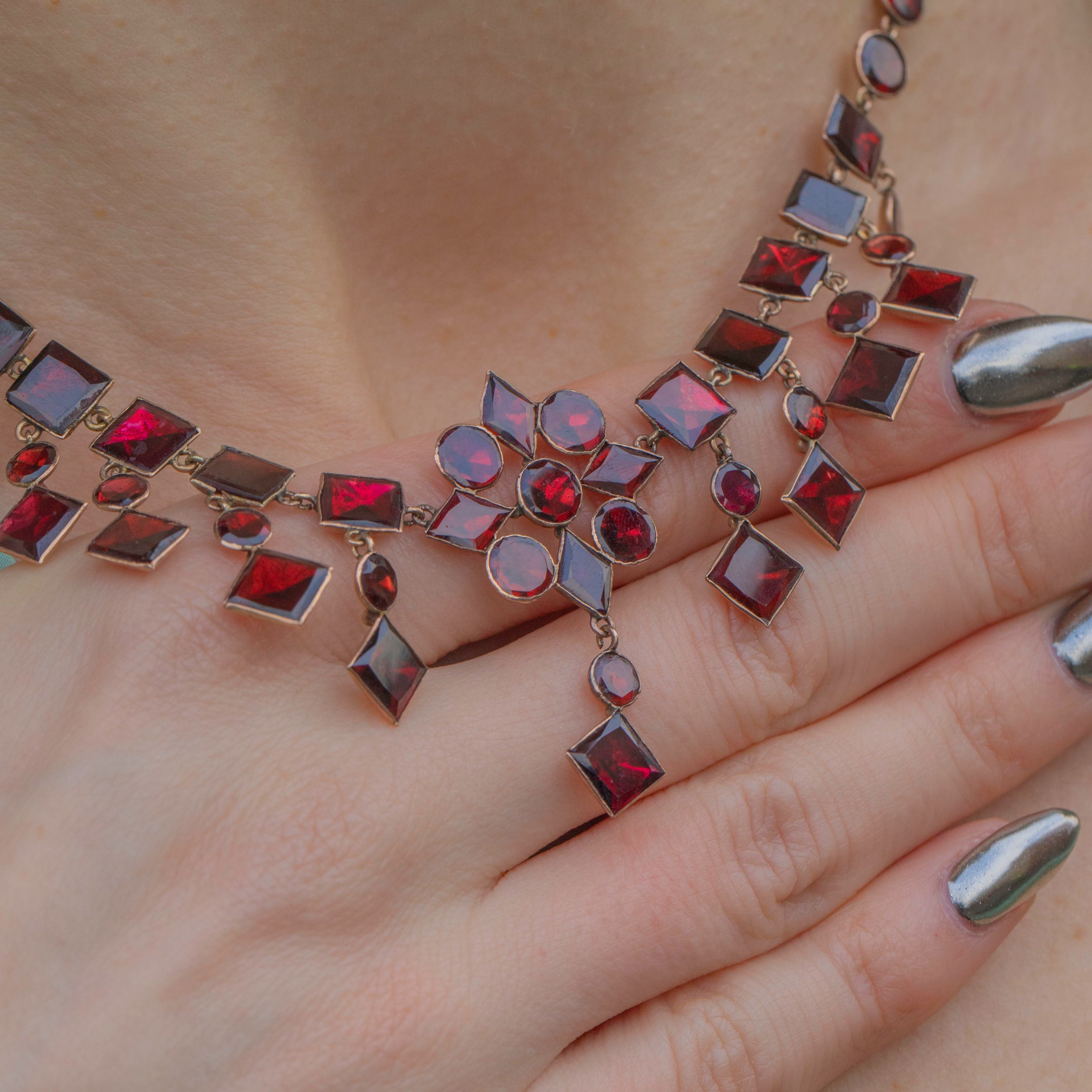 VERY GOOD-EXCELLENT. This antique 9ct Gold flat-cut Garnet fringe necklace is in lovely condition. The Garnets are all secure, and free from damage, which given the age of the piece is quite a feat± The back of the necklace sits comfortably against the skin, and the Gold only has a few little dings to note. The clasp allows for secure closure, so you can wear this necklace confidently!
