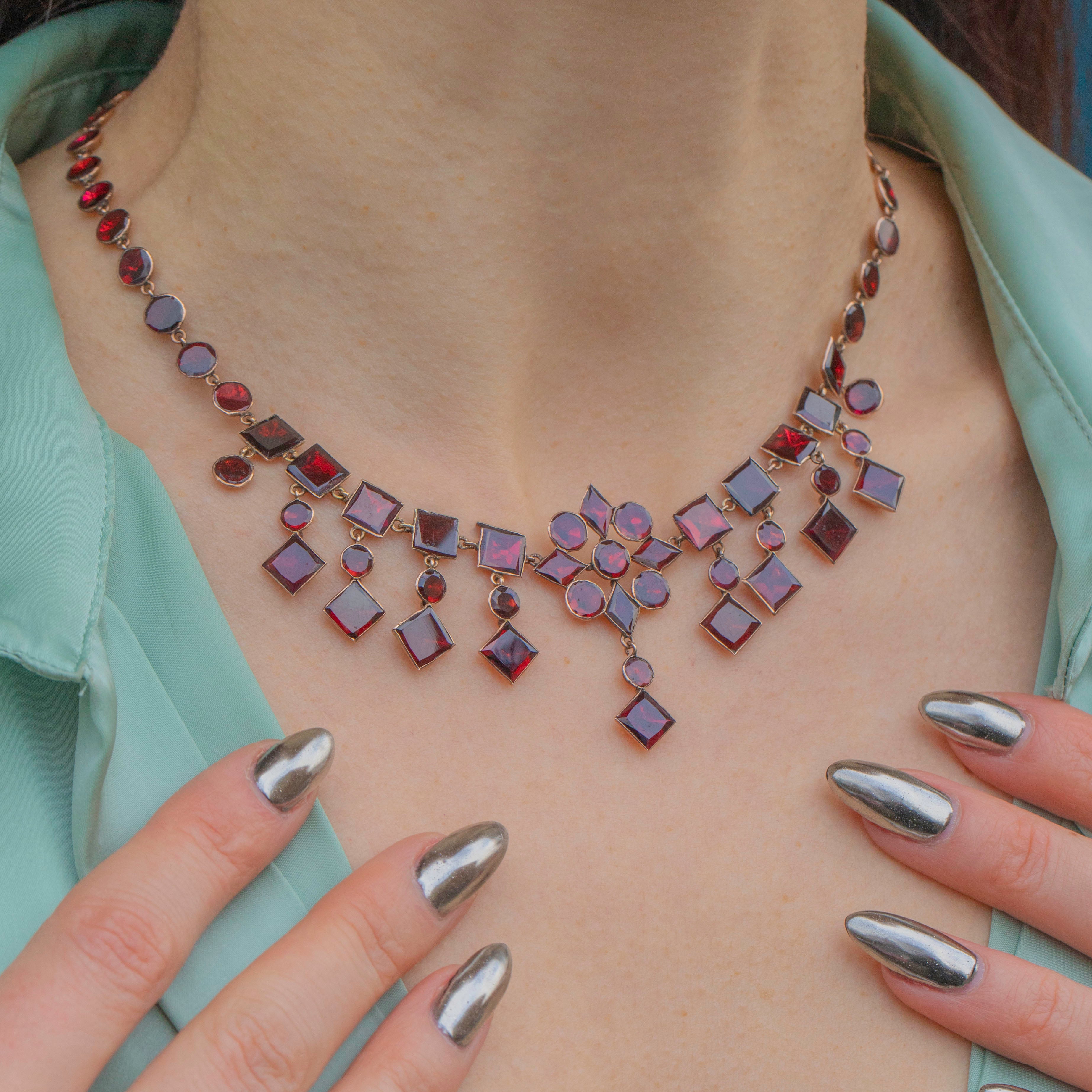 This antique 9ct Gold flat-cut Garnet fringe necklace is a berry red dream! Made during the Edwardian era, this Gold necklace has been crafted from rosy 9ct Gold and displays a splendid selection of flat-cut Garnets.