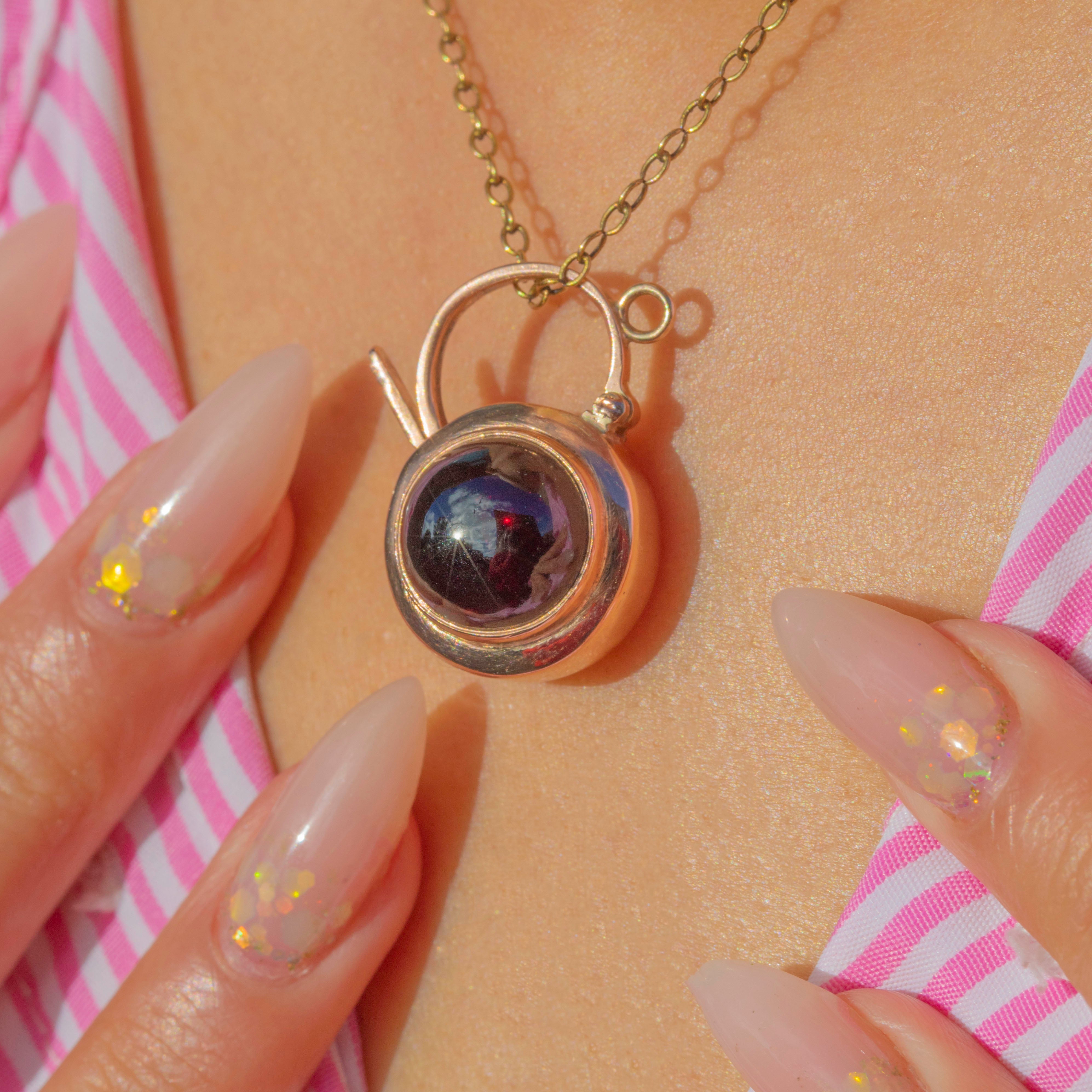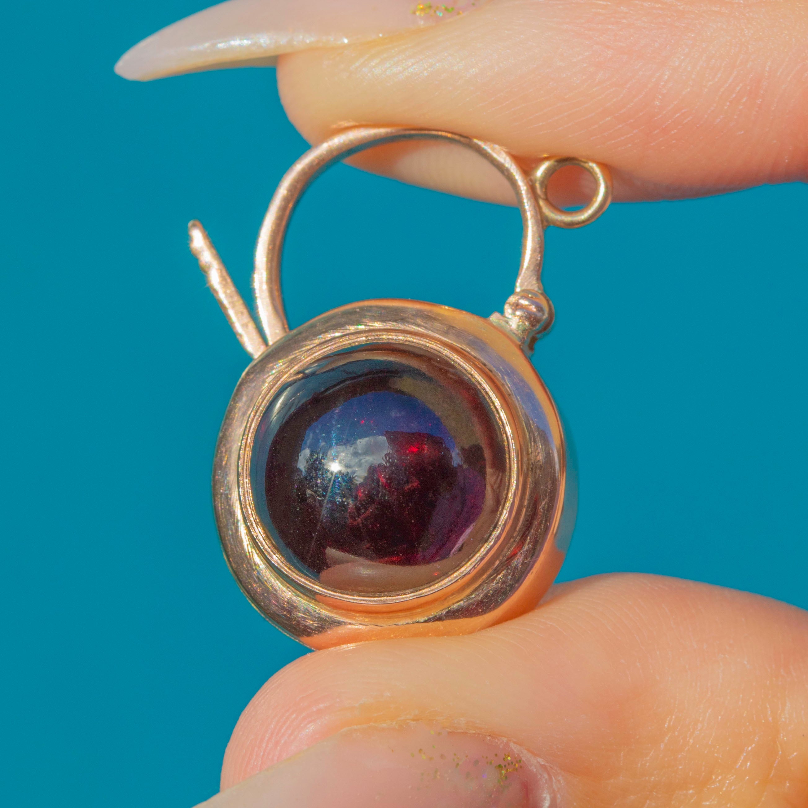 This antique padlock charm is a striking late Victorian treasure, crafted in 9ct rosy Gold and set with a large, glossy cabochon Garnet. The deep crimson gemstone glows beautifully, its domed cut giving it wonderful depth and presence.