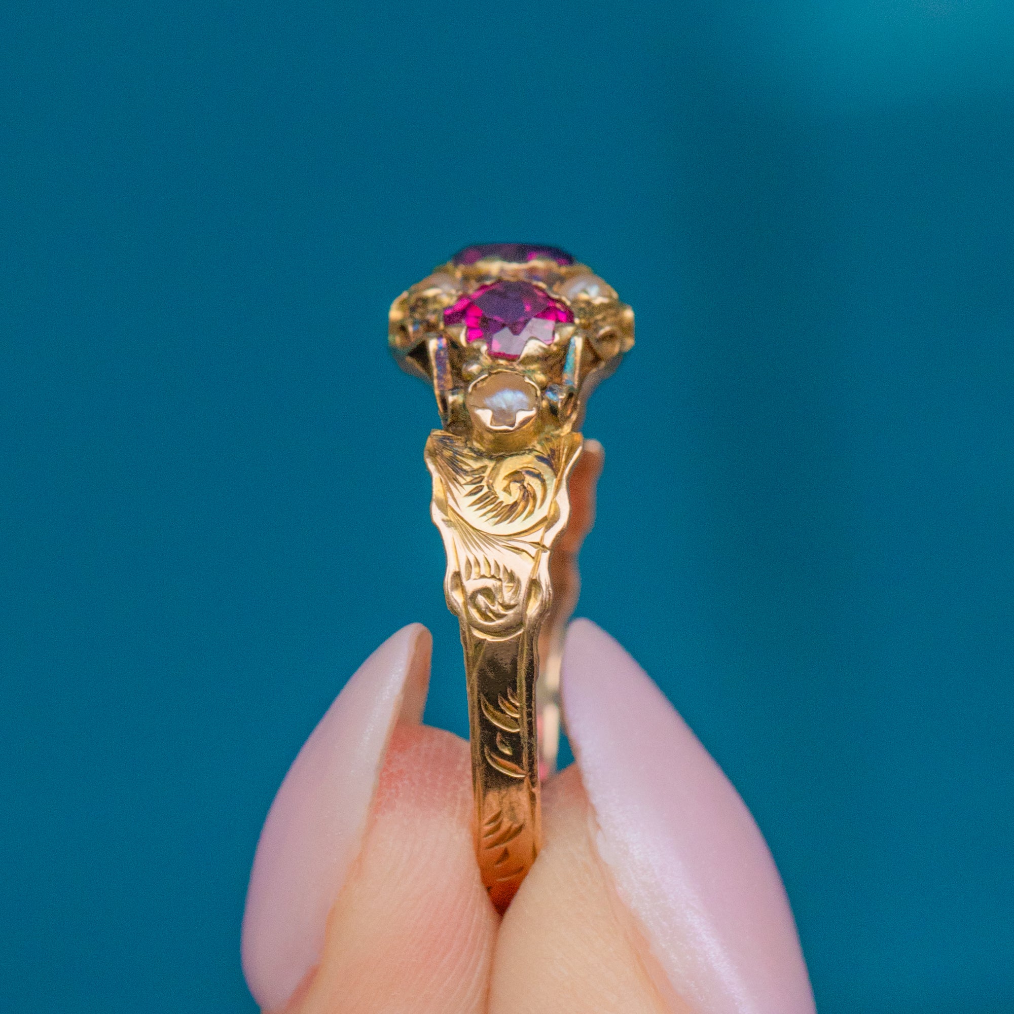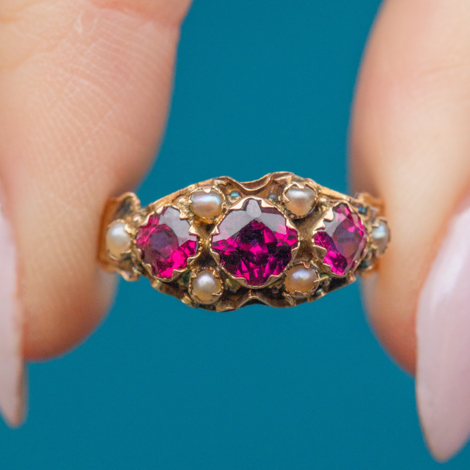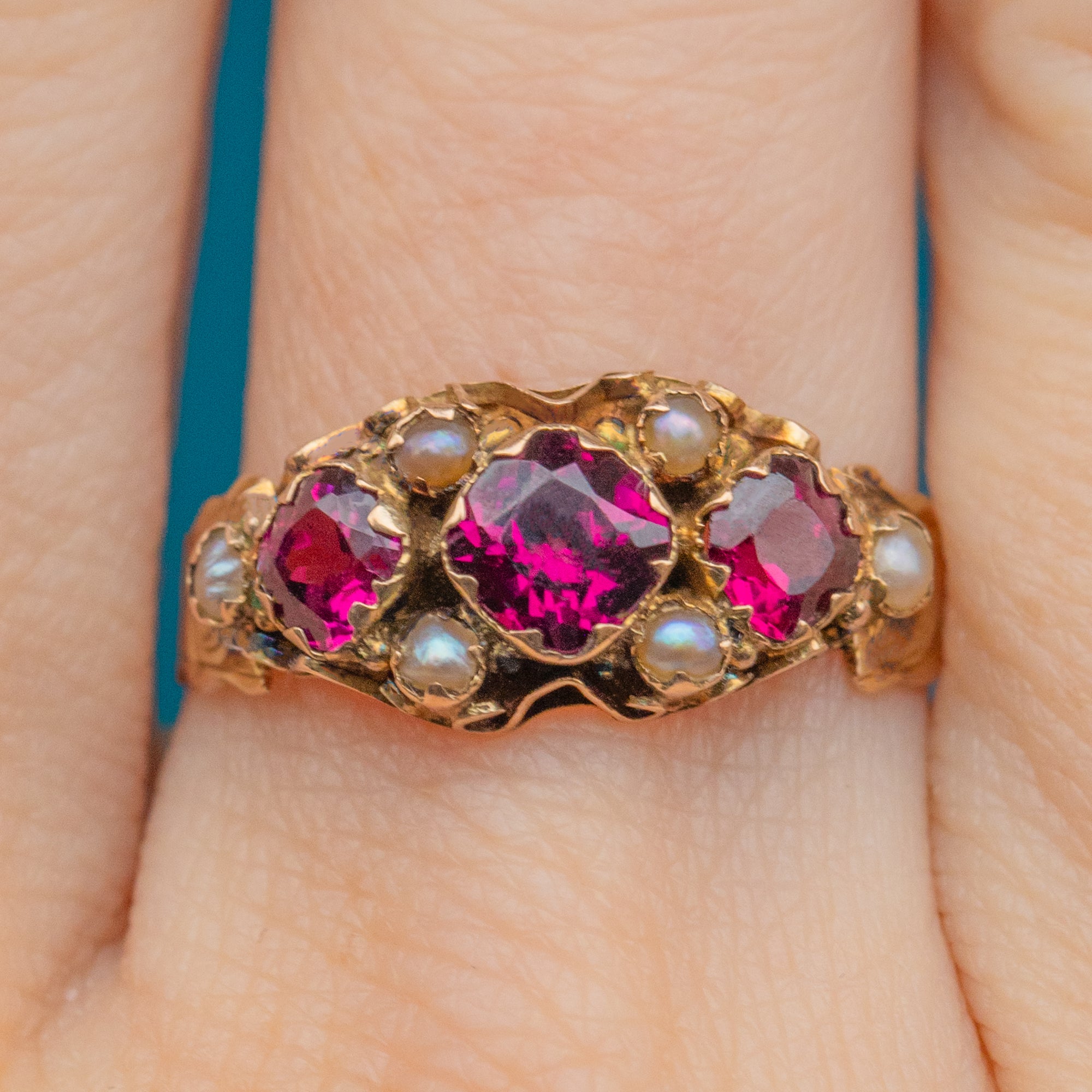 This antique 9ct Gold Garnet Pearl ring is an extraordinary find! Rich with detail, this Victorian ring boasts three Garnets with hot fuchsia flashes, flanked between four shimmering Pearls for a feminine finish.