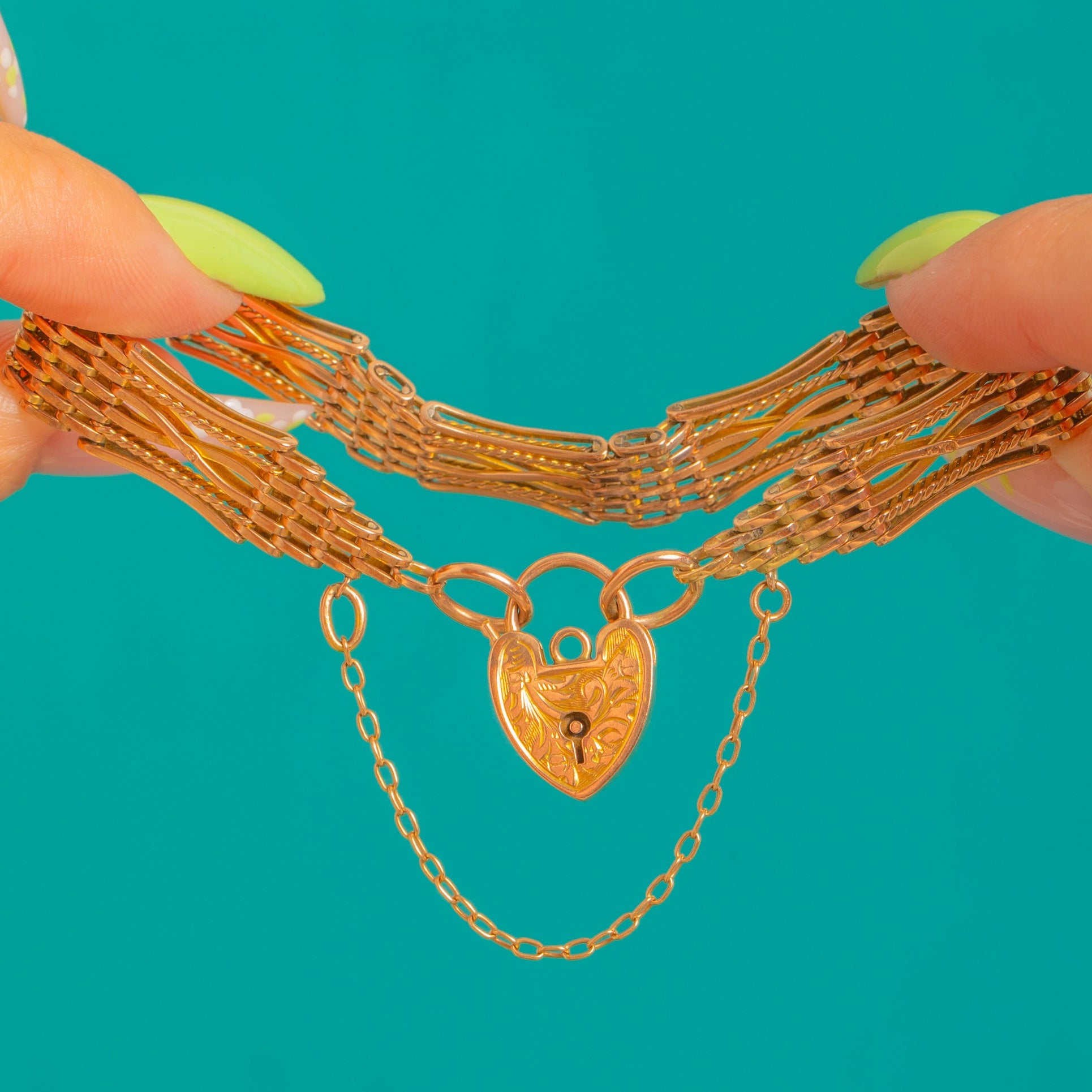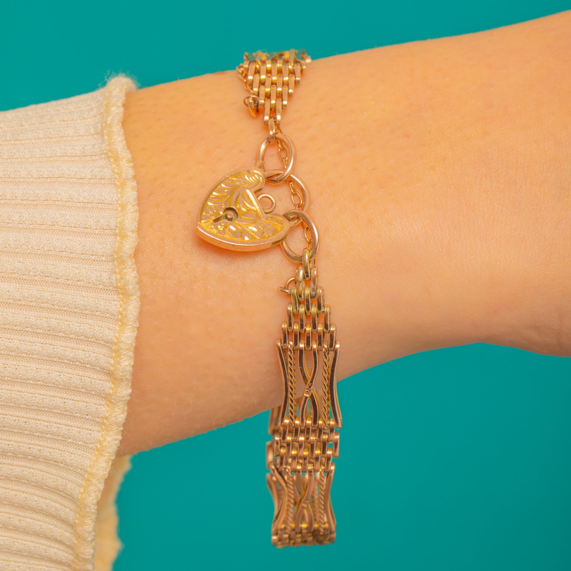 Antique 9ct Gold Gate Bracelet, Engraved Heart Padlock Clasp