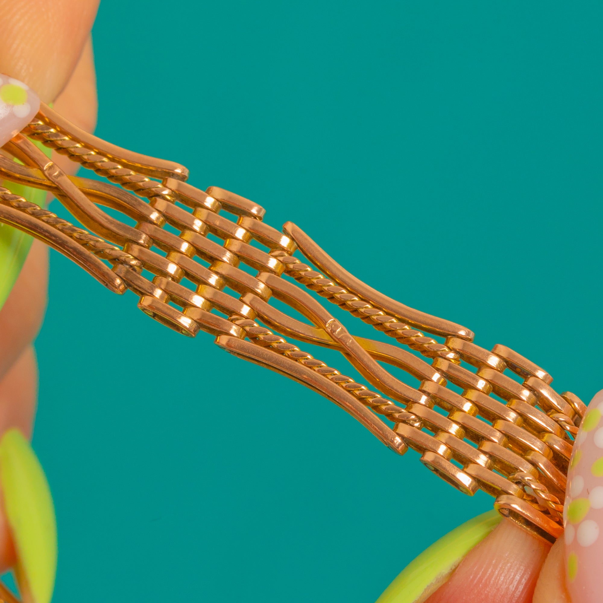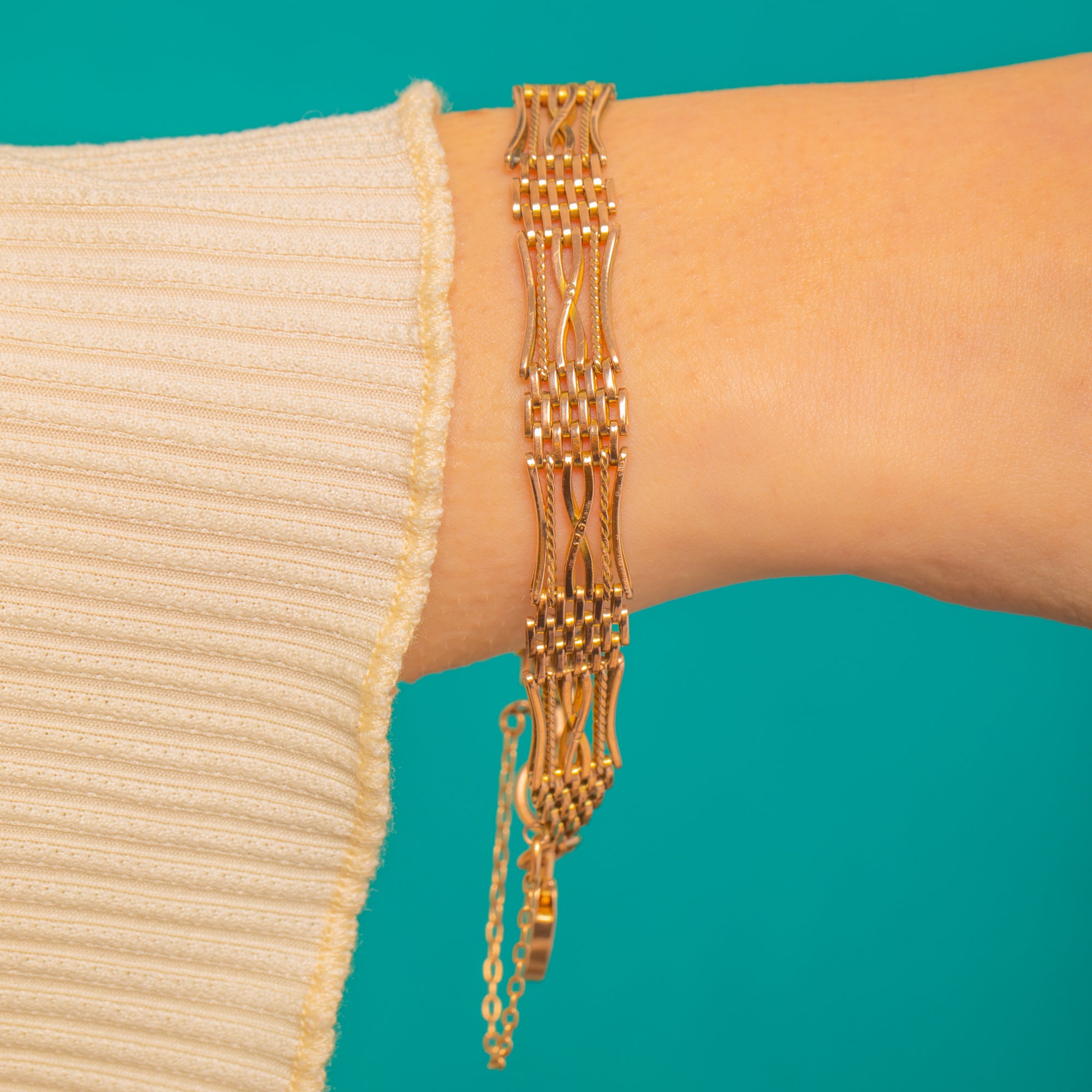 Timeless and wearable, it’s finished with a short safety chain for that quintessential period touch. The warm hue and crisp craftsmanship make it a bracelet you’ll reach for again and again—equally at home layered or worn solo.
