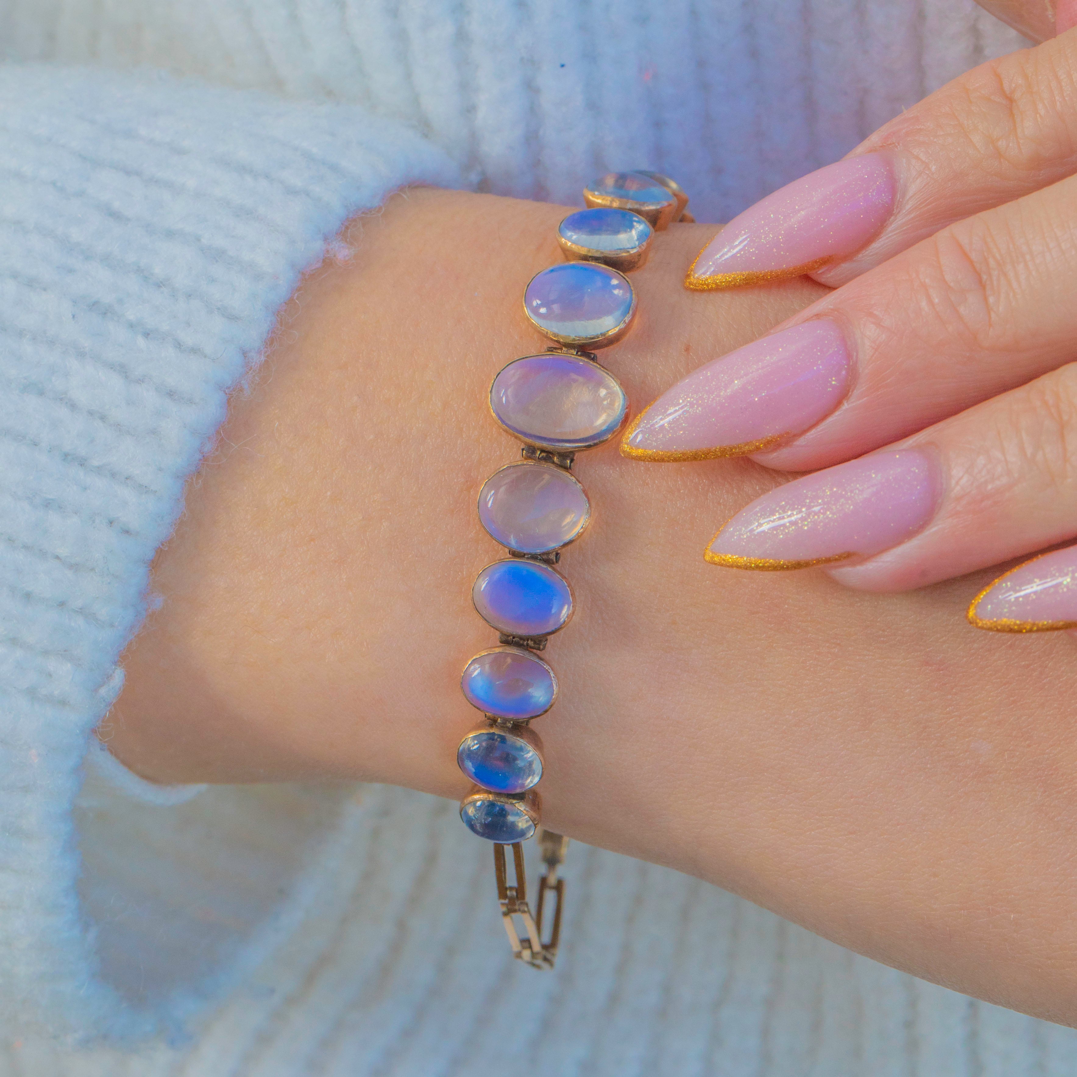 Each Moonstone shows that magical bluish adularescence that Ceylon material is so loved for, shimmering over a soft milky base as the light moves. Crafted in 9ct Gold with a delicate profile and an impressive total carat weight, it’s a classic Art Deco piece that feels both refined and ethereal on the wrist.