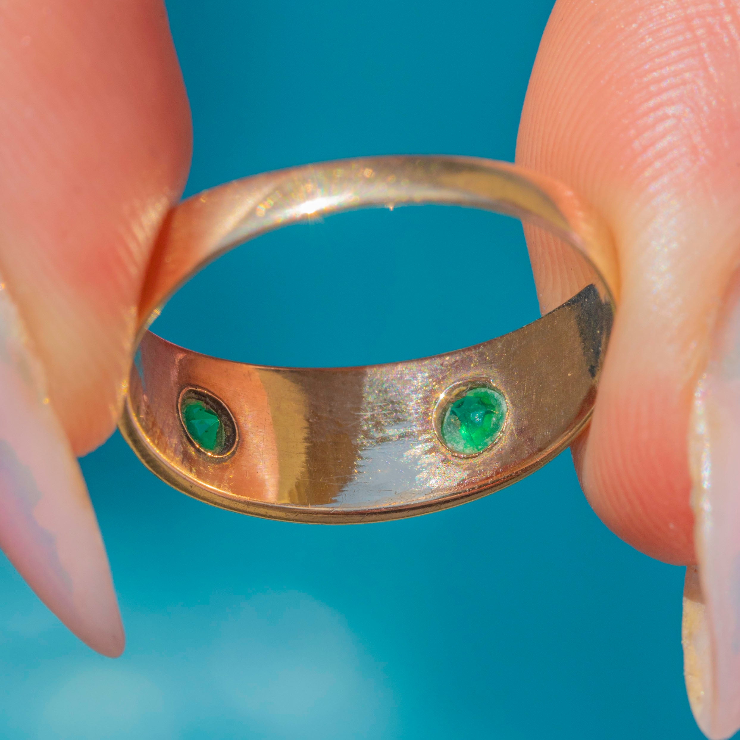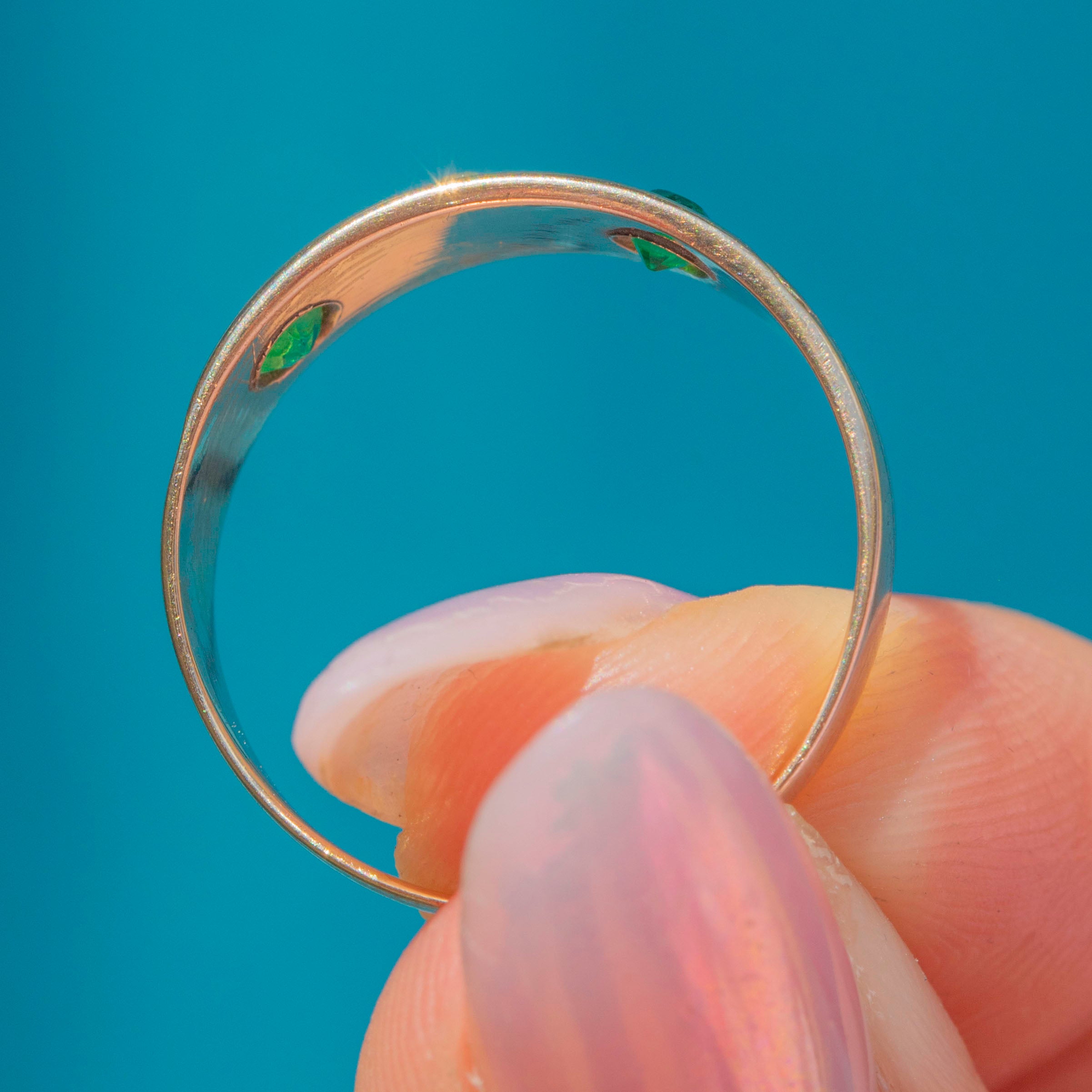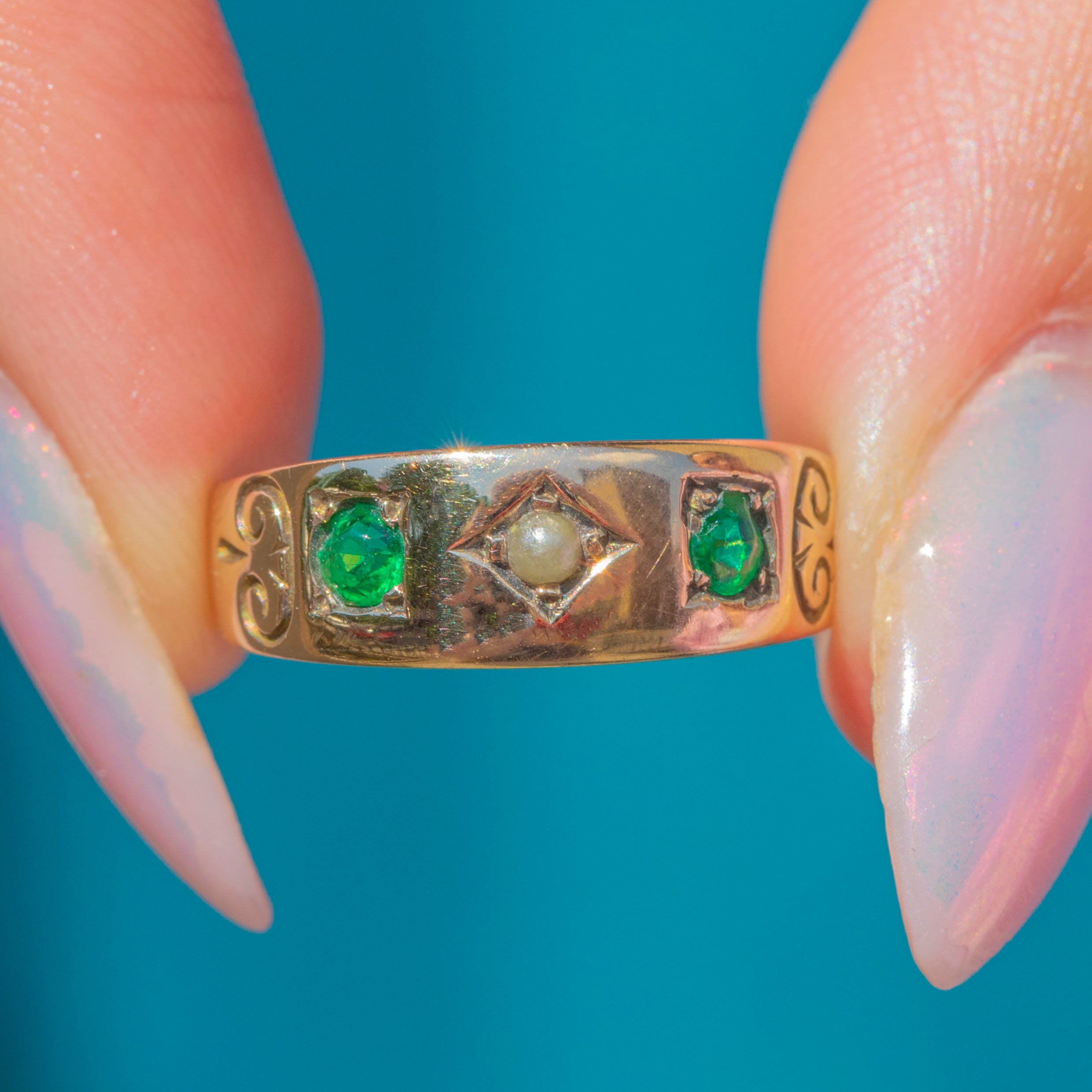 This gorgeous Victorian Gold gypsy ring, inlaid with a dainty Seed Pearl flanked by vibrant green Paste, will bring a fresh pop of colour to your curated ring stack!