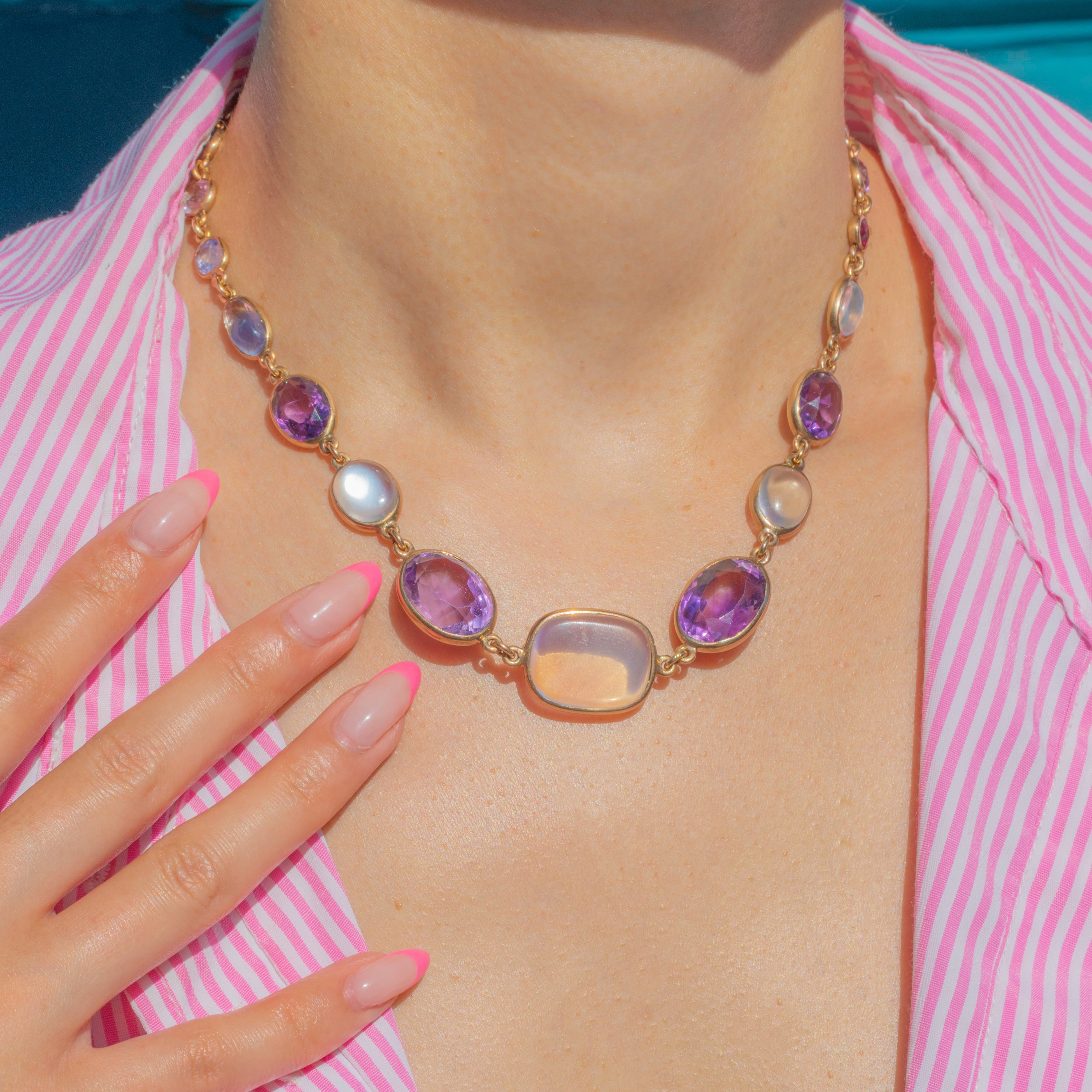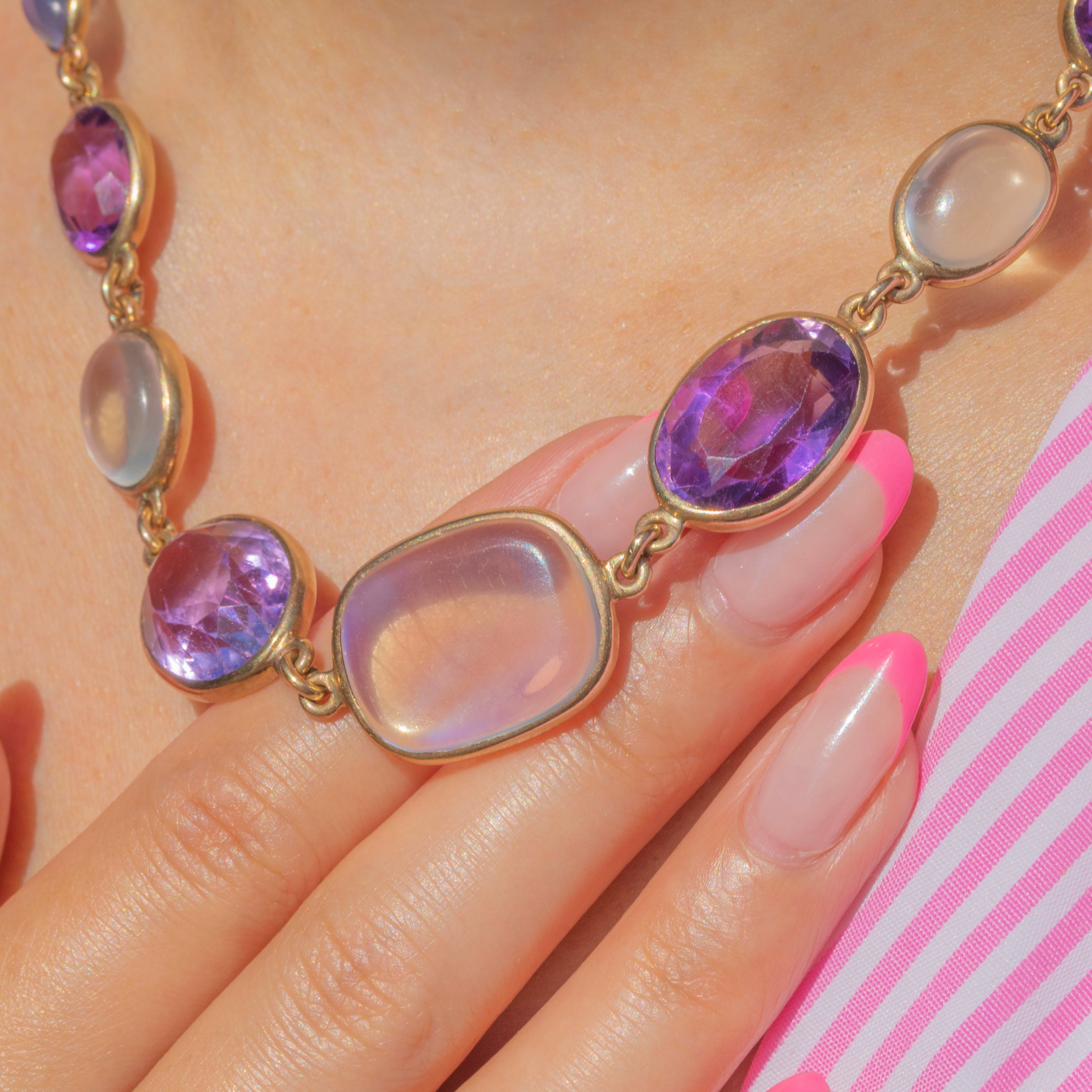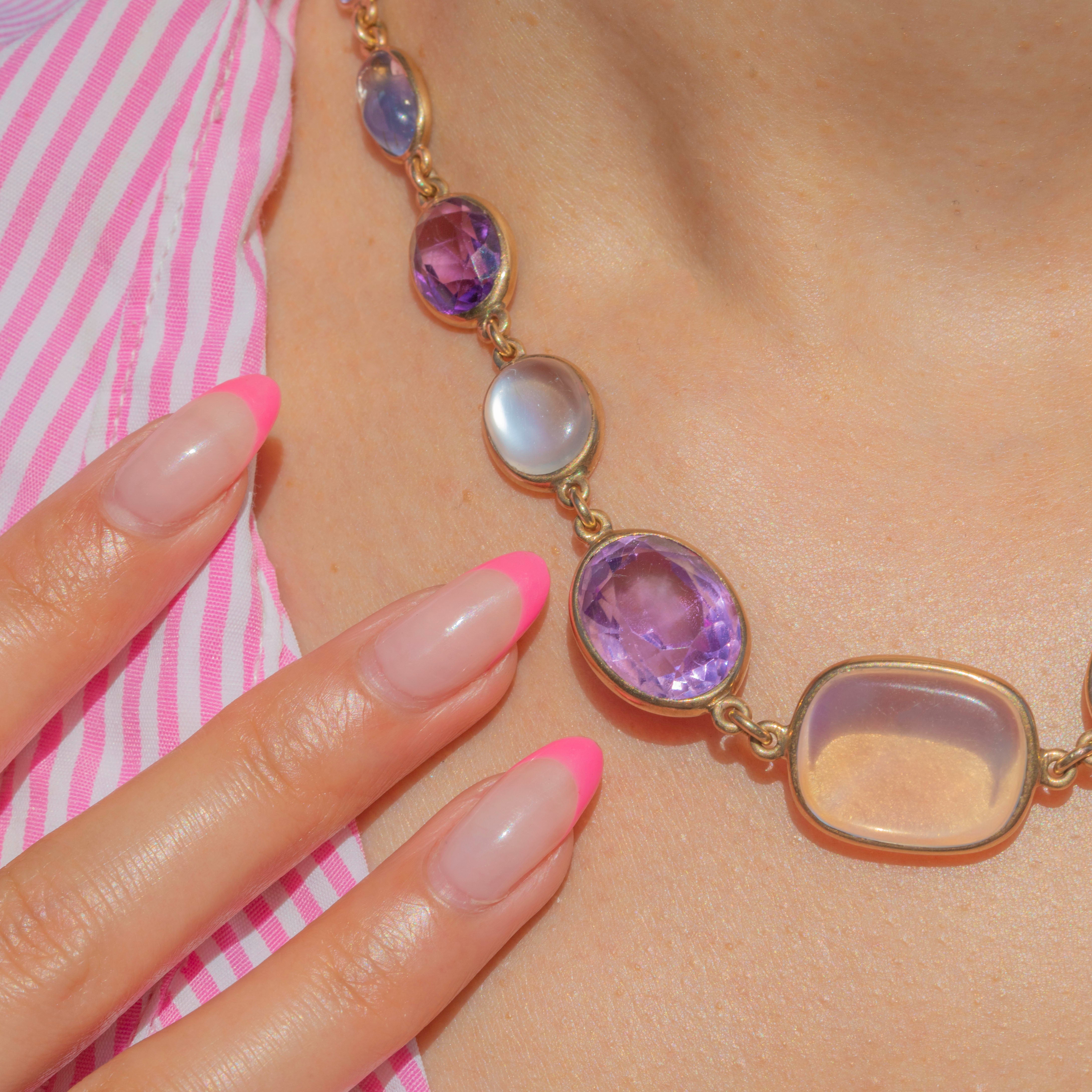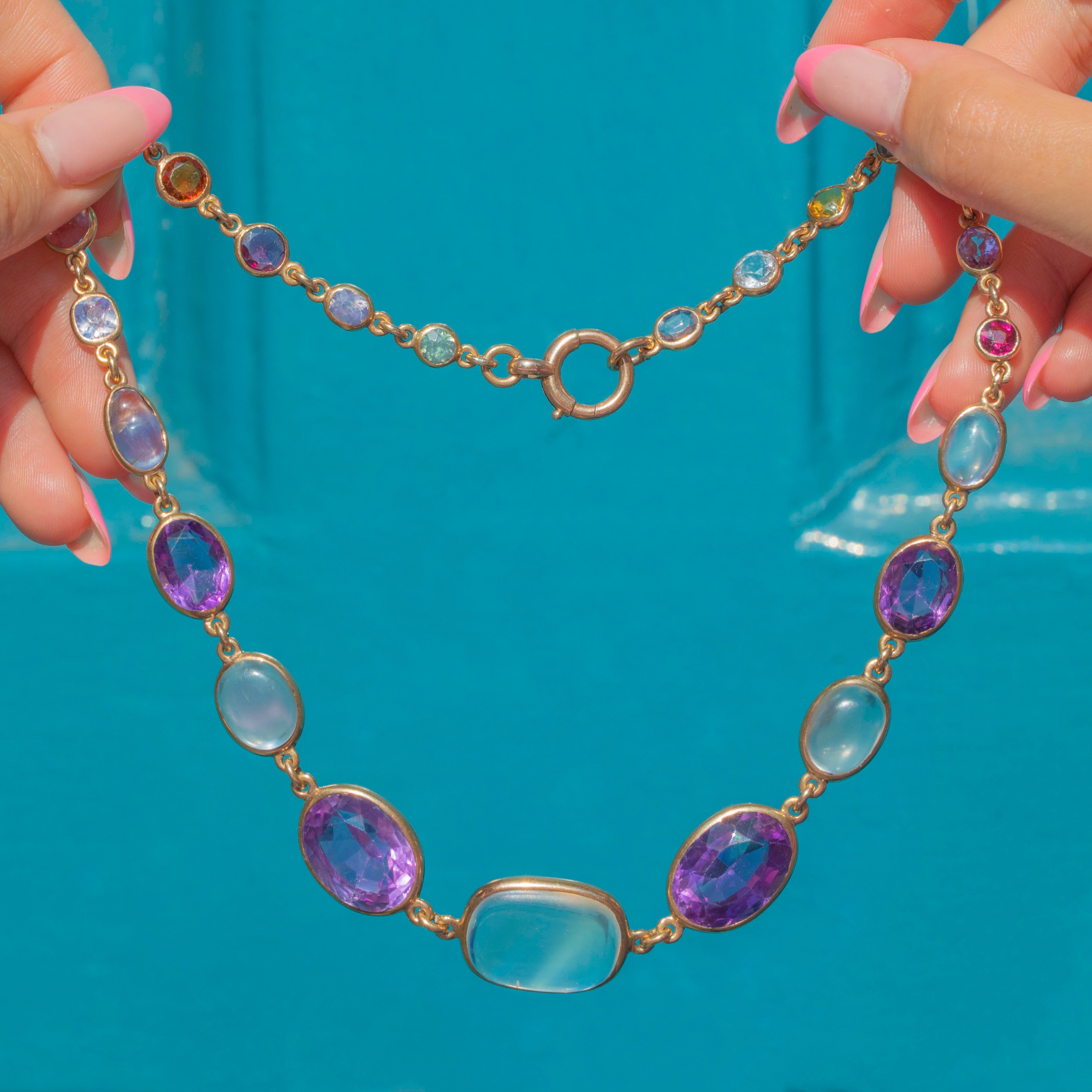 We simply adore this antique 9ct Gold harlequin multigemstone riviere necklace! This gorgeous piece boasts an array of multicoloured gemstones, including adularescent Moonstones, violet Amethysts, Pink Tourmaline and a pale blue Sapphire, to name a few!