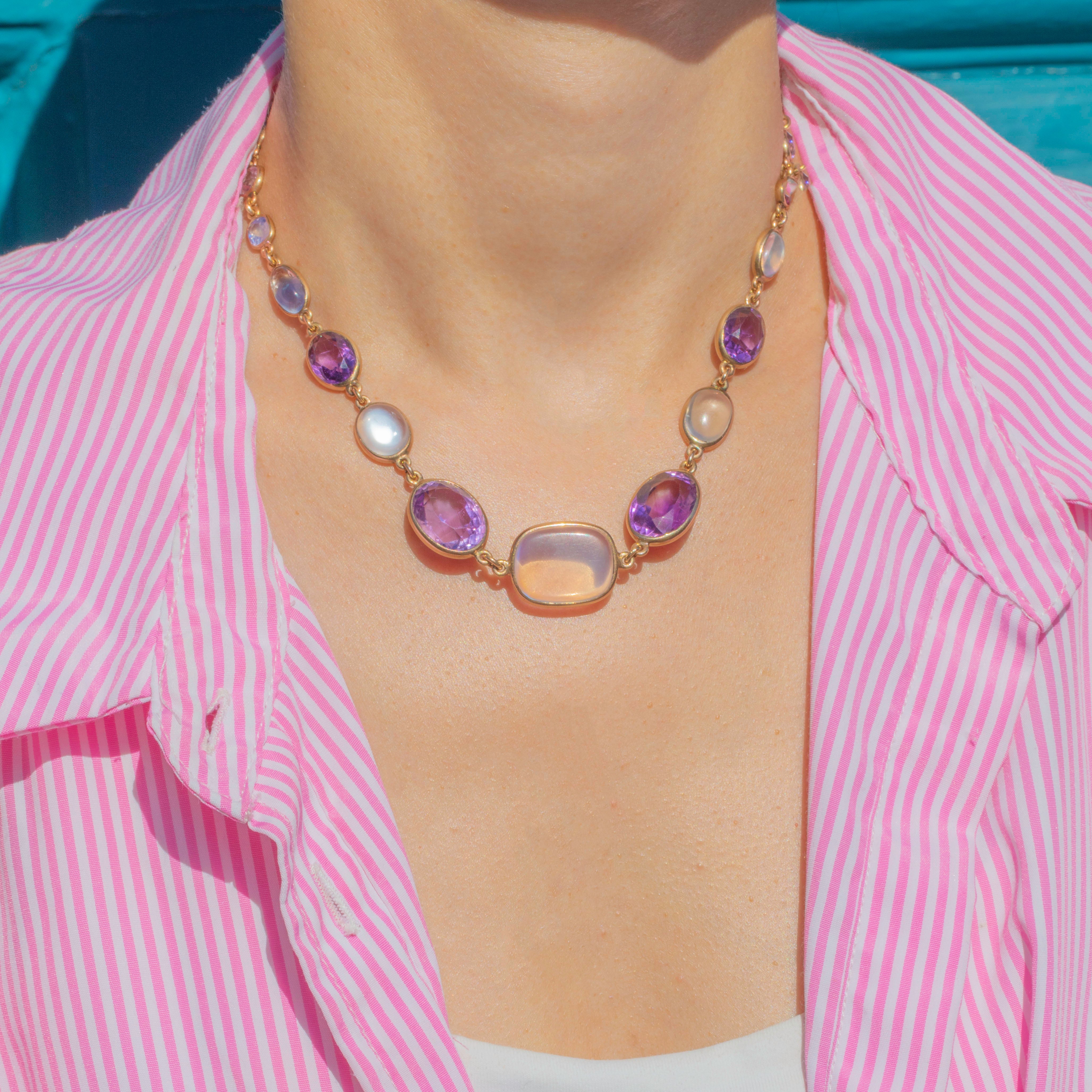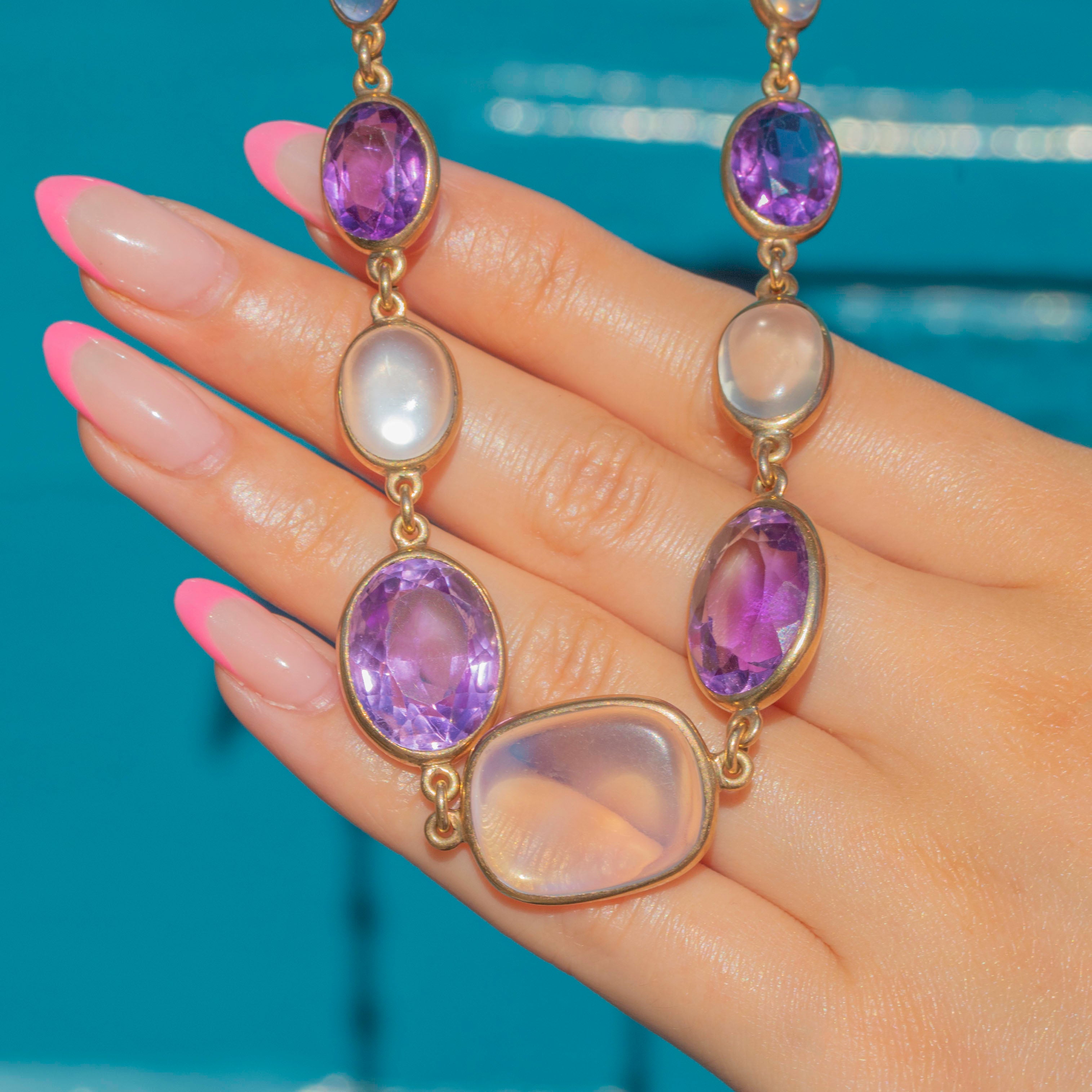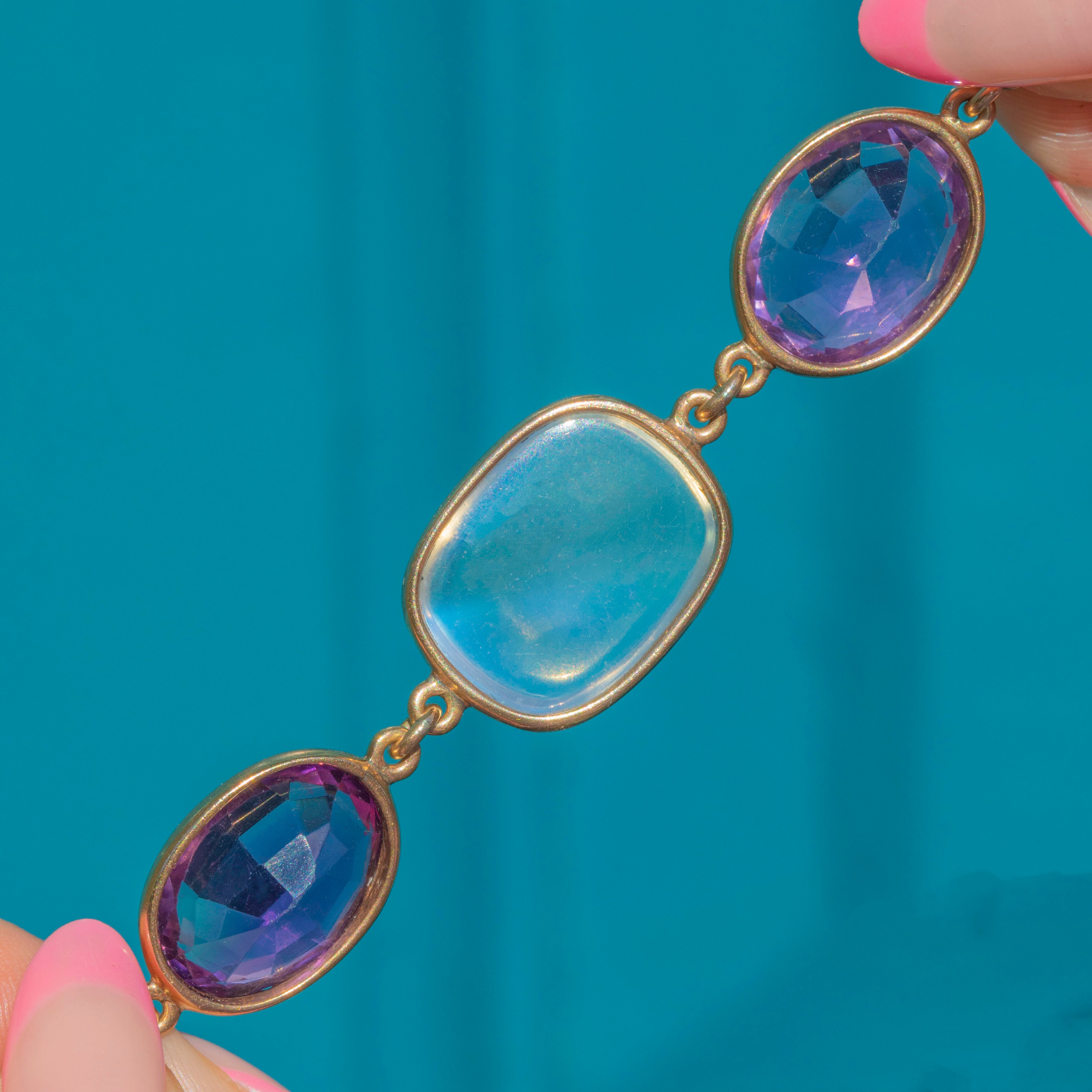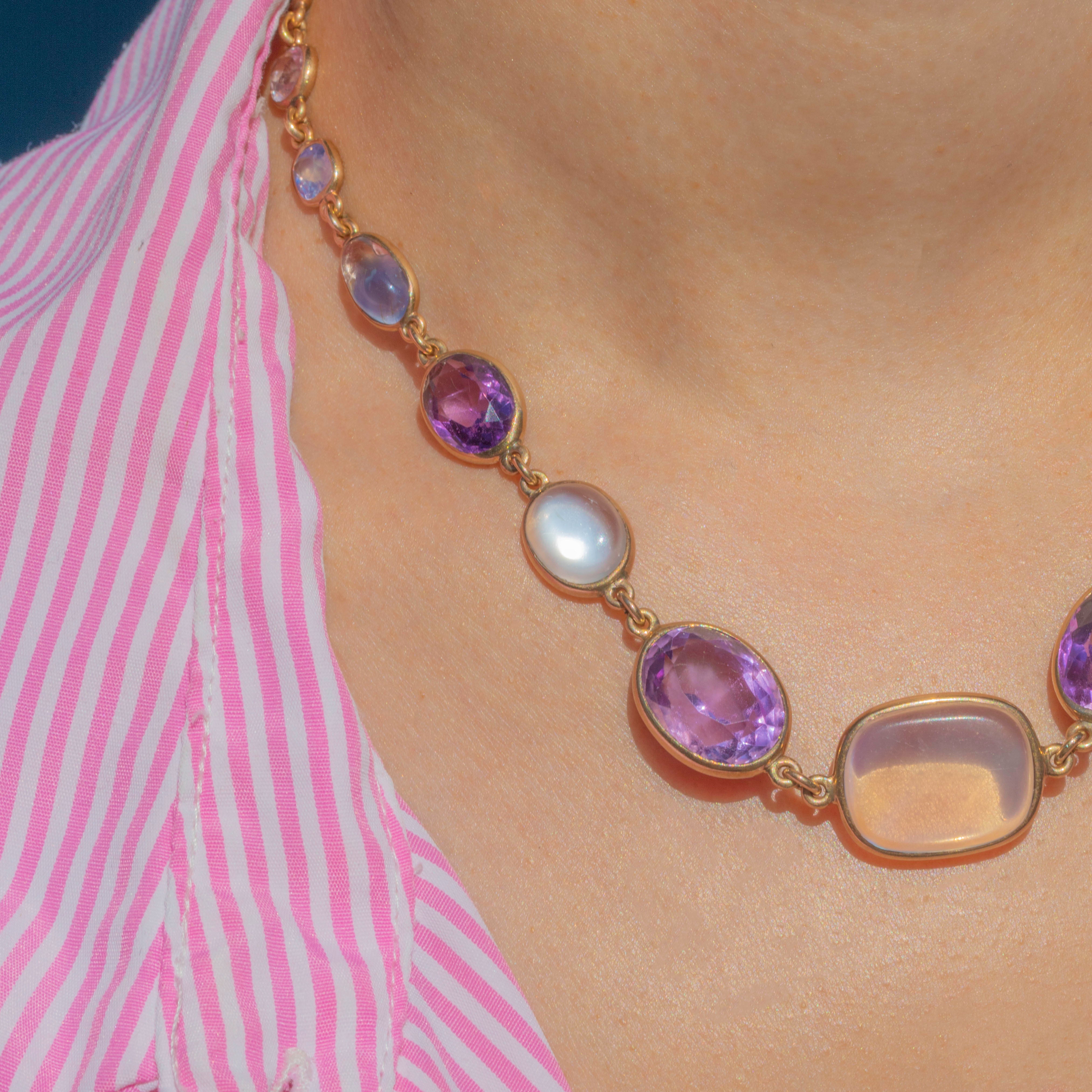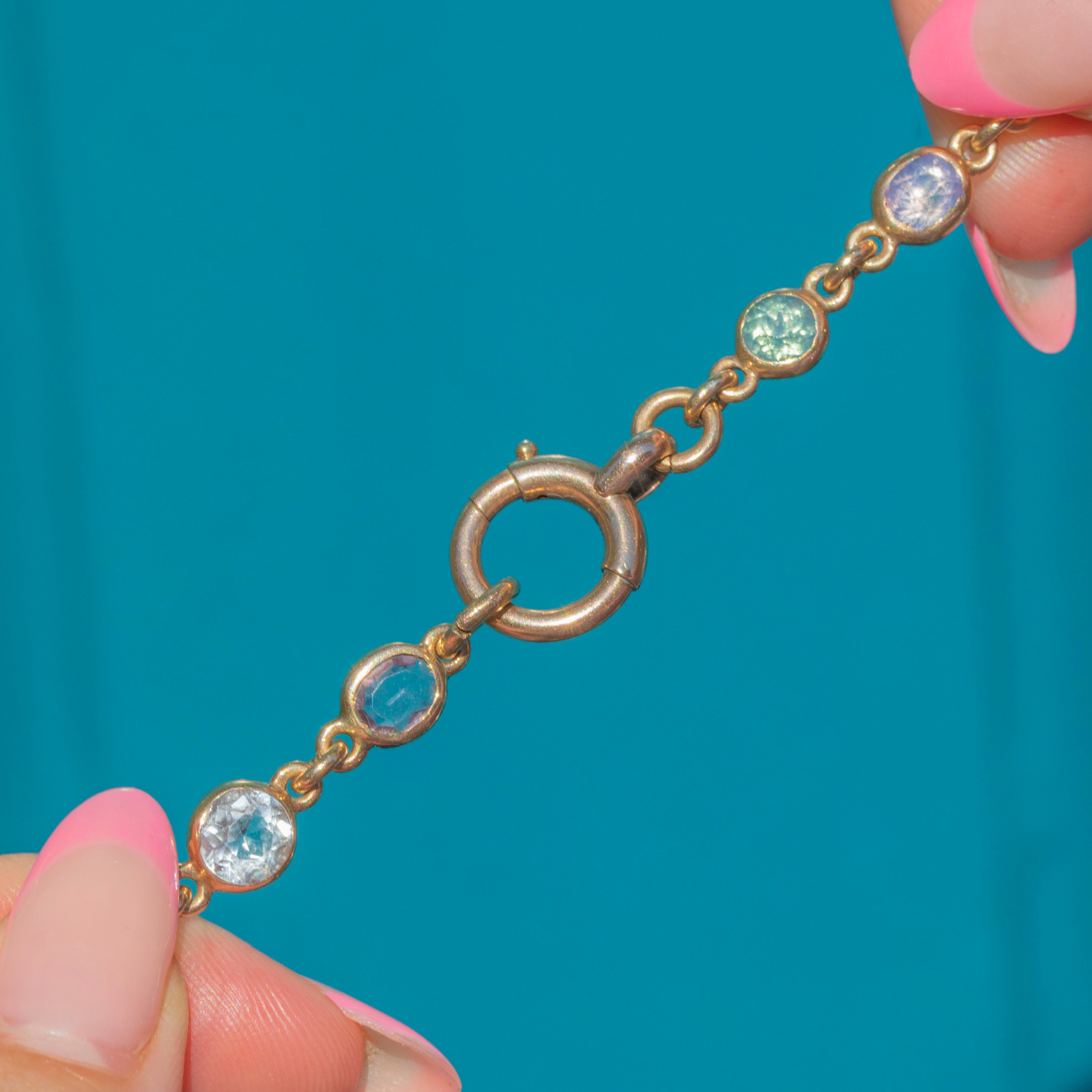 We simply adore this antique 9ct Gold harlequin multigemstone riviere necklace! This gorgeous piece boasts an array of multicoloured gemstones, including adularescent Moonstones, violet Amethysts, Pink Tourmaline and a pale blue Sapphire, to name a few!