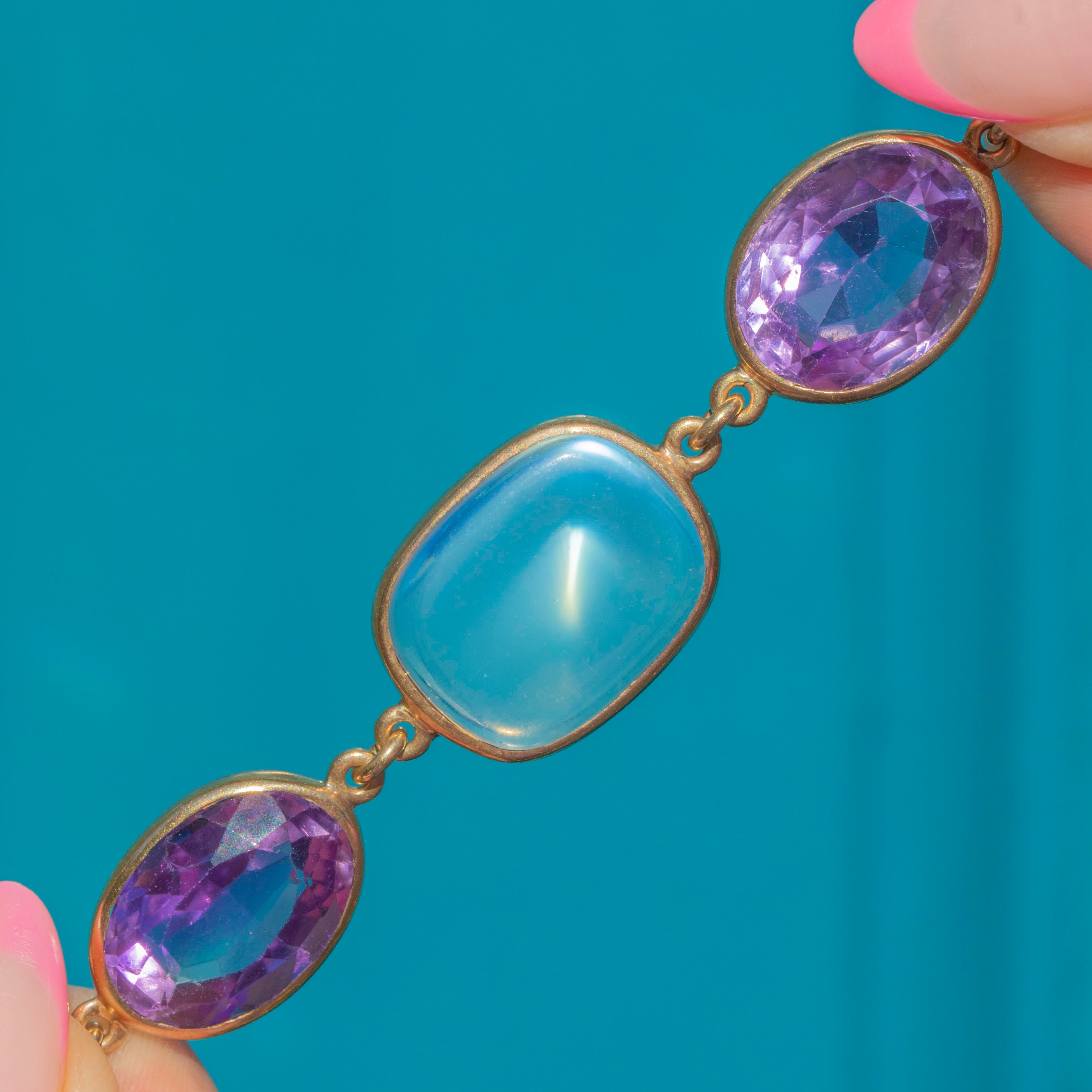 MATERIALS: Tests as 9ct Gold, Ceylon Moonstones, Amethyst, Pink Tourmaline, White Topaz, Blue Aquamarine, Yellow Citrine, Teal Blue Sapphire, Sapphire Cabochon, Lavender Sapphires, Hessonite Garnet, one small Paste gem nearest to bolt ring.