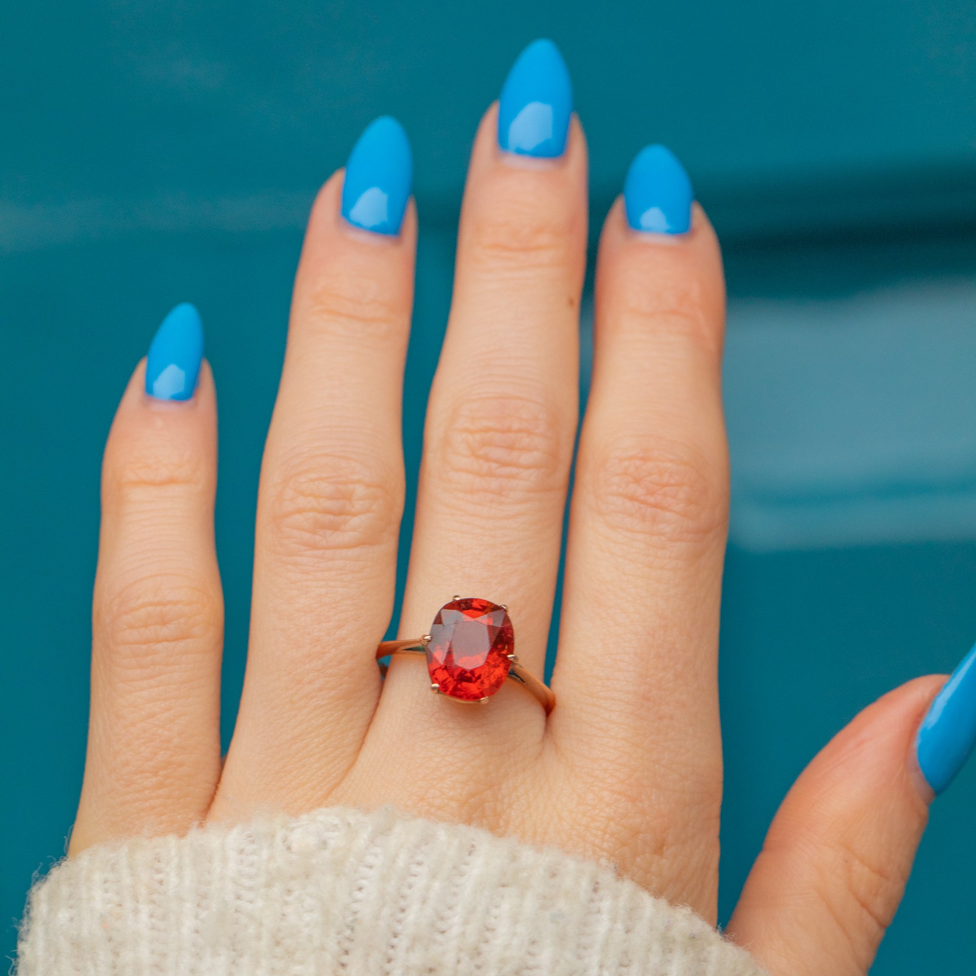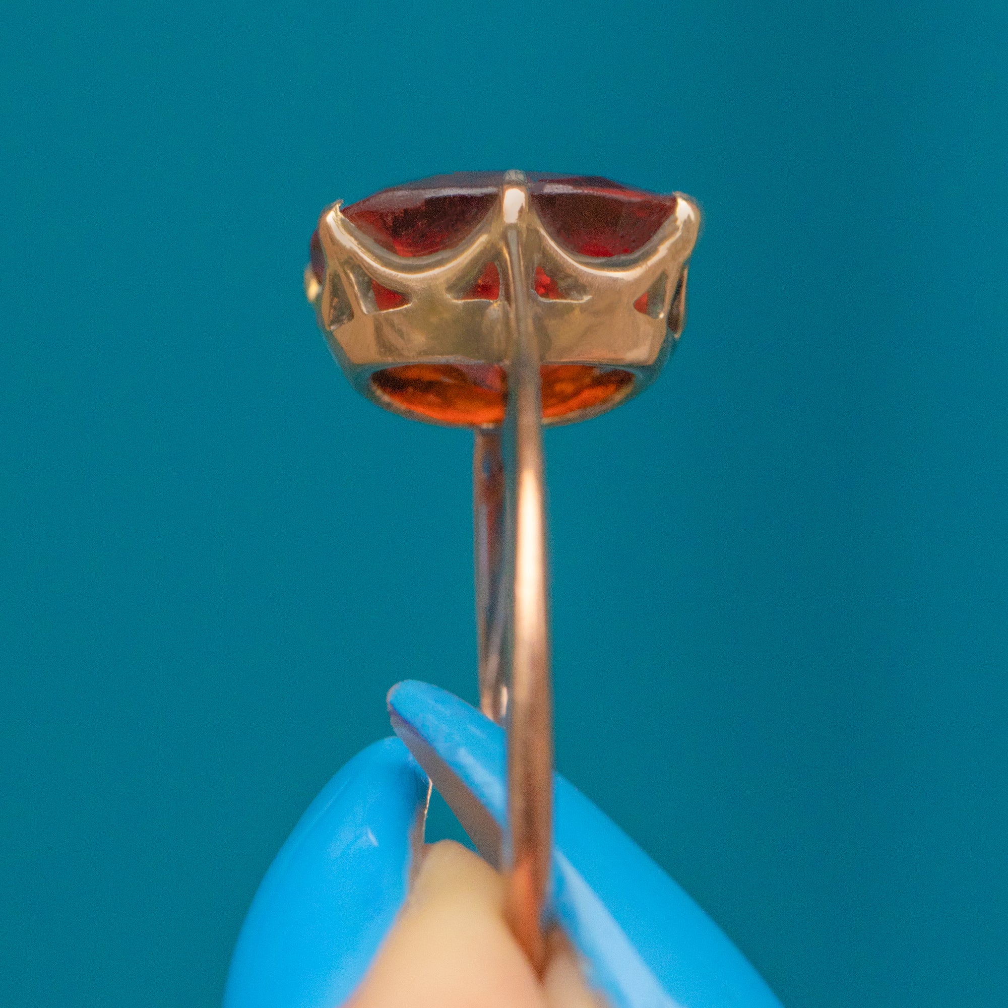 The exquisitely cut 4.70ct Garnet is proudly displayed within a decorative basket, allowing the light to stream through from every angle. With a slender Gold band and elegantly tapered shoulders, this Victorian Garnet ring will bring sophistication to your hand!