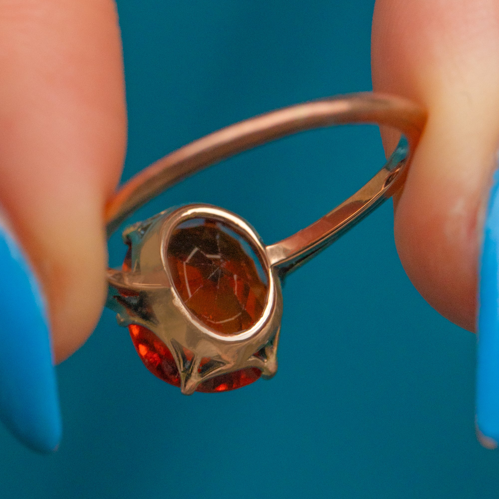 This antique 9ct Gold Hessonite Garnet solitaire ring will instantly seduce you with its bold geometric facets and deep amber hue, revealing flashes of bright crimson as it catches the light.