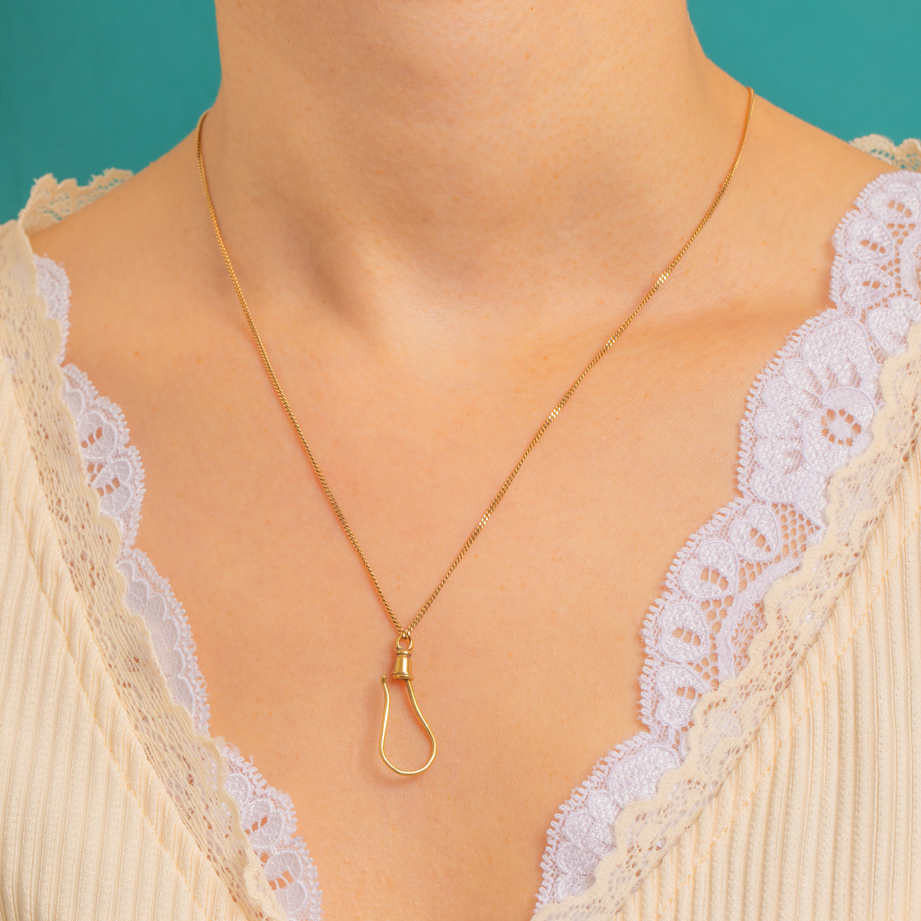 Sleek, sculptural and irresistibly understated, this Victorian 9ct Gold hook pendant distils elegance into a single fluid line. Formed from a slender wire into a graceful teardrop, it’s finished with a petite flared cap and oval jump ring that add a subtle flourish without disturbing the clean silhouette.